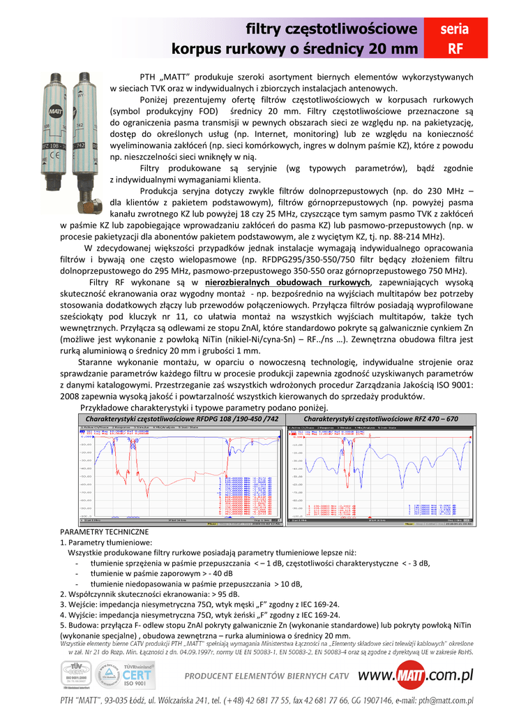 filtry częstotliwościowe korpus rurkowy o średnicy 20 mm seria RF PTH „MATT” produkuje szeroki asortyment biernych elementów wykorzystywanych w sieciach TVK oraz w indywidualnych i zbiorczych instalacjach antenowych. Poniżej prezentujemy ofertę filtrów częstotliwościowych w korpusach rurkowych (symbol produkcyjny FOD) średnicy 20 mm. Filtry częstotliwościowe przeznaczone są do ograniczenia pasma transmisji w pewnych obszarach sieci ze względu np. na pakietyzację, dostęp do określonych usług (np. Internet, monitoring) lub ze względu na konieczność wyeliminowania zakłóceń (np. sieci komórkowych, ingres w dolnym paśmie KZ), które z powodu np. nieszczelności sieci wniknęły w nią. Filtry produkowane są seryjnie (wg typowych parametrów), bądź zgodnie z indywidualnymi wymaganiami klienta. Produkcja seryjna dotyczy zwykle filtrów dolnoprzepustowych (np. do 230 MHz – dla klientów z pakietem podstawowym), filtrów górnoprzepustowych (np. powyżej pasma kanału zwrotnego KZ lub powyżej 18 czy 25 MHz, czyszczące tym samym pasmo TVK z zakłóceń w paśmie KZ lub zapobiegające wprowadzaniu zakłóceń do pasma KZ) lub pasmowo-przepustowych (np. w procesie pakietyzacji dla abonentów pakietem podstawowym, ale z wyciętym KZ, tj. np. 88-214 MHz). W zdecydowanej większości przypadków jednak instalacje wymagają indywidualnego opracowania filtrów i bywają one często wielopasmowe (np. RFDPG295/350-550/750 filtr będący złożeniem filtru dolnoprzepustowego do 295 MHz, pasmowo-przepustowego 350-550 oraz górnoprzepustowego 750 MHz). Filtry RF wykonane są w nierozbieralnych obudowach rurkowych, zapewniających wysoką skuteczność ekranowania oraz wygodny montaż - np. bezpośrednio na wyjściach multitapów bez potrzeby stosowania dodatkowych złączy lub przewodów połączeniowych. Przyłącza filtrów posiadają wyprofilowane sześciokąty pod kluczyk nr 11, co ułatwia montaż na wszystkich wyjściach multitapów, także tych wewnętrznych. Przyłącza są odlewami ze stopu ZnAl, które standardowo pokryte są galwanicznie cynkiem Zn (możliwe jest wykonanie z powłoką NiTin (nikiel-Ni/cyna-Sn) – RF../ns …). Zewnętrzna obudowa filtra jest rurką aluminiową o średnicy 20 mm i grubości 1 mm. Staranne wykonanie montażu, w oparciu o nowoczesną technologię, indywidualne strojenie oraz sprawdzanie parametrów każdego filtru w procesie produkcji zapewnia zgodność uzyskiwanych parametrów z danymi katalogowymi. Przestrzeganie zaś wszystkich wdrożonych procedur Zarządzania Jakością ISO 9001: 2008 zapewnia wysoką jakość i powtarzalność wszystkich kierowanych do sprzedaży produktów. Przykładowe charakterystyki i typowe parametry podano poniżej. Charakterystyki częstotliwościowe RFDPG 108 /190-450 /742 Charakterystyki częstotliwościowe RFZ 470 – 670 PARAMETRY TECHNICZNE 1. Parametry tłumieniowe: Wszystkie produkowane filtry rurkowe posiadają parametry tłumieniowe lepsze niż: - tłumienie sprzężenia w paśmie przepuszczania < – 1 dB, częstotliwości charakterystyczne < - 3 dB, - tłumienie w paśmie zaporowym > - 40 dB - tłumienie niedopasowania w paśmie przepuszczania > 10 dB, 2. Współczynnik skuteczności ekranowania: > 95 dB. 3. Wejście: impedancja niesymetryczna 75Ω, wtyk męski „F” zgodny z IEC 169-24. 4. Wyjście: impedancja niesymetryczna 75Ω, wtyk żeński „F” zgodny z IEC 169-24. 5. Budowa: przyłącza F- odlew stopu ZnAl pokryty galwanicznie Zn (wykonanie standardowe) lub pokryty powłoką NiTin (wykonanie specjalne) , obudowa zewnętrzna – rurka aluminiowa o średnicy 20 mm.