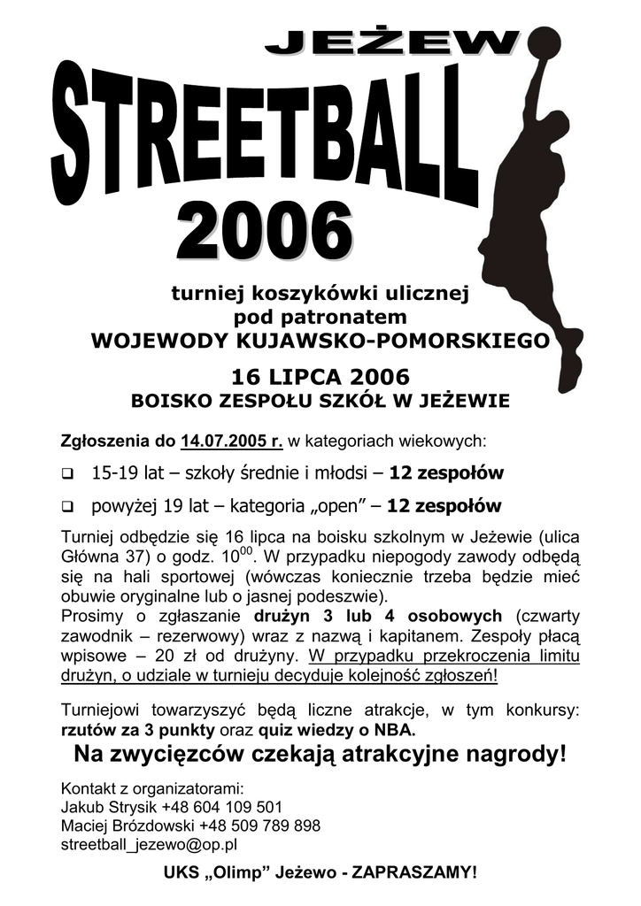 turniej koszykówki ulicznej pod patronatem WOJEWODY KUJAWSKO-POMORSKIEGO 16 LIPCA 2006 BOISKO ZESPOŁU SZKÓŁ W JEśEWIE Zgłoszenia do 14.07.2005 r. w kategoriach wiekowych: 15-19 lat – szkoły średnie i młodsi – 12 zespołów powyŜej 19 lat – kategoria „open” – 12 zespołów Turniej odbędzie się 16 lipca na boisku szkolnym w JeŜewie (ulica Główna 37) o godz. 1000. W przypadku niepogody zawody odbędą się na hali sportowej (wówczas koniecznie trzeba będzie mieć obuwie oryginalne lub o jasnej podeszwie). Prosimy o zgłaszanie druŜyn 3 lub 4 osobowych (czwarty zawodnik – rezerwowy) wraz z nazwą i kapitanem. Zespoły płacą wpisowe – 20 zł od druŜyny. W przypadku przekroczenia limitu druŜyn, o udziale w turnieju decyduje kolejność zgłoszeń! Turniejowi towarzyszyć będą liczne atrakcje, w tym konkursy: rzutów za 3 punkty oraz quiz wiedzy o NBA. Na zwycięzców czekają atrakcyjne nagrody! Kontakt z organizatorami: Jakub Strysik +48 604 109 501 Maciej Brózdowski +48 509 789 898 [email protected] UKS „Olimp” JeŜewo - ZAPRASZAMY!
