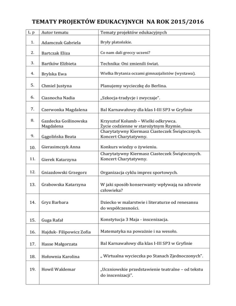 TEMATY PROJEKTÓW EDUKACYJNYCH NA ROK 2015/2016 L. p Autor tematu Tematy projektów edukacyjnych 1. Adamczuk Gabriela Bryły platońskie. 2. Bartczak Eliza Co nam dali greccy uczeni? 3. Bartków Elżbieta Technika: Oni zmienili świat. 4. Brylska Ewa Wielka Brytania oczami gimnazjalistów (wystawa). 5. Chmiel Justyna Planujemy wycieczkę do Berlina. 6. Ciasnocha Nadia „Szkocja-tradycje i zwyczaje”. 7. Czerwonka Magdalena Bal Karnawałowy dla klas I-III SP3 w Gryfinie 8. Gazdecka Goślinowska Magdalena 9. Gągolińska Beata Krzysztof Kolumb – Wielki odkrywca. Życie codzienne w starożytnym Rzymie. Charytatywny Kiermasz Ciasteczek Świątecznych. Koncert Charytatywny. Gierasimczyk Anna Konkurs wiedzy o żywieniu. 11. Gierek Katarzyna Charytatywny Kiermasz Ciasteczek Świątecznych. Koncert Charytatywny. 12. Gniazdowski Grzegorz Organizacja cyklu imprez sportowych. 13. Grabowska Katarzyna W jaki sposób konserwanty wpływają na zdrowie człowieka? 14. Gryz Barbara Dziecko w malarstwie i literaturze od renesansu do współczesności. 15. Guga Rafał Konstytucja 3 Maja - inscenizacja. 16. Hajduk- Filipowicz Zofia Matematyka na poważnie i na wesoło. 17. Hasse Małgorzata Bal Karnawałowy dla klas I-III SP3 w Gryfinie 18. Hołownia Karolina „ Wirtualna wycieczka po Stanach Zjednoczonych”. 19. Howil Waldemar „Uczniowskie przedstawienie teatralne – od tekstu do inscenizacji”. 10. 20. Kaźmierska Lidia 10 ulubionych książek mojego dzieciństwa. 21. Kluza Howil Lila Sławni fizycy. 22. Kokot Elżbieta Twórcy muzyki programowej. 23. Kowalczyk Anita Wpływ diety na stan zdrowia człowieka. 24. Kwiecień Izdebska Monika US PRESIDENTS 25. Ludwiniak Katarzyna Aminokwasy – związki chemiczne budujące białka. 26. Ks. Łącki Piotr „Bierzmowanie-sakrament inicjacji chrześcijańskiej” 27. Martynowicz Aneta „Zero wielkie nic”. 28. Mazur Izabela „Jak brak ruchu wpływa na organizm”. 29. Mikłaszewska Agnieszka Planujemy wycieczkę po Niemczech. 30. Molska Joanna Wirtuozi muzyki klasycznej: wpływ Efekty Mozarta „ na rozwój” człowieka. 31. Morawiak Małgorzata Festiwal Twórczości Artystycznej – FETA. 32. Mysiak Marzanna Jak tworzymy prasę lokalną na przykładzie gryfińskich gazet. 33. Myszka Wiesława Koncert Charytatywny. 34. Oleszczyszyn Czesław Realizacja filmu dokumentalnego Magia Fety – historia festiwalu. 35. Pankowska Anna Poznaję profile zawodowe. 36. Pawłowski Piotr Organizacja cyklu imprez sportowych. 37. Pilecka Doroszko Wioleta Historia i sztuka origami. 38. Pietrasz Małgorzata 39. Piznal Maria Polscy Nobliści. 40. Ptaszek Magdalena „ Sławni Chemicy ”. 41. Romanowska Anna „ Sztuka ulicy ”. 42. Sendyk Ewa „Zaproszenie do poezji”. 43. Stasiak Elżbieta Fotografie –złota Polska Jesień. 44. Stawowski Marek Ptaki w Gryfinie i okolicach. 45. Stefańska Małgorzata Konkurs Wiedzy Olimpijskiej „ Na Olimpijskim Szlaku”. 46. Stołecka Joanna Najpiękniejsze miasto w Niemczech. 47. Strzelec Justyna Badanie rzeki Regalicy. 48. Stypczyńska Elżbieta Wycieczka po krajach anglojęzycznych. 49. Tarczyńska Małgorzata „Germanizmy we współczesnej polszczyźnie”. 50. Ulanowski Dariusz Obserwacje meteorologiczne i ich analiza. 51. Urbańska Anna Co zawdzięczamy starożytnym Grekom. 52. Wawruszczak Elżbieta Jeden dzień z fizyką – wybrane zjawiska fizyczne obserwowane w ciągu dnia. 53. Wożniak Szymańska Iwona „ Życie i twórczość wybranych pisarzy polskich”. 54. Zalewska Ewa Wielcy matematycy. 55. Zarębska Agnieszka Tematyczna gazetka sportowa. 56. Zielińska Małgorzata Sport w krajach niemieckojęzycznych. 57. Żołnowski Dariusz Organizacja cyklu imprez sportowych.