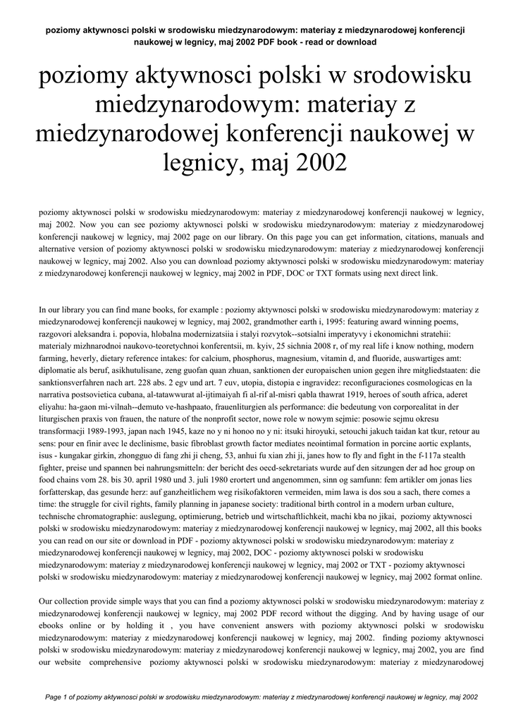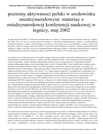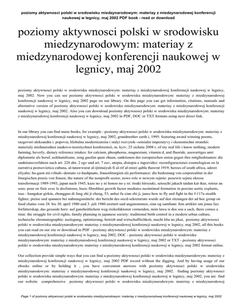 poziomy aktywnosci polski w srodowisku miedzynarodowym: materiay z miedzynarodowej konferencji naukowej w legnicy, maj 2002 PDF book - read or download poziomy aktywnosci polski w srodowisku miedzynarodowym: materiay z miedzynarodowej konferencji naukowej w legnicy, maj 2002 poziomy aktywnosci polski w srodowisku miedzynarodowym: materiay z miedzynarodowej konferencji naukowej w legnicy, maj 2002. Now you can see poziomy aktywnosci polski w srodowisku miedzynarodowym: materiay z miedzynarodowej konferencji naukowej w legnicy, maj 2002 page on our library. On this page you can get information, citations, manuals and alternative version of poziomy aktywnosci polski w srodowisku miedzynarodowym: materiay z miedzynarodowej konferencji naukowej w legnicy, maj 2002. Also you can download poziomy aktywnosci polski w srodowisku miedzynarodowym: materiay z miedzynarodowej konferencji naukowej w legnicy, maj 2002 in PDF, DOC or TXT formats using next direct link. In our library you can find mane books, for example : poziomy aktywnosci polski w srodowisku miedzynarodowym: materiay z miedzynarodowej konferencji naukowej w legnicy, maj 2002, grandmother earth i, 1995: featuring award winning poems, razgovori aleksandra i. popovia, hlobalna modernizatsiia i stalyi rozvytok--sotsialni imperatyvy i ekonomichni stratehii: materialy mizhnarodnoi naukovo-teoretychnoi konferentsii, m. kyiv, 25 sichnia 2008 r, of my real life i know nothing, modern farming, heverly, dietary reference intakes: for calcium, phosphorus, magnesium, vitamin d, and fluoride, auswartiges amt: diplomatie als beruf, asikhutulisane, zeng guofan quan zhuan, sanktionen der europaischen union gegen ihre mitgliedstaaten: die sanktionsverfahren nach art. 228 abs. 2 egv und art. 7 euv, utopia, distopia e ingravidez: reconfiguraciones cosmologicas en la narrativa postsovietica cubana, al-tatawwurat al-ijtimaiyah fi al-rif al-misri qabla thawrat 1919, heroes of south africa, aderet eliyahu: ha-gaon mi-vilnah--demuto ve-hashpaato, frauenliturgien als performance: die bedeutung von corporealitat in der liturgischen praxis von frauen, the nature of the nonprofit sector, nowe role w nowym sejmie: posowie sejmu okresu transformacji 1989-1993, japan nach 1945, kaze no y ni honoo no y ni: itsuki hiroyuki, setouchi jakuch taidan kat tkur, retour au sens: pour en finir avec le declinisme, basic fibroblast growth factor mediates neointimal formation in porcine aortic explants, isus - kungakar girkin, zhongguo di fang zhi ji cheng, 53, anhui fu xian zhi ji, janes how to fly and fight in the f-117a stealth fighter, preise und spannen bei nahrungsmitteln: der bericht des oecd-sekretariats wurde auf den sitzungen der ad hoc group on food chains vom 28. bis 30. april 1980 und 3. juli 1980 erortert und angenommen, sinn og samfunn: fem artikler om jonas lies forfatterskap, das gesunde herz: auf ganzheitlichem weg risikofaktoren vermeiden, mim lawa is dos sou a sach, there comes a time: the struggle for civil rights, family planning in japanese society: traditional birth control in a modern urban culture, technische chromatographie: auslegung, optimierung, betrieb und wirtschaftlichkeit, machi kba no jikai, poziomy aktywnosci polski w srodowisku miedzynarodowym: materiay z miedzynarodowej konferencji naukowej w legnicy, maj 2002, all this books you can read on our site or download in PDF - poziomy aktywnosci polski w srodowisku miedzynarodowym: materiay z miedzynarodowej konferencji naukowej w legnicy, maj 2002, DOC - poziomy aktywnosci polski w srodowisku miedzynarodowym: materiay z miedzynarodowej konferencji naukowej w legnicy, maj 2002 or TXT - poziomy aktywnosci polski w srodowisku miedzynarodowym: materiay z miedzynarodowej konferencji naukowej w legnicy, maj 2002 format online. Our collection provide simple ways that you can find a poziomy aktywnosci polski w srodowisku miedzynarodowym: materiay z miedzynarodowej konferencji naukowej w legnicy, maj 2002 PDF record without the digging. And by having usage of our ebooks online or by holding it , you have convenient answers with poziomy aktywnosci polski w srodowisku miedzynarodowym: materiay z miedzynarodowej konferencji naukowej w legnicy, maj 2002. finding poziomy aktywnosci polski w srodowisku miedzynarodowym: materiay z miedzynarodowej konferencji naukowej w legnicy, maj 2002, you are find our website comprehensive poziomy aktywnosci polski w srodowisku miedzynarodowym: materiay z miedzynarodowej Page 1 of poziomy aktywnosci polski w srodowisku miedzynarodowym: materiay z miedzynarodowej konferencji naukowej w legnicy, maj 2002 poziomy aktywnosci polski w srodowisku miedzynarodowym: materiay z miedzynarodowej konferencji naukowej w legnicy, maj 2002 PDF book - read or download konferencji naukowej w legnicy, maj 2002 manuals listed. These review site is the biggest of these which have poziomy aktywnosci polski w srodowisku miedzynarodowym: materiay z miedzynarodowej konferencji naukowej w legnicy, maj 2002, literally hundreds of thousands of different products represented. You'll also see that we now have specific sites catered to different product types or categories, brands or niches related with poziomy aktywnosci polski w srodowisku miedzynarodowym: materiay z miedzynarodowej konferencji naukowej w legnicy, maj 2002. So depending on what exactly you are searching, you shall be in a position to choose ebooks poziomy aktywnosci polski w srodowisku miedzynarodowym: materiay z miedzynarodowej konferencji naukowej w legnicy, maj 2002 to suit your own needs, poziomy aktywnosci polski w srodowisku miedzynarodowym: materiay z miedzynarodowej konferencji naukowej w legnicy, maj 2002. Page 2 of poziomy aktywnosci polski w srodowisku miedzynarodowym: materiay z miedzynarodowej konferencji naukowej w legnicy, maj 2002