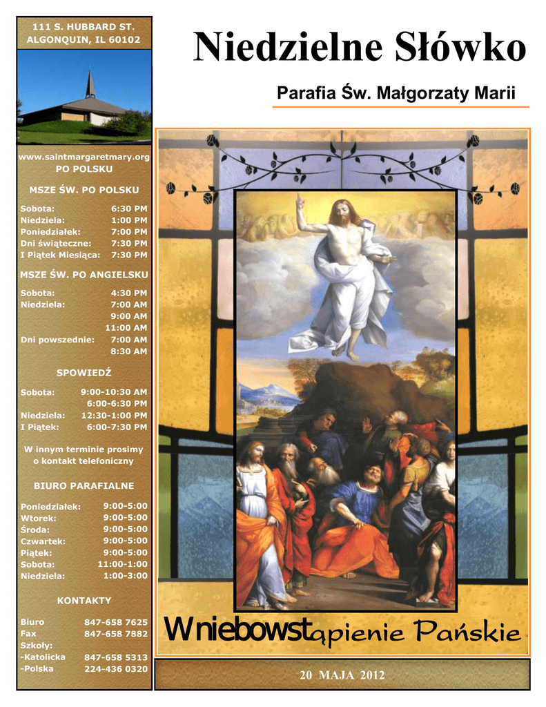 111 S. HUBBARD ST. ALGONQUIN, IL 60102 Niedzielne Słówko Parafia Św. Małgorzaty Marii www.saintmargaretmary.org PO POLSKU MSZE ŚW. PO POLSKU Sobota: Niedziela: Poniedziałek: Dni świąteczne: I Piątek Miesiąca: 6:30 1:00 7:00 7:30 7:30 PM PM PM PM PM MSZE ŚW. PO ANGIELSKU Sobota: Niedziela: Dni powszednie: 4:30 7:00 9:00 11:00 7:00 8:30 PM AM AM AM AM AM SPOWIEDŹ Sobota: Niedziela: I Piątek: 9:00-10:30 AM 6:00-6:30 PM 12:30-1:00 PM 6:00-7:30 PM W innym terminie prosimy o kontakt telefoniczny BIURO PARAFIALNE Poniedziałek: Wtorek: Środa: Czwartek: Piątek: Sobota: Niedziela: 9:00-5:00 9:00-5:00 9:00-5:00 9:00-5:00 9:00-5:00 11:00-1:00 1:00-3:00 KONTAKTY Biuro Fax Szkoły: -Katolicka -Polska 847-658 7625 847-658 7882 847-658 5313 224-436 0320 Wniebowstąpienie Pańskie 20 MAJA 2012 Niedzielne Słówko Od Proboszcza “ Mężowie z Galilei, dlaczego stoicie i wpatrujecie się w niebo?” Kochani Stara legenda opowiada o dwóch mnichach, którzy wyczytali w mądrych księgach, że na końcu świata jest takie miejsce, w którym ziemia styka się z niebem. Opuścili więc swój klasztor i powiedzieli sobie, że nie wrócą dopóki nie znajdą tego miejsca. Przewędrowali wiele kilometrów, musieli po drodze doznać wiele niedostatków i cierpień, ale nie zawracali z drogi, bo wiedzieli, że na końcu wędrówki czeka ich Bóg. W końcu po wielu latach, o zmroku znaleźli- wydawało się - to, czego szukali: drzwi do nieba, furtkę do Boga. Nacisnęli delikatnie klamkę i z bijącym sercem weszli do środka. Oniemieli, bo to co zobaczyli, to był ich klasztor, który przed laty opuścili. Wówczas zrozumieli, że miejsce, gdzie ziemia styka się z niebem, znajduje się tu na ziemi, na tym skrawku, który nam Bóg przydzielił. Podobnie jak ci dwaj mnisi, my również tęsknimy za niebem i szukamy go już tu na ziemi. O tym, że tak jest, świadczą nasze niespokojne serca, które nieustannie tęsknią za osiągnięciem prawdziwego szczęścia. Bardzo pięknie tą prawdę wyraził Św. Augustyn, który w swoich “ Wyznaniach” napisał: “ Stworzyłeś nas Boże i niespokojne jest nasze serce dopóki nie spocznie w Tobie.” Naszą prawdziwą ojczyzną i domem jest niebo, dlatego tęsknota za nim jest czymś naturalnym i dobrym. Karty Pisma Świętego mówią o niebie jako miejscu wiecznej szczęśliwości, bez smutku i boleści. Natomiast Św. Paweł napisał:” Ani oko nie widziało, ani ucho nie słyszało, ani serce człowieka nie zdołało pojąć, jak wielkie rzeczy przygotował Bóg tym, którzy Go miłują”. Ewangelia wg. Św. Marka 16,15-20 Jezus ukazawszy się Jedenastu powiedział do nich: „Idźcie na cały świat i głoście Ewangelię wszelkiemu stworzeniu. Kto uwierzy i przyjmie chrzest, będzie zbawiony; a kto nie uwierzy, będzie potępiony. Tym zaś, którzy uwierzą, te znaki towarzyszyć będą: W imię moje złe duchy będą wyrzucać, nowymi językami mówić będą; węże brać będą do rąk i jeśliby co zatrutego wypili, nie będzie im szkodzić. Na chorych ręce kłaść będą i ci odzyskają zdrowie”. Po rozmowie z nimi Pan Jezus został wzięty do nieba i zasiadł po prawicy Boga. Oni zaś poszli i głosili Ewangelię wszędzie, a Pan współdziałał z nimi i potwierdzał naukę znakami, które jej towarzyszyły. Pragnienie nieba w naszym sercu powinno nam pomóc tak żyć, abyśmy sobie na to niebo zasłużyli. Dzisiaj, kiedy Kościół czyni refleksję nad Wniebowstąpieniem Pana Jezusa, powinniśmy odnowić i umocnić naszą ufność w Pana Boga. Musimy sobie uświadomić, że to Jezus kieruje historią świata. Żaden problem, trudność, niesprawiedliwość, które spotykamy w życiu, nie są poza Jego świadomością albo mocą. Chrystus działa we wszystkich rzeczach i wydarzeniach, chociaż czasami jest nam to ciężko zauważyć. Prawdę tą wyrażają słowa dzisiejszej prefacji: “ Chrystus jest Pośrednikiem między Bogiem a ludźmi, Sędzią świata i Władcą stworzenia. Wstępując do nieba nie porzucił nas w ludzkiej niedoli, ale umocnił naszą nadzieję.” W jaki sposób możemy wyrazić tą nadzieję i ufność w Boga? Św. Ignacy wypowiedział kiedyś słowa, które mogą być naszym przewodnikiem w tej kwestii:” Módl się tak, jakby wszystko zależało od Boga i pracuj tak, jakby wszystko zależało od ciebie.” Każdy z nas ma swoje plany, marzenia, problemy i wyzwania w życiu. Umocnieni Uroczystością Wniebowstąpienia starajmy się w tym tygodniu, modlić każdego rana o Boże błogosławieństwo i potrzebne łaski do realizowania tych planów. Ufając, że Bóg zawsze wykona swoją część pracy, zawińmy rękawy i róbmy naszą część pracy solidnie i z zaangażowaniem. Jezus wstępując do nieba nie zabrał apostołów ze sobą, ale zwierzył im dalsze wykonywanie Jego misji. To jest również nasze zadanie, naśladować Chrystusa i pomóc innym robić to samo. Pokój i Dobro O. Piotr Sarnicki Niedzielne Słówko Ogłoszenia Bóg Zapłać Bardzo serdecznie dziękuję Pani Katechetce Irenie Kandefer za przygotowanie dzieci do Pierwszej Komunii Świętej i czuwanie nad przygotowaniem samej uroczystości. Bóg zapłać również Pani Katechetce Annie Przybylskiej za pomoc. Dziękuję Rodzicom dzieci za dekoracje , zakupienie ornatu dla kościoła i namalowanie obrazu Matki Bożej Częstochowskiej . Bóg zapłać również za przygotowanie programu i przedstawienie go w kościele z okazji Dnia Matki. Niech Bóg wynagrodzi wszystkim swoim obfitym błogosławieństwem. W poniedziałek 21-go maja zapraszamy na Mszę Świętą o 7 wieczorem i Nabożeństwo Majowe. W przyszłą Niedzielę 27-go maja Uroczystość Zesłania Ducha Świętego. Z tej okazji w sobotę 26-go maja odbędzie się czuwanie modlitewne. Rozpocznie się ono o 9 wieczorem a zakończy Mszą Św. o północy. Serdecznie zapraszamy. W tym roku Uroczystość Bożego Ciała będziemy celebrować w niedzielę 10 –go czerwca. O godzinie 12 w po