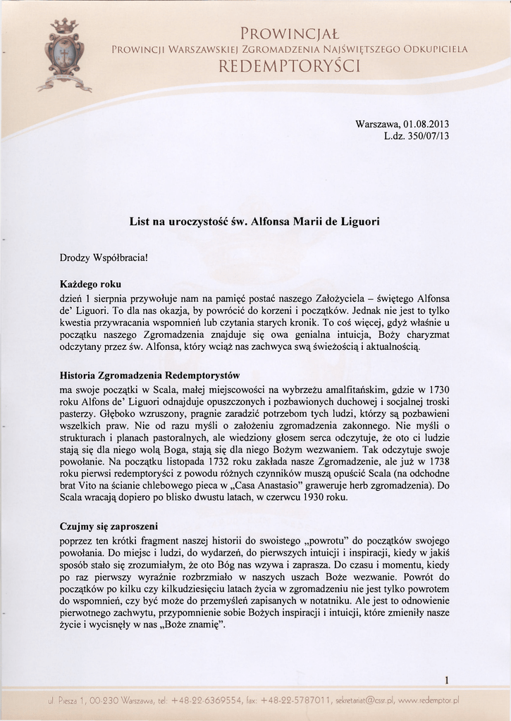 PROWINCJAŁ P R O W I N C J I WARSZAWSKIEJ ZGROMADZENIA NAJŚWIĘTSZEGO ODKUPICIELA REDEMPTORYŚCI Warszawa, 01.08.2013 L.dz. 350/07/13 List na uroczystość św. Alfonsa Marii de Liguori Drodzy Współbracia! Każdego roku dzień 1 sierpnia przywołuje nam na pamięć postać naszego Założyciela - świętego Alfonsa de' Liguori. To dla nas okazja, by powrócić do korzeni i początków. Jednak nie jest to tylko kwestia przywracania wspomnień lub czytania starych kronik. To coś więcej, gdyż właśnie u początku naszego Zgromadzenia znajduje się owa genialna intuicja, Boży charyzmat odczytany przez św. Alfonsa, który wciąż nas zachwyca swą świeżością i aktualnością. Historia Zgromadzenia Redemptorystów ma swoje początki w Scala, małej miejscowości na wybrzeżu amalfitańskim, gdzie w 1730 roku Alfons de' Liguori odnajduje opuszczonych i pozbawionych duchowej i socjalnej troski pasterzy. Głęboko wzruszony, pragnie zaradzić potrzebom tych ludzi, którzy są pozbawieni wszelkich praw. Nie od razu myśli o założeniu zgromadzenia zakonnego. Nie myśli o strukturach i planach pastoralnych, ale wiedziony głosem serca odczytuje, że oto ci ludzie stają się dla niego wolą Boga, stają się dla niego Bożym wezwaniem. Tak odczytuje swoje powołanie. Na początku listopada 1732 roku zakłada nasze Zgromadzenie, ale już w 1738 roku pierwsi redemptoryści z powodu różnych czynników muszą opuścić Scala (na odchodne brat Vito na ścianie chlebowego pieca w „Casa Anastasio" graweruje herb zgromadzenia). Do Scala wracają dopiero po blisko dwustu latach, w czerwcu 1930 roku. Czujmy się zaproszeni poprzez ten krótki fragment naszej historii do swoistego „powrotu" do początków swojego powołania. Do miejsc i ludzi, do wydarzeń, do pierwszych intuicji i inspiracji, kiedy w jakiś sposób stało się zrozumiałym, że oto Bóg nas wzywa i zaprasza. Do czasu i momentu, kiedy po raz pierwszy wyraźnie rozbrzmiało w naszych uszach Boże wezwanie. Powrót do początków po kilku czy kilkudziesięciu latach życia w zgromadzeniu nie jest tylko powrotem do wspomnień, czy być może do przemyśleń zapisanych w notatniku. Ale jest to odnowienie pierwotnego zachwytu, przypomnienie sobie Bożych inspiracji i intuicji, które zmieniły nasze życie i wycisnęły w nas „Boże znamię". 1 ul. Piesza 1, 0 0 - 2 3 0 Warszawa, tel: + 4 8 - 2 2 - 6 3 6 9 5 5 4 , fax: + 4 8 - 2 2 - 5 7 8 7 0 1 1, [email protected], w w w . r e d e m p t o r . p l Dlaczego to zaproszenie? Otóż, chyba tylko wówczas, w kontekście pierwszego zrozumienia wielkości Bożego zaproszenia i prześledzenia powołania w tej perspektywie, będziemy mogli z wdzięcznością spojrzeć na nasze redemptorystowskie powołanie. Z takiego ducha wypływa zaproszenie, które kieruje do nas Ojciec Generał Michael Brehl, abyśmy począwszy od tegorocznego święta naszego Założyciela, podjęli w naszym osobistym i wspólnotowym życiu wysiłek wspierania naszego powołania misyjnego. Zapowiadając ten szczególny rok, w taki sposób zwracał się do nas w swoim liście skierowanym końcem kwietnia do całego Zgromadzenia: Moim listem pragną zaprosić każdą prowincją, wiceprowincją, regią, misją i wspólnotą w Zgromadzeniu, aby zacząły myśleć o tym, jak ten rok celebrować. Zachącam, abyśmy rozpoczynali od propagowania naszej misji. Jesteśmy redemptorystami misjonarzami: kapłani, bracia, siostry oraz świeccy mążczyźni i kobiety, którzy są posłani, aby głosić Dobrą Nowiną ciągłe na nowo. Przede wszystkim jesteśmy posłani do opuszczonych i ubogich. Po drugie, każda jednostka powinna zbadać konkretne kroki, które może zastosować w ramach rozwoju duszpasterstwa powołań. To wymaga promowania naszego powołania misyjnego, jak również towarzyszenia kandydatom. Po trzecie, każda wspólnota powinna rozważyć specyficzne sposoby, poprzez które może celebrować powołanie redemptorysty misjonarza. Inicjatywa Ojca Generała jest czymś cennym i wartym uwagi. Dotyczy ona naszej misji w Kościele, dotyczy ona zadania, jakie nasze zgromadzenie ma dzisiaj do wypełnienia w Kościele. Jednak skuteczność tej inicjatywy zależy przede wszystkim od naszej osobistej postawy i naszego osobistego zaangażowania. Zanim pojawią się dyrektywy na szczeblu zarządu generalnego czy prowincjalnego, potrzeba, aby każdy z nas powrócił do swych pierwszych, pierwotnych motywacji i inspiracji, kiedy to zrozumiał, że Bóg pragnie, aby był redemptorystą. Trzeba nam powracać do naszego „duchowego" Scala, aby stamtąd zaczerpnąć ducha „początków" pełnego świeżości i autentyczności. Wiemy dobrze, że święty Alfons do końca swego życia wracał do groty w Scala, do tych pierwszych inspiracji i Bożych zamiarów, do tych tajemniczych i niezapisanych w żadnej kronice treści, które prowadziły go przez całe życie. Drodzy Współbracia! Niech liturgiczne święto naszego Założyciela, które otwiera rok wspierania powołania misyjnego w naszym zgromadzeniu, skłoni każdego z nas do powrotu do naszego „duchowego" Scala, do tych niezapisanych nigdzie, poza naszym sercem, treści. Niech sprawi, aby one ożyły i na nowo nas prowadziły w apostolskim posługiwaniu ludziom najbardziej opuszczonym. W Chrystusie Odkupicielu! 2