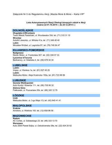 Załącznik Nr 5 do Regulaminu Akcji „Mazda More & More – Karta VIP” Lista Autoryzowanych Stacji Obsługi biorących udział w Akcji (ważna od 01.10.2014 r. do 24.12.2014 r.) DOLNOŚLĄSKIE Długołęka k/Wrocławia Team Marek Pasierbski, ul. Wrocławska 33d, tel. (71) 315 31 10 Wrocław AutoArt Jaremko, ul. Mińska 41a, tel. (71) 349 40 40 Lubin Mirosław Wróbel, ul. Legnicka 67, tel. (76) 746 64 47 KUJAWSKO-POMORSKIE Bydgoszcz Nordic Motor, ul. Fordońska 307, tel. (52) 339 07 33 Łysomice k/Torunia Bednarscy, ul. Gdańska 4, tel. (56) 678 34 34 LUBELSKIE Lublin Impex, ul. Wertera 1a, tel. (81) 527 45 25 Lublin Matsuoka Motor, Aleja Kraśnicka 150a, tel. (81) 723 99 99 LUBUSKIE Gorzów Wielkopolski Auto Kordyl, Wawrów 111, tel. (95) 728 90 32 Zielona Góra Fiałkowski, ul. Poznańska 20b, tel. (68) 320 12 75 ŁÓDZKIE Łódź Matsuoka Motor, ul. 3-go Maja 1/3, tel. (42) 645 41 41 MAŁOPOLSKIE Kraków Anndora, ul. Wielicka 193, tel. (12) 658 96 58 MAZOWIECKIE Radom AC Cortes, ul. Sobieskiego 23, tel. (48) 333 13 70 Warszawa Auto 2000 Paweł Sójka, ul. Ostrobramska 38a, tel. (22) 424 20 02 Warszawa AZ Auto, ul. Puławska 516, tel. (22) 648 40 63 Warszawa Bemo Motors, Al. Krakowska 169, tel. (22) 574 22 06 Warszawa Bołtowicz, ul. Rosoła 55, tel. (22) 649 30 50 Warszawa Gołembiewscy, ul. Św. Wincentego 92, tel. (22) 773 38 84 Warszawa Nivette, ul. Lotnicza 3/5, tel. (22) 509 66 00 Warszawa Odyssey, ul. Górczewska 32, tel. (22) 533 55 00 OPOLSKIE Opole Mirosław Wróbel, ul Wspólna 1a, tel. (77) 401 83 33 Osiny k/Opola Marco Tuning, ul. Opolska 1a, tel. (77) 457 58 20 POMORSKIE Bolesławice k/Słupska BMG Bogdan Goworowski, ul. Słupska 6, tel. (59) 848 70 70 Gdańsk BMG Goworowski, ul. Elbląska 81, tel. (58) 3 222 222 Gdańsk Zdanowicz, ul. Grunwaldzka 256a, tel. (58) 552 06 23 Gdynia BMG Goworowski, ul. Łużycka 9, tel. (58) 660 49 15 Reda G-M, ul. Wejherowska 63, tel. (58) 677 90 00 ŚLĄSKIE Bielsko-Biała Auto-Gazda, ul. Warszawska 328, tel. (33) 810 50 00 Dąbrowa Górnicza Boroń, ul. Katowicka 2, tel. (32) 261 61 22 Katowice Stefan Dyga, ul. Siwka 11, tel. (32) 256 63 89 Katowice Pro-moto, ul. Kościuszki 215, tel. (32) 250 11 00 Tarnowskie Góry Pro-moto, ul. Korola 14a, tel. (32) 384 01 00 Zabrze Pro-moto, ul. Wolności 1, tel. (32) 757 11 44 PODKARPACKIE Rzeszów D&R Czach, ul. Krakowska 32b, tel. (17) 860 12 20 PODLASKIE Białystok Gołembiewscy, ul. Gen. Maczka 136, tel. (85) 74 74 371 ŚWIĘTOKRZYSKIE Kielce Matsuoka Motor, ul. 1-go Maja 191, tel. (41) 345 55 53 WARMIŃSKO-MAZURSKIE Ełk Gołembiewscy, ul. Suwalska 88, tel. (87) 734 50 04 Olsztyn A&G Automotive, ul. Sikorskiego 19, tel. (89) 672 40 20 Olsztyn Auto Idea, ul. Towarowa 11, tel. (89) 534 40 93 WIELKOPOLSKIE Baranowo k/Poznania Auto-Wache, ul. Poznańska 10, tel. (61) 664 77 66 Poznań Voyager - Club, ul. Św. Michała 20, tel. (61) 877 02 71 ZACHODNIOPOMORSKIE Szczecin Becar, ul. Madalińskiego 8, tel. (91) 483 68 88 Szczecin Kozłowski, ul. Struga 31b, tel. (91) 464 48 81