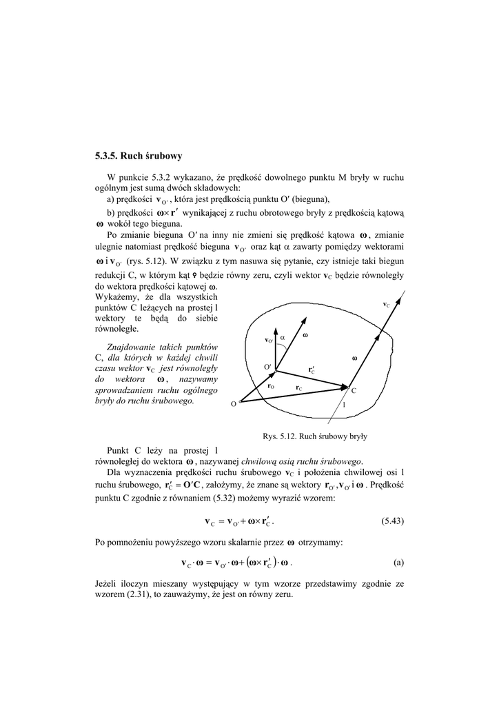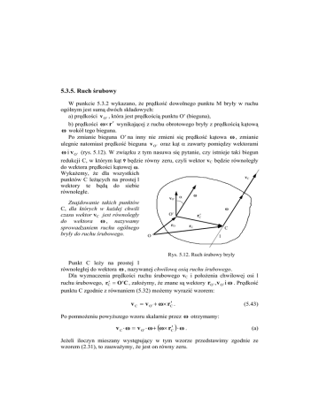 5.3.5. Ruch śrubowy W punkcie 5.3.2 wykazano, że prędkość dowolnego punktu M bryły w ruchu ogólnym jest sumą dwóch składowych: a) prędkości v O ′ , która jest prędkością punktu O′ (bieguna), b) prędkości ω× r ′ wynikającej z ruchu obrotowego bryły z prędkością kątową ω wokół tego bieguna. Po zmianie bieguna O ′ na inny nie zmieni się prędkość kątowa ω , zmianie ulegnie natomiast prędkość bieguna v O ′ oraz kąt α zawarty pomiędzy wektorami ω i v O′ (rys. 5.12). W związku z tym nasuwa się pytanie, czy istnieje taki biegun redukcji C, w którym kąt D będzie równy zeru, czyli wektor vC będzie równoległy do wektora prędkości kątowej ω. Wykażemy, że dla wszystkich vC punktów C leżących na prostej l wektory te będą do siebie równoległe. Znajdowanie takich punktów C, dla których w każdej chwili czasu wektor vC jest równoległy do wektora ω , nazywamy sprowadzaniem ruchu ogólnego bryły do ruchu śrubowego. ω vO′ α ω O′ rO rC′ rC O C l Rys. 5.12. Ruch śrubowy bryły Punkt C leży na prostej l równoległej do wektora ω , nazywanej chwilową osią ruchu śrubowego. Dla wyznaczenia prędkości ruchu śrubowego vC i położenia chwilowej osi l ruchu śrubowego, rC′ = O ′C , założymy, że znane są wektory rO′ , v O′ i ω . Prędkość punktu C zgodnie z równaniem (5.32) możemy wyrazić wzorem: v C = v O′ + ω× rC′ . (5.43) Po pomnożeniu powyższego wzoru skalarnie przez ω otrzymamy: v C ⋅ ω = v O′ ⋅ ω + (ω× rC′ ) ⋅ ω . (a) Jeżeli iloczyn mieszany występujący w tym wzorze przedstawimy zgodnie ze wzorem (2.31), to zauważymy, że jest on równy zeru. (ω× rC′ ) ⋅ ω = rC′ ⋅ (ω× ω ) = 0 . W tej sytuacji równanie (a) upraszcza się do postaci v C ⋅ ω = v O′ ⋅ ω . Ponieważ wektory po lewej stronie tego równania są równoległe, na podstawie definicji iloczynu skalarnego można napisać: v C ω = v O′ ⋅ ω . (b) Stąd moduł prędkości vC punktu C v C = v O′ ⋅ ω /ω. (5.44) Prędkość vC punktu C otrzymamy po pomnożeniu powyższego wzoru przez wektor jednostkowy ω/ω o kierunku osi l v C = (v O′ ⋅ ω )ω /ω2 . (5.45) W celu wyznaczenia wektora rC′ porównamy stronami wzory (5.43) i (5.45) na prędkość vC. Otrzymamy wtedy równanie wektorowe: v O′ + ω× rC′ = (v O′ ⋅ ω )ω /ω2. Po przeniesieniu prędkości v O ′ na prawą stronę i sprowadzeniu do wspólnego mianownika mamy: ω× rC′ = [ (v O′ ⋅ ω )ω − ω2 v O′ ] /ω2 lub ω× rC′ = [ ω(v O′ ⋅ ω )− v O′ (ω⋅ ω ) ] /ω2. W porównaniu ze wzorem (2.34) łatwo zauważyć, że wyrażenie występujące w nawiasie kwadratowym po prawej stronie tego równania jest rozwinięciem podwójnego iloczynu wektorowego. Zatem równanie to możemy zapisać w taki sposób: ω× rC′ = [ ω× (ω× v O′ ) ] /ω2 . (5.46) W powyższym równaniu wektorowym jest tylko jedna niewiadoma rC′ . Łatwo zauważyć, że rozwiązanie ogólne tego równania ma postać: rC′ = (ω× v O′ ) /ω2 + λ ω , (5.47) gdzie λ jest dowolną wielkością dodatnią lub ujemną. Wzór ten opisuje położenie wszystkich punktów C leżących na prostej równoległej do prędkości kątowej ω . Jest to więc szukane równanie chwilowej osi l ruchu śrubowego w układzie ruchomym (związanym z bryłą). W układzie współrzędnych x ′, y ′ , z ′ równanie to możemy zapisać w postaci trzech równoważnych parametrycznych równań skalarnych: x ′C = ω y′ v O′z′ − ω z′ v O′y′ ω ω z′ v O′x′ − ω x′ v O′z′ y ′C = ω2 ω x′ v O′y′ − ω y′ v O′x′ z ′C = ω2 2 ⎫ + λω x′ ,⎪ ⎪ ⎪ + λω y′ ,⎬ ⎪ + λω z′ . ⎪ ⎪⎭ (5.48) Na rysunku 5.12 widzimy, że położenie każdego punktu C chwilowej osi ruchu śrubowego w układzie nieruchomym wyznacza promień wodzący r, który można przedstawić w postaci sumy wektorów rO′ i rC′ . Po uwzględnieniu wzoru (5.47) wektorowe równanie chwilowej osi ruchu śrubowego w układzie nieruchomym będzie miało postać: rC = rO′ + rC′ = rO′ + (ω× v O′ ) /ω2 + λ ω . (5.49) Temu równaniu w układzie nieruchomym będą odpowiadały trzy parametryczne równania. W tym celu wektory występujące w równaniu (5.49) należy wyrazić w układzie współrzędnych x, y, z: x C = x O′ + y C = y O′ + z C = z O′ + ω y v O′z − ω z v O′y ω2 ω z v O′x − ω x v O′z ω2 ω x v O′y − ω y v O′x ω2 ⎫ + λω x ,⎪ ⎪ ⎪ + λω y ,⎬ ⎪ ⎪ + λω z . ⎪ ⎭ (5.50) Wykazaliśmy tym samym, że ruch ogólny bryły można w dowolnej chwili sprowadzić do ruchu śrubowego zdefiniowanego na wstępie tego punktu. Ruch ten jest sumą dwóch ruchów prostych: a) obrotowego z prędkością kątową ω wokół chwilowej osi ruchu śrubowego, b) postępowego z prędkością vC wzdłuż tej osi. ω vc v vc C ω x CM l M Rys5.13. Złożenie ruchu ogólnego bryły z ruchu obrotowego wokół chwilowej osi ruchu śrubowego i ruchu postępowego wzdłuż tej osi Jeżeli zamiast dowolnego bieguna O ′ obierzemy biegun redukcji C leżący na chwilowej osi l ruchu śrubowego (rys. 5.13), to prędkość v dowolnego punktu M bryły będzie sumą dwóch wzajemnie prostopadłych składowych: po-stępowej vC i obrotowej ω× CM : v = v C + ω× CM . Analizując ruch śrubowy bryły, możemy rozróżnić dwa przypadki: a) vC(t) ≠ 0; wtedy najprostszym ruchem bryły jest chwilowy ruch śrubowy; nie będziemy się tu nim zajmować; b) vC(t) = 0; wtedy − jak to widać na rys. 5.12 i 5.13 − ruch bryły sprowadza się do chwilowego obrotu wokół osi l, którą będziemy nazywać chwilową osią obrotu.