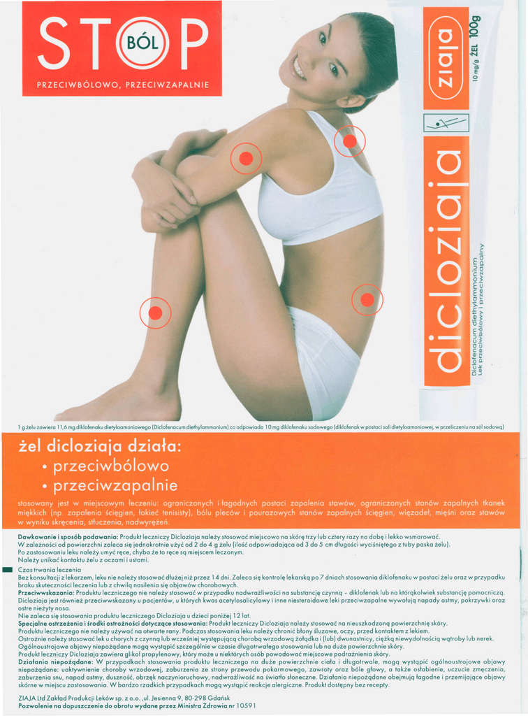 Dawkowanie i sposób podawania: Produkt leczniczy Dicloziaja należy stosować miejscowo na skórę trzy lub cztery razy na dobę i lekko wsmarować. W zależności od powierzchni zaleca się jednokrotnie użyć od 2 do 4 g żelu (ilość odpowiadająca od 3 do 5 cm długości wyciśniętego z tuby paska żelu). Po zastosowaniu leku należy umyć ręce, chyba że to ręce są miejscem leczonym. Należy unikać kontaktu żelu z oczami i ustami. _ Czas trwania leczenia Bez konsultacji z lekarzem, leku nie należy stosować dłużej niż przez 14 dni. Zaleca się kontrolę lekarską po 7 dniach stosowania diklolenaku w postaci żelu oraz w przypadku braku skuteczności leczenia lub z chwilą nasilenia się objawów chorobowych. Przeciwwskazania: Produktu leczniczego nie należy stosować w przypadku nadwrażliwości na substancję czynną - diklolenak lub na którąkolwiek substancję pomocniczą. Dicloziaja jest również przeciwwskazany u pacjentów, u których kwas acetylosalicylowy i inne niesteroidowe leki przeciwzapalne wywołują napady astmy, pokrzywki oraz ostre nieżyty nosa. Nie zaleca się stosowania produktu leczniczego Dicloziaja u dzieci poniżej 12 lat. Specjalne ostrzeżenia i środki ostrożności dotyczqce stosowania: Produkt leczniczy Dicloziaja należy stosować na nieuszkodzoną powierzchnię skóry. Produktu leczniczego nie należy używać na otwarte rany. Podczas stosowania leku należy chronić błony śluzowe, oczy, przed kontaktem z lekiem. Ostrożnie należy stosować lek u chorych z czynną lub wcześniej występującą chorobą wrzodową żołądka i (lub) dwunastnicy, ciężką niewydolnością wątroby lub nerek. Ogólnoustrojowe objawy niepożądane mogą wystąpić szczególnie w czasie długotrwałego stosowania lub na duże powierzchnie skóry. Produkt leczniczy Dicloziaja zawiera glikol propylenowy, który może u niektórych osób powodować miejscowe podrażnienia skóry. Działania niepożqdane: W przypadkach stosowania produktu leczniczego na duże powierzchnie ciała i długotrwale, mogą wystąpić ogólnoustrojowe objawy niepożądane: uaktywnienie choroby wrzodowej, zaburzenia ze strony przewodu pokarmowego, zawroty oraz bóle głowy, a także osłabienie, uczucie zmęczenia, zaburzenia snu, napad astmy, duszność, obrzęk naczynioruchowy, nadwrażliwość na światło słoneczne. Działania niepożądane obejmują łagodne i przemijające objawy skórne w miejscu zastosowania. W bardzo rzadkich przypadkach mogą wystąpić reakcje alergiczne. Produkt dostępny bez recepty. ZIAJA Ltd Zakład Produkcji Leków sp. z 0.0. ,ul. Jesienna 9, 80-298 Gdańsk Pozwolenie na dopuszczenie do obrotu wydane przez Ministra Zdrowia nr 10591