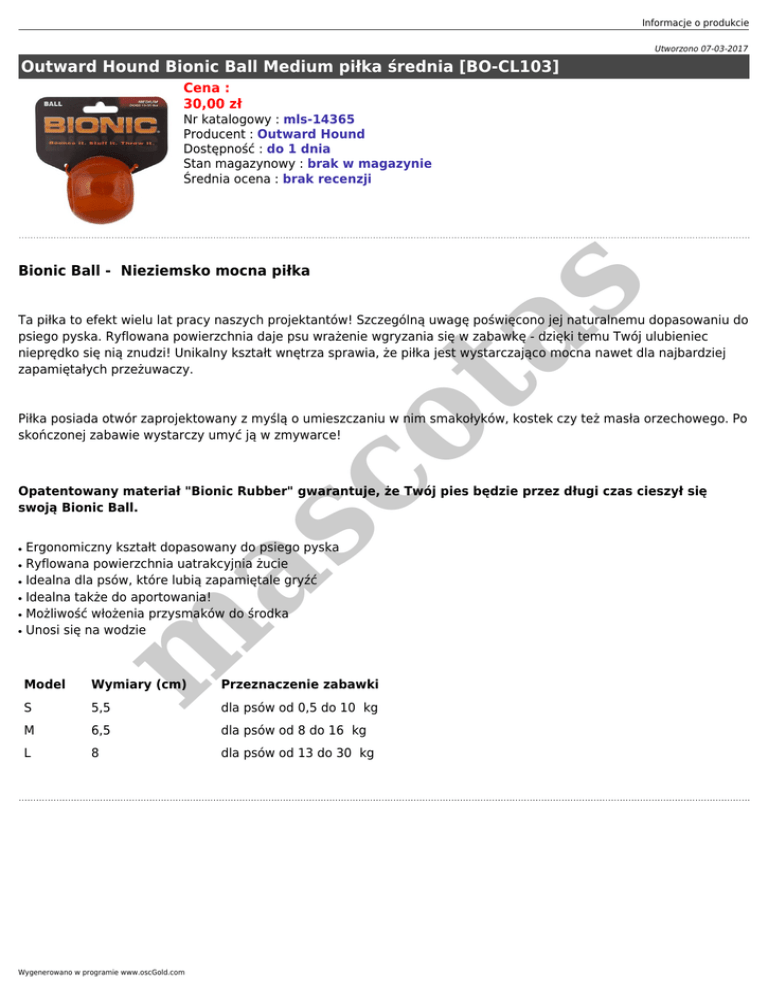 Informacje o produkcie Utworzono 07-03-2017 Outward Hound Bionic Ball Medium piłka średnia [BO-CL103] Cena : 30,00 zł Nr katalogowy : mls-14365 Producent : Outward Hound Dostępność : do 1 dnia Stan magazynowy : brak w magazynie Średnia ocena : brak recenzji s Bionic Ball - Nieziemsko mocna piłka co ta Ta piłka to efekt wielu lat pracy naszych projektantów! Szczególną uwagę poświęcono jej naturalnemu dopasowaniu do psiego pyska. Ryflowana powierzchnia daje psu wrażenie wgryzania się w zabawkę - dzięki temu Twój ulubieniec nieprędko się nią znudzi! Unikalny kształt wnętrza sprawia, że piłka jest wystarczająco mocna nawet dla najbardziej zapamiętałych przeżuwaczy. Piłka posiada otwór zaprojektowany z myślą o umieszczaniu w nim smakołyków, kostek czy też masła orzechowego. Po skończonej zabawie wystarczy umyć ją w zmywarce! ● ● ● ● ● ● m as Opatentowany materiał "Bionic Rubber" gwarantuje, że Twój pies będzie przez długi czas cieszył się swoją Bionic Ball. Ergonomiczny kształt dopasowany do psiego pyska Ryflowana powierzchnia uatrakcyjnia żucie Idealna dla psów, które lubią zapamiętale gryźć Idealna także do aportowania! Możliwość włożenia przysmaków do środka Unosi się na wodzie Model Wymiary (cm) Przeznaczenie zabawki S 5,5 dla psów od 0,5 do 10 kg M 6,5 dla psów od 8 do 16 kg L 8 dla psów od 13 do 30 kg Wygenerowano w programie www.oscGold.com