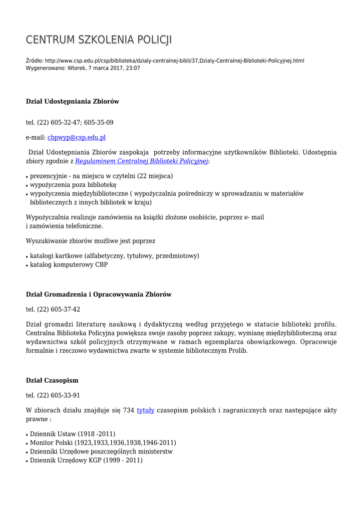 CENTRUM SZKOLENIA POLICJI Źródło: http://www.csp.edu.pl/csp/biblioteka/dzialy-centralnej-bibli/37,Dzialy-Centralnej-Biblioteki-Policyjnej.html Wygenerowano: Wtorek, 7 marca 2017, 23:07 Dział Udostępniania Zbiorów tel. (22) 605-32-47; 605-35-09 e-mail: [email protected] Dział Udostępniania Zbiorów zaspokaja potrzeby informacyjne użytkowników Biblioteki. Udostępnia zbiory zgodnie z Regulaminem Centralnej Biblioteki Policyjnej: ● ● ● prezencyjnie - na miejscu w czytelni (22 miejsca) wypożyczenia poza bibliotekę wypożyczenia międzybiblioteczne ( wypożyczalnia pośredniczy w sprowadzaniu w materiałów bibliotecznych z innych bibliotek w kraju) Wypożyczalnia realizuje zamówienia na książki złożone osobiście, poprzez e- mail i zamówienia telefoniczne. Wyszukiwanie zbiorów możliwe jest poprzez ● ● katalogi kartkowe (alfabetyczny, tytułowy, przedmiotowy) katalog komputerowy CBP Dział Gromadzenia i Opracowywania Zbiorów tel. (22) 605-37-42 Dział gromadzi literaturę naukową i dydaktyczną według przyjętego w statucie biblioteki profilu. Centralna Biblioteka Policyjna powiększa swoje zasoby poprzez zakupy, wymianę międzybiblioteczną oraz wydawnictwa szkół policyjnych otrzymywane w ramach egzemplarza obowiązkowego. Opracowuje formalnie i rzeczowo wydawnictwa zwarte w systemie bibliotecznym Prolib. Dział Czasopism tel. (22) 605-33-91 W zbiorach działu znajduje się 734 tytuły czasopism polskich i zagranicznych oraz następujące akty prawne : ● ● ● ● Dziennik Ustaw (1918 -2011) Monitor Polski (1923,1933,1936,1938,1946-2011) Dzienniki Urzędowe poszczególnych ministerstw Dziennik Urzędowy KGP (1999 - 2011) Dział Informacji Naukowej tel. (22) 605-35-31 mail: [email protected] Dział prowadzi prace usługowo-informacyjne, bibliograficzne i dydaktyczne, promuje wydawnicze na stronie internetowej nowości W ramach działalności dokumentacyjnej wydano dziesięć zeszytów "Bibliografii Zawartości Zagranicznych Czasopism Policyjnych" oraz trzy edycje "Informatora o Czasopismach i Wydawnictwach Ciągłych w Zbiorach CBP" Filia CBP w Zakładzie Kynologii Policyjnej w Sułkowicach tel. (48) 661-42-88 w. 155 Filia posiada księgozbiór wielkości 10 614 wol., o profilu ściśle związanym z kynologią i działalnością Policji. Filia jest dostępna dla kadry i słuchaczy kursów specjalistycznych w Zakładzie Kynologi i Policyjnej.W indywidualnych przypadkach kierownik Centralnej Biblioteki Policyjnej może wyrazić zgodę na udostępnianie księgozbioru Filii czytelnikom nie związanym z Policją. Ocena: 3.7/5 (3) Tweetnij