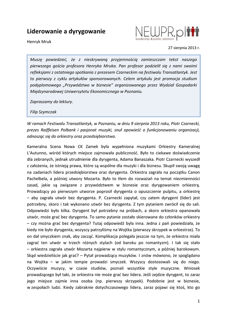 Liderowanie a dyrygowanie Henryk Mruk 27 sierpnia 2013 r. Muszę powiedzieć, że z nieskrywaną przyjemnością zamieszczam tekst naszego pierwszego gościa profesora Henryka Mruka. Pan profesor podzielił się z nami swoimi refleksjami z ostatniego spotkania z prezesem Czarneckim na festiwalu Transatlantyk. Jest to pierwszy z cyklu artykułów sponsorowanych. Celem artykułu jest promocja studium podyplomowego „Przywództwo w biznesie” organizowanego przez Wydział Gospodarki Międzynarodowej Uniwersytetu Ekonomicznego w Poznaniu. Zapraszamy do lektury. Filip Szymczak W ramach Festiwalu Transatlantyk, w Poznaniu, w dniu 9 sierpnia 2013 roku, Piotr Czarnecki, prezes Raiffeisen Polbank i pasjonat muzyki, snuł opowieść o funkcjonowaniu organizacji, odnosząc się do orkiestry oraz przedsiębiorstwa. Kameralna Scena Nowa CK Zamek była wypełniona muzykami Orkiestry Kameralnej L’Autunno, wśród których miejsce zajmowała publiczność. Było to ciekawe doświadczenie dla zebranych, jednak utrudnienie dla dyrygenta, Adama Banaszaka. Piotr Czarnecki wyszedł z założenia, że istnieją prawa, które są wspólne dla muzyki i dla biznesu. Skupił swoją uwagę na zadaniach lidera przedsiębiorstwa oraz dyrygenta. Orkiestra zagrała na początku Canon Pachelbela, a później utwory Mozarta. Było to tłem do rozważań na temat niezmienności zasad, jakie są związane z przywództwem w biznesie oraz dyrygowaniem orkiestrą. Prowadzący po pierwszym utworze poprosił dyrygenta o opuszczenie pulpitu, a orkiestrę – aby zagrała utwór bez dyrygenta. P. Czarnecki zapytał, czy zatem dyrygent (lider) jest potrzebny, skoro i tak wykonano utwór bez dyrygenta. Z tym pytaniem zwrócił się do sali. Odpowiedzi było kilka. Dyrygent był potrzebny na próbach, a skoro orkiestra opanowała utwór, może grać bez dyrygenta. To samo pytanie zostało skierowane do członków orkiestry – czy można grać bez dyrygenta? Tutaj odpowiedź była inna. Jedna z pań powiedziała, że kiedy nie było dyrygenta, wszyscy patrzyliśmy na Wojtka (pierwszy skrzypek w orkiestrze). To on dał smyczkiem znak, aby zacząć. Komplikacja polegała jeszcze na tym, że orkiestra miała zagrać ten utwór w trzech różnych stylach (od baroku po romantyzm). I tak się stało – orkiestra zagrała utwór Mozarta najpierw w stylu romantycznym, a później barokowym. Skąd wiedzieliście jak grać? – Pytał prowadzący muzyków. I znów mówiono, że spoglądano na Wojtka – w jakim tempie prowadzi smyczek. Wszyscy dostosowali się do niego. Oczywiście muzycy, w czasie studiów, poznali wszystkie style muzyczne. Wniosek prowadzącego był taki, że orkiestra nie może grać bez lidera. Jeśli zejdzie dyrygent, to zaraz jego miejsce zajmie inna osoba (np. pierwszy skrzypek). Podobnie jest w biznesie, w zespołach ludzi. Kiedy zabraknie dotychczasowego lidera, zaraz pojawi się ktoś, kto go 1 zastąpi. Piotr Czarnecki poprosił przypadkową osobę z widowni, aby zajęła miejsce dyrygenta. Okazało się, że praca orkiestry była utrudniona. Osoba, która dyryguje, jest liderem, powinna mieć ku temu odpowiednie kompetencje. Kolejna część spotkania została poświęcona eksperymentowi z różnymi stylami dyrygowania. Adam Banaszak pokazał dodatkowo dwa style – narzucania orkiestrze interpretacji każdej nuty oraz drugi – flegmatyczne wypełnianie swojej funkcji, prawie bez kontaktu wzrokowego z orkiestrą. Poza opiniami publiczności, niezwykle cenne były wypowiedzi muzyków. Ani jeden, ani drugi styl nie były akceptowane. W pierwszym przypadku, ingerencja dyrygenta posunęła się za daleko. W biznesie nazywa się to mikrozarządzaniem. Zespół nie będzie pracował dobrze, jeśli lider wtrąca się we wszystko, nie słucha innych, o wszystkim sam decyduje. Członkowie orkiestry mówili, że cenią sobie to, jeśli mogą się wypowiadać na próbach, jak ma być wykonany dany utwór. Jeśli nie jest możliwe, aby wypowiedzieli się wszyscy muzycy, to dyrygent powinien chociaż wysłuchać szefa każdej sekcji (grupy instrumentów). Wysłuchanie zespołu jest warunkiem skuteczności jego funkcjonowania. Drugi styl, flegmatyczny, także uznano za niewłaściwy. Dyrygent powinien być zaangażowany, dynamiczny, prowadzić zespół zgodnie z wyznaczonym celem. Stało się to też kanwą do ciekawej dyskusji na temat najważniejszych cech lidera. Prowadzący zapytał również dyrygenta, jak on postrzega swoją rolę w orkiestrze. Adam Banaszak, poruszając różne wątki powiedział, że dyrygent daje orkiestrze pewność siebie, co jest istotne z punktu widzenia efektu jej gry. Podobnie jest w biznesie – osoba lidera daje pewność siebie zespołowi, który wówczas może skuteczniej realizować zadania. Jedno z pytań zostało skierowane do najmłodszej osoby w orkiestrze. Była nią pani, która liczyła sobie 21 lat. Od kiedy gra na skrzypcach? – od 17 lat. Ile godzin ćwiczy codzienne? – 4 do 5. Ale w soboty nie, prawda? W soboty też. No to niedziele są wolne? Nigdy. W niedziele też. Miało to służyć refleksji na temat pracy nad sobą, nad podnoszeniem kwalifikacji. Dotyczy to w takim samym stopniu lidera jak i członków zespołu. W przypadku wielu instrumentów, dwie osoby (muzycy) są obok siebie, grają z jednych nut. Pytanie dotyczyło tego, czy jedna z tych osób zwróci uwagę drugiej, jeśli ta nie gra właściwie swojej partii. I tutaj pojawił się problem. Odpowiedzi były wymijające – to zależy itp. Piotr Czarnecki powiedział o tym, że jest to trudna dla Polaków kwestia. Brak zaufania do innych powoduje, że pojawiają się bariery w doskonaleniu pracy zespołów. Istotnie, jest to obszar, który wymaga edukacji, zajęć warsztatowych. Jest to również obszar, który powinien być w centrum zainteresowania lidera. Dyrygent, jeśli orkiestra gra głośno, nie jest w stanie wyłowić pojedynczych, fałszywych dźwięków. Oznacza to, że dyrygent i muzycy razem stan