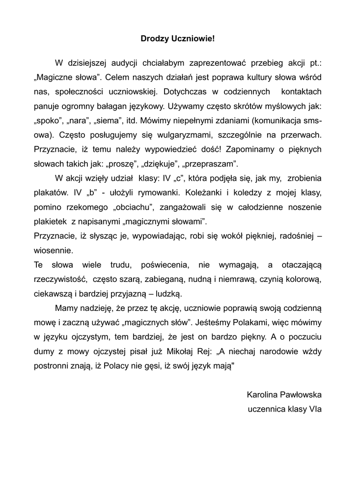 Drodzy Uczniowie! W dzisiejszej audycji chciałabym zaprezentować przebieg akcji pt.: „Magiczne słowa”. Celem naszych działań jest poprawa kultury słowa wśród nas, społeczności uczniowskiej. Dotychczas w codziennych kontaktach panuje ogromny bałagan językowy. Używamy często skrótów myślowych jak: „spoko”, „nara”, „siema”, itd. Mówimy niepełnymi zdaniami (komunikacja smsowa). Często posługujemy się wulgaryzmami, szczególnie na przerwach. Przyznacie, iż temu należy wypowiedzieć dość! Zapominamy o pięknych słowach takich jak: „proszę”, „dziękuje”, „przepraszam”. W akcji wzięły udział klasy: IV „c”, która podjęła się, jak my, zrobienia plakatów. IV „b” - ułożyli rymowanki. Koleżanki i koledzy z mojej klasy, pomino rzekomego „obciachu”, zangażowali się w całodzienne noszenie plakietek z napisanymi „magicznymi słowami”. Przyznacie, iż słysząc je, wypowiadając, robi się wokół piękniej, radośniej – wiosennie. Te słowa wiele trudu, poświecenia, nie wymagają, a otaczającą rzeczywistość, często szarą, zabieganą, nudną i niemrawą, czynią kolorową, ciekawszą i bardziej przyjazną – ludzką. Mamy nadzieję, że przez tę akcję, uczniowie poprawią swoją codzienną mowę i zaczną używać „magicznych słów”. Jeśteśmy Polakami, więc mówimy w języku ojczystym, tem bardziej, że jest on bardzo piękny. A o poczuciu dumy z mowy ojczystej pisał już Mikołaj Rej: „A niechaj narodowie wżdy postronni znają, iż Polacy nie gęsi, iż swój język mają" Karolina Pawłowska uczennica klasy VIa