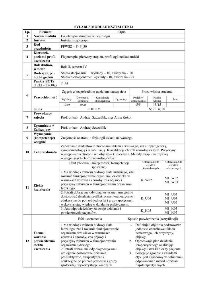 Lp. 1 2 3 4 5 Element Nazwa modułu Instytut Kod przedmiotu Kierunek, poziom i profil kształcenia Rok studiów, semestr Rodzaj zajęć i liczba godzin Punkty ECTS (1 pkt = 25-30g) SYLABUS MODUŁU KSZTAŁCENIA Opis Fizjoterapia kliniczna w neurologii Instytut Fizjoterapii PPWSZ – F- P_30 Fizjoterapia, pierwszy stopień, profil ogólnoakademicki Rok II, semestr IV Studia stacjonarne: wykłady – 10, ćwiczenia - 30 Studia niestacjonarne: wykłady - 10, ćwiczenia - 25 2 pkt Zajęcia z bezpośrednim udziałem nauczyciela 6 Pracochłonność Wykłady 10/10 7 8 9 Suma Prowadzący zajęcia Egzaminator/ Zaliczający Wymagania (kompetencje) wstępne 10 Cel przedmiotu 11 Efekty kształcenia Ćwiczenia/ seminaria 30/25 Konsultacje obowiązkowe Egzaminy 12 Projekty/ opracowania Nauka własna 5/5 15/15 S; 20 n; 20 S; 40 n; 35 Inne Prof. dr hab. Andrzej Szczudlik, mgr Anna Kokot Prof. dr hab. Andrzej Szczudlik Znajomość anatomii i fizjologii układu nerwowego. Zapoznanie studentów z chorobami układu nerwowego, ich etiopatogenezą, symptomatologią i rehabilitacją. Klasyfikacja chorób neurologicznych. Przyczyny występowania chorób i ich objawów klinicznych. Metody terapii najczęściej występujących chorób neurologicznych. Odniesienie do Odniesienie do Efekt (Wiedza, Umiejętności, Kompetencje efektów efektów społeczne) kierunkowych obszarowych 1.Ma wiedzę z zakresu budowy ciała ludzkiego, zna i rozumie funkcjonowanie organizmu człowieka w M1_W02 warunkach zdrowia i choroby, zna objawy i K_W02 M1_W03 przyczyny zaburzeń w funkcjonowaniu organizmu ludzkiego. 2.Potrafi dobrać metody diagnostyczne i umiejętnie M1_U03 dostosować działania profilaktyczne, terapeutyczne i K_U04 M1_U04 edukacyjne do potrzeb jednostki i grupy społecznej, M1_U05 wykorzystując wiedzę w działaniu praktycznym. 3. Jest odpowiedzialny za swoje działania i M1_K05 K_K05 powierzonych pacjentów. M1_K07 Efekt kształcenia Forma i warunki potwierdzenia efektu kształcenia Praca własna studenta 1.Ma wiedzę z zakresu budowy ciała ludzkiego, zna i rozumie funkcjonowanie organizmu człowieka w warunkach zdrowia i choroby, zna objawy i przyczyny zaburzeń w funkcjonowaniu organizmu ludzkiego. 2.Potrafi dobrać metody diagnostyczne i umiejętnie dostosować działania profilaktyczne, terapeutyczne i edukacyjne do potrzeb jednostki i grupy społecznej, wykorzystując wiedzę w Sposób potwierdzenia (weryfikacji) 1. Definiuje i objaśnia podstawowe jednostki chorobowe układu nerwowego, ich przyczyny, objawy. 2. Opracowuje plan działania terapeutycznego analizując objawy i stan kliniczny pacjenta. 3. Postępuje zgodnie z zasadami etyki jest świadomy w dobieraniu odpowiednich metod i działań fizjoterapeutycznych. 13 Treści merytoryczne przedmiotu 14 Wykaz literatury podstawowej 15 Wykaz literatury uzupełniającej (pomocniczej) działaniu praktycznym. 3. Jest odpowiedzialny za swoje działania i powierzonych pacjentów. Zaburzenia czynności układu nerwowego. Badanie neurologiczne. Metody stosowane w rehabilitacji pacjentów neurologicznych – wskazania i przeciwwskazania. Zagadnienie plastyczności mózgu. Spastyczność i inne zaburzenia napięcia mięśniowego – rehabilitacja. Udary mózgu (podział, czynniki ryzyka, objawy kliniczne). Kompleksowe leczenie pacjentów po udarach mózgu, skale uszkodzeń, skale funkcjonalne i skale jakości życia. Choroba Parkinsona, SLA, SM – leczenie rehabilitacyjne. Guzy mózgu i rdzenia kręgowego – postępowanie rehabilitacyjne. Polineuropatie, zespół Guillain-Barre – rehabilitacja. Choroby mięśni – dystrofie, miopatie, miastenia – rehabilitacja. Urazy czaszkowo-mózgowe i urazy rdzenia kręgowego – kompleksowa rehabilitacja. Zespołybolowe kręgosłupa, choroba krążka międzykręgowego – rehabilitacja. Uszkodzenia nerwów obwodowych – rehabilitacja. 1 Lennon S, Stokes M., red Kwolek A., „Fizjoterapia w rehabilitacji neurologiczne” , Elevier Urban Partner, Wrocław 2009. 2. Tasiemski T., „Usprawnianie po urazach rdzenia kręgowego”, Wyd. T. Tasiemski., Poznan 2001 3. NowotnyJ., „Kliniczne podstawy fizjoterapii w dysfunkcjach narządu ruchu”, Medipage, Warszawa 2006. 1. Straburzyński – Lupa A., „ Fizjoterapia”, PZWL, Warszawa 2003r.
