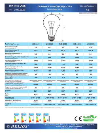 KK-NIS-A55 ¯ARÓWKA NISKONAPIÊCIOWA Wersja/Version: Low voltage lamp 1.0 2013.09.02 Date : Strona/Page: 1/2 D L Typ lampy/lamp type NIS-0021 NIS-0022 NIS-0023 NIS-0024 NIS-0025 25 40 60 75 100 25,0 40,0 60,0 75,0 100,0 24 24 24 24 24 335 580 1000 1300 1820 2700 2700 2700 2700 2700 100 100 100 100 100 Rated lamp life time h 1000 1000 1000 1000 1000 Wspó³czynnik mocy lampy 1,00 1,00 1,00 1,00 1,00 90 90 90 90 90 0,0 0,0 0,0 0,0 0,0 Moc nominalna W Nominal wattage W Moc znamionowa W Rated wattage W Napiêcie znamionowe V Rated voltage V Znamionowy strumieñ œwietlny lm Ratedluminous flux lm Temperatura barwowa K Color temperature K Wskaznik oddawania barw Ra Rendering index Ra Znamionowa trwa³oœæ h* Lamp power factor Wspó³czynnik zachowania strumienia œwietlnego na zakoñczenie nominalnego okresu trwa³oœci % Lumen maintenance factor at the end of the nominal life % Czas zap³onu s Starting time s Czas nagrzewania lampy do 60% pe³nego strumienia œwietlnego s natychmiast pe³ny strumieñ/ instant full light natychmiast pe³ny strumieñ/ instant full light natychmiast pe³ny strumieñ/ instant full light natychmiast pe³ny strumieñ/ instant full light natychmiast pe³ny strumieñ/ instant full light 10000 10000 10000 10000 10000 25 25 25 25 25 E27 E27 E27 E27 E27 A55 A55 A55 A55 A55 L=94 D=55 L=94 D=55 L=94 D=55 L=94 D=55 L=94 D=55 brak/ not have brak/ not have brak/ not have brak/ not have brak/ not have 5907758827772 5907758827789 5907758827796 5907758827802 5907758827819 Warm-up time up to 60 % of the full light output s Liczba cykli w³¹cz/wy³¹cz Number of switching cycles(on/off) 0 Optymalna temperatura eksploatacji C Optimal operating temperature 0C Trzonek Base Bañka Bulb Wymiary mm Dimensions mm Zawartoœæ rtêci Hg mg Mercury content mg Kod EAN EAN *Je¿eli nie podano inaczej przyjmuje siê, ¿e wartoœci parametrów nominalnych s¹ równe wartoœci parametrów znamionowych. ENERGIEY IJA IA ENERGIEY IJA IA ENERGIEY IJA IA ENERGIEY IJA IA ENERGIEY IJA IA eíåðãèÿ . åíåñãåéá eíåðãèÿ . åíåñãåéá eíåðãèÿ . åíåñãåéá eíåðãèÿ . åíåñãåéá eíåðãèÿ . åíåñãåéá NIS-0021 NIS-0022 NIS-0023 NIS-0024 NIS-0025 A++ A+ A B C B D B E B 25 C kWh/1000h A++ A+ A B C B D B E B 40 D kWh/1000h A++ A+ A B C B D B E B 60 C kWh/1000h A++ A+ A B C B D B E B 75 C kWh/1000h A++ A+ A B C B D B E B RoHS C Compliant with Zgodny z 100 kWh/1000h Fabryka ¯arówek ”HELIOS” Sp. z o.o., 40-224 Katowice, ul. 1 Maja 11/13, tel.(032) 258 62 21 fax (032) 259 98 52, www.helios.katowice.pl KK-NIS-A55 Date : ¯ARÓWKA NISKONAPIÊCIOWA Wersja/Version: Low voltage lamp 1.0 2013.09.02 Strona/Page: 2/2 D L Typ lampy/lamp type NIS-0026 NIS-0027 60 100 60,0 100,0 42 42 950 1780 2700 2700 100 100 Rated lamp life time h 1000 1000 Wspó³czynnik mocy lampy 1,00 1,00 90 90 0,0 0,0 Moc nominalna W Nominal wattage W Moc znamionowa W Rated wattage W Napiêcie znamionowe V Rated voltage V Znamionowy strumieñ œwietlny lm Ratedluminous flux lm Temperatura barwowa K Color temperature K Wskaznik oddawania barw Ra Rendering index Ra Znamionowa trwa³oœæ h* Lamp power factor Wspó³czynnik zachowania strumienia œwietlnego na zakoñczenie nominalnego okresu trwa³oœci % Lumen maintenance factor at the end of the nominal life % Czas zap³onu s Starting time s Czas nagrzewania lampy do 60% pe³nego strumienia œwietlnego s natychmiast pe³ny strumieñ/ instant full light natychmiast pe³ny strumieñ/ instant full light 10000 10000 25 25 E27 E27 A55 A55 L=94 D=55 L=94 D=55 brak/ not have brak/ not have 5907758827826 5907758827833 Warm-up time up to 60 % of the full light output s Liczba cykli w³¹cz/wy³¹cz Number of switching cycles(on/off) 0 Optymalna temperatura eksploatacji C Optimal operating temperature 0C Trzonek Base Bañka Bulb Wymiary mm Dimensions mm Zawartoœæ rtêci Hg mg Mercury content mg Kod EAN EAN *Je¿eli nie podano inaczej przyjmuje siê, ¿e wartoœci parametrów nominalnych s¹ równe wartoœci parametrów znamionowych. ENERGIEY IJA IA ENERGIEY IJA IA eíåðãèÿ . åíåñãåéá eíåðãèÿ . åíåñãåéá NIS-0026 NIS-0027 A++ A+ A B C B D B E B 60 D kWh/1000h A++ A+ A B C B D B E B RoHS C Compliant with Zgodny z 100 kWh/1000h Fabryka ¯arówek ”HELIOS” Sp. z o.o., 40-224 Katowice, ul. 1 Maja 11/13, tel.(032) 258 62 21 fax (032) 259 98 52, www.helios.katowice.pl