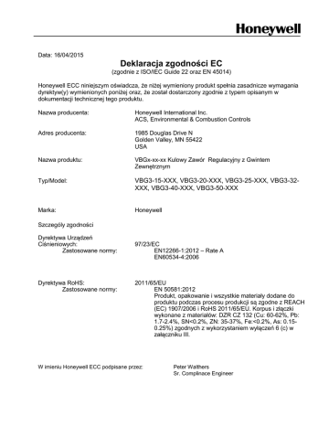 Data: 16/04/2015 Deklaracja zgodności EC (zgodnie z ISO/IEC Guide 22 oraz EN 45014) Honeywell ECC niniejszym oświadcza, że niżej wymieniony produkt spełnia zasadnicze wymagania dyrektyw(y) wymienionych poniżej oraz, że został dostarczony zgodnie z typem opisanym w dokumentacji technicznej tego produktu. Nazwa producenta: Honeywell International Inc. ACS, Environmental & Combustion Controls Adres producenta: 1985 Douglas Drive N Golden Valley, MN 55422 USA Nazwa produktu: VBGx-xx-xx Kulowy Zawór Regulacyjny z Gwintem Zewnętrznym Typ/Model: VBG3-15-XXX, VBG3-20-XXX, VBG3-25-XXX, VBG3-32XXX, VBG3-40-XXX, VBG3-50-XXX Marka: Honeywell Szczególy zgodności Dyrektywa Urządzeń Ciśnieniowych: Zastosowane normy: Dyrektywa RoHS: Zastosowane normy: 97/23/EC EN12266-1:2012 – Rate A EN60534-4:2006 2011/65/EU EN 50581:2012 Produkt, opakowanie i wszystkie materiały dodane do produktu podczas procesu produkcji są zgodne z REACH (EC) 1907/2006 i RoHS 2011/65/EU. Korpus i złączki wykonane z materiałów: DZR CZ 132 (Cu: 60-62%, Pb: 1.7-2.4%, SN<0.2%, ZN: 35-37%, Fe:<0.2%, As: 0.150.25%) zgodnych z wykorzystaniem wyłączeń 6 (c) w załączniku III. W imieniu Honeywell ECC podpisane przez: Peter Walthers Sr. Complinace Engineer Date: 2015-04-16 EC Declaration of Conformity (According to ISO/IEC Guide 22 and EN 45014) Honeywell ECC hereby declares that the product below conforms to the essential requirements of the EC Directive(s) listed below and that the product supplied is in conformity with the type described in the Technical Construction File for this product. Manufacturer’s Representative: Honeywell International Inc. ACS, Environmental & Combustion Controls Address: 1985 Douglas Drive N Golden Valley, MN 55422 USA Product Name: VBGx-xx-xx Externally Threaded Control Ball Vavles Model Number(s): VBG3-15-XXX, VBG3-20-XXX, VBG3-25-XXX, VBG3-32XXX, VBG3-40-XXX, VBG3-50-XXX Brand Name(s): Honeywell Conformity Details Pressure Equipment Directive Standards Applied: 97/23/EC EN12266-1:2012 – Rate A EN60534-4:2006 RoHS Directive: 2011/65/EU Standards Applied: Signed on behalf of Honeywell ECC: EN 50581:2012 Product, packaging and all material added to product during the production process is compliant for REACH (EC) 1907/2006 and RoHS 2011/65/EU. Housing and end piece material: DZR CZ132 (Cu: 60-62%, Pb: 1.7-2.4%, SN<0.2%, ZN: 35-37%, Fe: <0.2%, As: 0.15-0.25%) comply using Exemption 6 (c) in Annex III Peter Walthers, Sr. Compliance Engineer