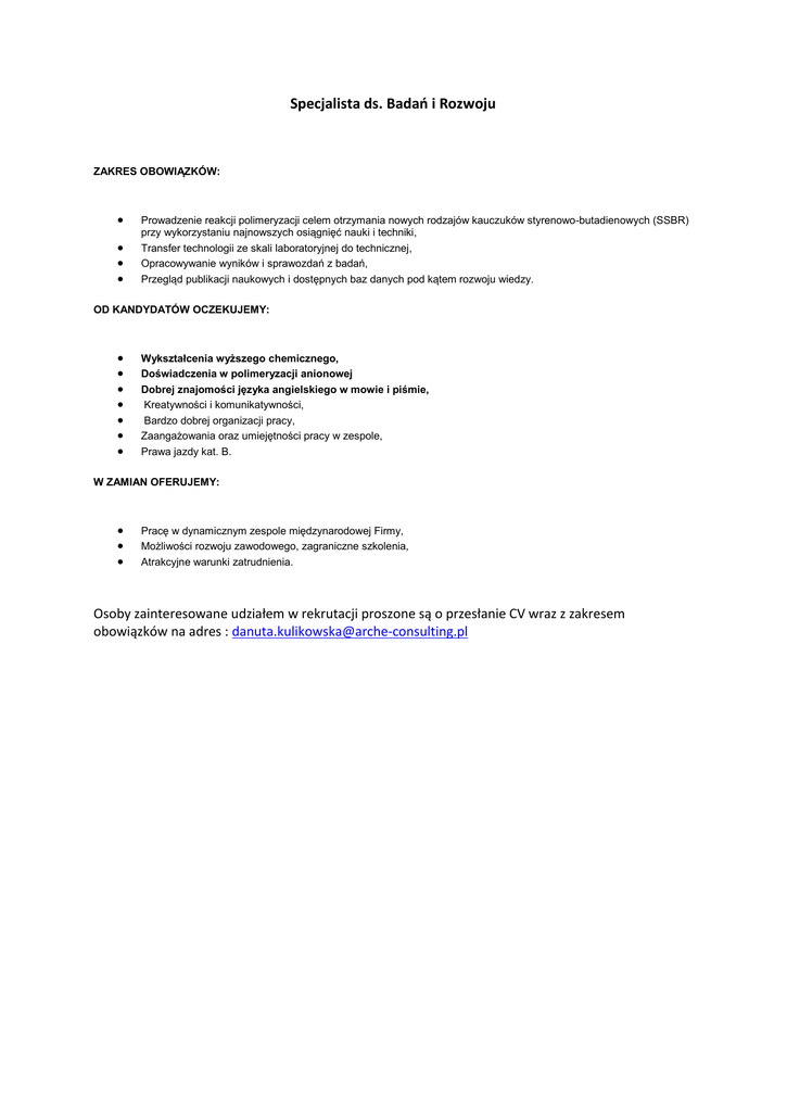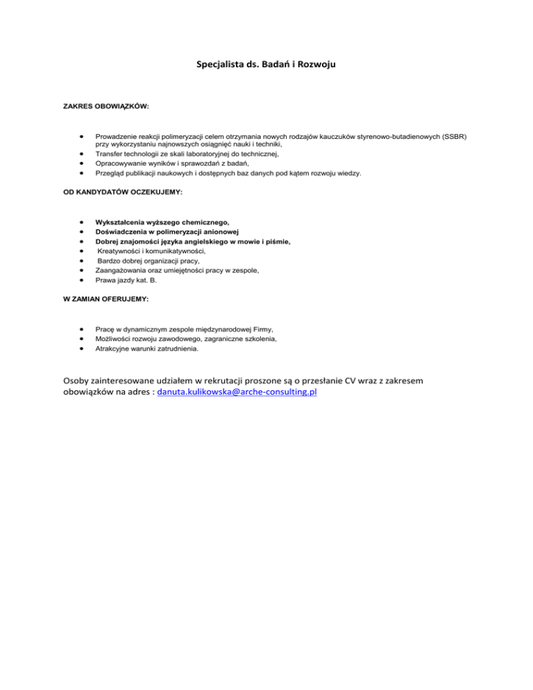 Specjalista ds. Badań i Rozwoju ZAKRES OBOWIĄZKÓW: Prowadzenie reakcji polimeryzacji celem otrzymania nowych rodzajów kauczuków styrenowo-butadienowych (SSBR) przy wykorzystaniu najnowszych osiągnięć nauki i techniki, Transfer technologii ze skali laboratoryjnej do technicznej, Opracowywanie wyników i sprawozdań z badań, Przegląd publikacji naukowych i dostępnych baz danych pod kątem rozwoju wiedzy. OD KANDYDATÓW OCZEKUJEMY: Wykształcenia wyższego chemicznego, Doświadczenia w polimeryzacji anionowej Dobrej znajomości języka angielskiego w mowie i piśmie, Kreatywności i komunikatywności, Bardzo dobrej organizacji pracy, Zaangażowania oraz umiejętności pracy w zespole, Prawa jazdy kat. B. W ZAMIAN OFERUJEMY: Pracę w dynamicznym zespole międzynarodowej Firmy, Możliwości rozwoju zawodowego, zagraniczne szkolenia, Atrakcyjne warunki zatrudnienia. Osoby zainteresowane udziałem w rekrutacji proszone są o przesłanie CV wraz z zakresem obowiązków na adres : [email protected]