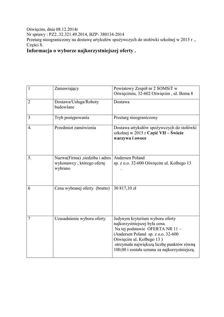 Oświęcim, dnia 08.12.2014r Nr sprawy : PZ2..32.321.49.2014, BZP- 380134-2014 Przetarg nieograniczony na dostawę artykułów spożywczych do stołówki szkolnej w 2015 r ., Części 8. Informacja o wyborze najkorzystniejszej oferty . 1 Zamawiający Powiatowy Zespół nr 2 SOMSiT w Oświęcimiu, 32-602 Oświęcim , ul. Bema 8 2 Dostawa/Usługa/Roboty budowlane Dostawa 3 Tryb postępowania Przetarg nieograniczony 4. Przedmiot zamówienia Dostawa artykułów spożywczych do stołówki szkolnej w 2015 r Część VII – Świeże warzywa i owoce 5. Nazwa(Firma) ,siedziba i adres Andersen Poland wykonawcy , którego ofertę sp. z o.o. 32-600 Oświęcim ul. Kolbego 13 wybrano . 6 Cena wybranej oferty (brutto) 30 817,10 zł 7 Uzasadnienie wyboru oferty Jedynym kryterium wyboru oferty najkorzystniejszej była cena. Na tej podstawie OFERTA NR 11 – (Andersen Poland sp. z o.o. 32-600 Oświęcim ul. Kolbego 13 ) otrzymała największą liczbę punktów równą 100,00 i została uznana za najkorzystniejszą. 8 Nazwa (firmy ), siedziby i adresy , wykonawców , którzy złożyli oferty ze streszczeniem oceny i porównania złożonych ofert zawierających punktacje przyznana oferentom w każdym kryterium oceny ofert i łączną punktację. OFERTA NR 6 – F.H.U. GLOSTER – Marzena Suska Czulów 102, 32-060 Liszki Oferent wykluczony ,oferta odrzucona, cena oferty nie podlega przeliczeniu. OFERTA NR 11 – Andersen Poland sp. z o.o. 32-600 Oświęcim ul. Kolbego 13 Liczba przyznanych punktów – 100,00 pkt OFERTA NR 12 - F.H.U Mega Marek Gaj ul. Legionów Polskich 21 A 32-065 Krzeszowice Liczba przyznanych punktów – 91,97 pkt 9 Data zamieszczenia informacji 09.12.2014r. ZATWIERDZAM: Jacek Stoch – dyrektor szkoły