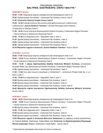PROGRAM TARGÓW BALTPIEK, GASTROEXPO, CIEPŁY BAŁTYK * 16.02.2011 (środa) 10.00 - 17.00 Ekspozycja targowa udostępniona dla zwiedzających /hala 3 i 5/ 10.50 Ogniste pokazy barmańskie – mistrzowie Flair Academy /scena, hala 5/ 11.00 Ceremonia otwarcia Targów /scena, hala 5/ 10:30 - 14:30 II edycja konkursu dla uczniów szkół gastronomicznych, cukierniczych i piekarniczych „Kuźnia Słodkich Talentów” o Puchar Starszego Cechu Piekarzy i Cukierników w Gdańsku /hala 5/ 11.30 - 16.30 Forum Kulinarne Stowarzyszenia Polskich Kucharzy i Cukierników Region Pomorski – Trendy kulinarne w Gastronomii Światowej /hala 5/ 12.00 - 13.30 Kurs degustacji wina – Degustator /hala 3, sala 1/ 12.30 Ogniste pokazy barmańskie – mistrzowie Flair Academy /hala 3/ 14.00 Ogniste pokazy barmańskie – mistrzowie Flair Academy /hala 3/ 16.00 Ogniste pokazy barmańskie – mistrzowie Flair Academy /hala 3/ 16:30 Wręczenie nagród w konkursie „Kuźnia Słodkich Talentów” /scena, hala 5/ 17.02.2011 (czwartek) 10.00 - 17.00 Ekspozycja targowa udostępniona dla zwiedzających /hala 3 i 5/ 10.00 - 16.30 Forum Kulinarne Stowarzyszenia Polskich Kucharzy i Cukierników Region Pomorski - Trendy kulinarne w Gastronomii Światowej /hala 5/ 10.00 - 14.30 I edycja Ogólnopolskiej Sztafety Kulinarnej Młodych Kucharzy, prowadzenie Krzysztof Skiba, org. Stowarzyszenia Polskich Kucharzy i Cukierników Region Pomorski /hala 5/ 11.00 Ogniste pokazy barmańskie – mistrzowie Flair Academy /hala 3/ 11.00 - 13.00 Czy warto jeszcze inwestować w hotelarstwo? – seminarium Projekt Hotel Sp. z o.o. /hala 3, sala 1/ 13.30 - 15.00 Kurs degustacji wina – Degustator /hala 3, sala 1/ 13.00 Ogniste pokazy barmańskie – mistrzowie Flair Academy /hala 3/ 14.20 Ogniste pokazy barmańskie – mistrzowie Flair Academy /hala 3/ 15.40 Ogniste pokazy barmańskie – mistrzowie Flair Academy /scena, hala 5/ 16.00 Wręczenie nagród zwycięzcom Ogólnopolskiej Sztafety Kulinarnej Młodych Kucharzy /scena, hala 5/ 18.02.2011 (piątek) 10.00 - 16.00 Ekspozycja targowa udostępniona dla zwiedzających /hala 3 i 5/ 10.00 - 15.00 Forum Kulinarne Stowarzyszenia Polskich Kucharzy i Cukierników Region Pomorski – Trendy kulinarne w Gastronomii Światowej /hala 5/ 11.00 Ogniste pokazy barmańskie – mistrzowie Flair Academy /hala 3/ 12.00 - 13.30 Kurs degustacji wina – Degustator /hala 3, sala 1/ 12.40 Ogniste pokazy barmańskie – mistrzowie Flair Academy /hala 3/ 13.50 Ogniste pokazy barmańskie – mistrzowie Flair Academy /scena, hala 5/ 14.00 Wręczenie nagród w Konkursie Mercurius Gedanensis na najlepszy produkt prezentowany na Targach Baltpiek, Gastroexpo, Ciepły Bałtyk oraz Konkursie na Najatrakcyjniejszą Ekspozycję Stoiska targowego: Baltpiek, Gastroexpo, Ciepły Bałtyk /scena, hala 5/ * Organizatorzy zastrzegają sobie prawo do zmian w programie