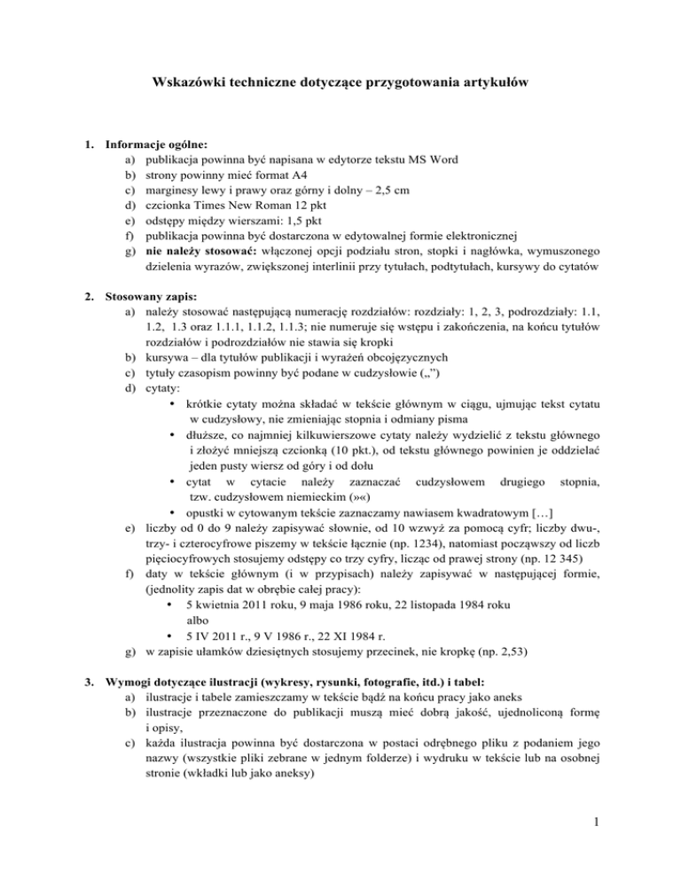 Wskazówki techniczne dotyczące przygotowania artykułów 1. Informacje ogólne: a) publikacja powinna być napisana w edytorze tekstu MS Word b) strony powinny mieć format A4 c) marginesy lewy i prawy oraz górny i dolny – 2,5 cm d) czcionka Times New Roman 12 pkt e) odstępy między wierszami: 1,5 pkt f) publikacja powinna być dostarczona w edytowalnej formie elektronicznej g) nie należy stosować: włączonej opcji podziału stron, stopki i nagłówka, wymuszonego dzielenia wyrazów, zwiększonej interlinii przy tytułach, podtytułach, kursywy do cytatów 2. Stosowany zapis: a) należy stosować następującą numerację rozdziałów: rozdziały: 1, 2, 3, podrozdziały: 1.1, 1.2, 1.3 oraz 1.1.1, 1.1.2, 1.1.3; nie numeruje się wstępu i zakończenia, na końcu tytułów rozdziałów i podrozdziałów nie stawia się kropki b) kursywa – dla tytułów publikacji i wyrażeń obcojęzycznych c) tytuły czasopism powinny być podane w cudzysłowie („”) d) cytaty: • krótkie cytaty można składać w tekście głównym w ciągu, ujmując tekst cytatu w cudzysłowy, nie zmieniając stopnia i odmiany pisma • dłuższe, co najmniej kilkuwierszowe cytaty należy wydzielić z tekstu głównego i złożyć mniejszą czcionką (10 pkt.), od tekstu głównego powinien je oddzielać jeden pusty wiersz od góry i od dołu • cytat w cytacie należy zaznaczać cudzysłowem drugiego stopnia, tzw. cudzysłowem niemieckim (»«) • opustki w cytowanym tekście zaznaczamy nawiasem kwadratowym […] e) liczby od 0 do 9 należy zapisywać słownie, od 10 wzwyż za pomocą cyfr; liczby dwu-, trzy- i czterocyfrowe piszemy w tekście łącznie (np. 1234), natomiast począwszy od liczb pięciocyfrowych stosujemy odstępy co trzy cyfry, licząc od prawej strony (np. 12 345) f) daty w tekście głównym (i w przypisach) należy zapisywać w następującej formie, (jednolity zapis dat w obrębie całej pracy): • 5 kwietnia 2011 roku, 9 maja 1986 roku, 22 listopada 1984 roku albo • 5 IV 2011 r., 9 V 1986 r., 22 XI 1984 r. g) w zapisie ułamków dziesiętnych stosujemy przecinek, nie kropkę (np. 2,53) 3. Wymogi dotyczące ilustracji (wykresy, rysunki, fotografie, itd.) i tabel: a) ilustracje i tabele zamieszczamy w tekście bądź na końcu pracy jako aneks b) ilustracje przeznaczone do publikacji muszą mieć dobrą jakość, ujednoliconą formę i opisy, c) każda ilustracja powinna być dostarczona w postaci odrębnego pliku z podaniem jego nazwy (wszystkie pliki zebrane w jednym folderze) i wydruku w tekście lub na osobnej stronie (wkładki lub jako aneksy) 1 d) fotografie – pliki o rozdzielczości nie mniejszej niż 300 dpi przy wymaganych wymiarach reprodukcji e) tytuł umieszczamy nad ilustracją, tabelą (np. Rys. 1. Tytuł, Tab. 1. Tytuł), po tytule nie stawiamy kropki, źródło umieszczamy pod ilustracją f) spisy ilustracji (wykresów, schematów, rysunków) i tabel (jeśli występują w publikacji) powinny zawierać kolejny numer ilustracji (odpowiednio: tabeli, wykresu, schematu, rysunku), ich tytuły oraz numery stron, na których się znajdują 4. Wymogi związane z przypisami bibliograficznymi: a) przypisy należy umieszczać u dołu stron i stosować numerację ciągłą w ramach artykułu. Wielkość pisma 10 pkt., czcionka Times New Roman, po przypisie umieszczamy kropkę b) przypisy należy wstawiać automatycznie przez funkcję „wstaw przypis” bez dodatkowej spacji c) najważniejsza jest konsekwencja – w całej publikacji należy stosować jednolity zapis bibliograficzny. Należy stosować jednolicie polskie oznaczenia: Tamże, Tenże, Taż, dz. cyt. (dzieło cytowane) d) w przypisach stosujemy następujące zapisy: - wydawnictwo zwarte: inicjał imienia i nazwisko autora (jeżeli liczba autorów nie przekracza trzech, podaje się wszystkie nazwiska, jeśli autorów jest więcej niż trzech, należy zacytować pierwszego z nich i dodać „i in.”), tytuł kursywą, wydawnictwo, miejsce i rok wydania, strona. (np. R. Schuman, Dla Europy, Wydawnictwo Znak, Kraków 2009, s. 11. np. M. Kuziak i in., Jak mówić, jak pisać?, Wydawnictwo Park, Bielsko-Biała 2005, s. 572-577.); - artykuł z wydawnictwa zwartego: inicjał imienia i nazwisko autora, tytuł kursywą [w:] tytuł kursywą, redaktor naczelny publikacji – inicjał imienia i nazwisko, wydawnictwo, miejsce i rok wydania, strona. (np. H. Bereza, Parodia wobec struktury groteski [w:] Styl i kompozycja, red. J. Trzynaldowski, Ossolineum, Wrocław 1965, s. 120.); - artykuł w czasopiśmie: inicjał imienia i nazwisko autora, tytuł kursywą, nazwa czasopisma w cudzysłowie rok, tom (rocznik), nr, strona artykułu. (np. K. Barańska, Dom – muzeum. Muzeum – dom, „Konteksty” 2010, R. LXIV, nr 2-3, s. 214-220.); - publikacja online: zasady tworzenia przypisów jak wyżej, dodatkowo należy podać datę dostępu oraz źródło. (np. M. Bobińska, Ryzykowny kurs, „Gazeta Prawna” [online], 3 czerwca 2002 [dostęp: 7 czerwca 2002, < http://edgp.gazetaprawna.pl/index.php?act=archive>].) - zapis w Dzienniku Ustaw (Rzeczpospolitej Polskiej): np. Ustawa z dnia 27 lipca 2005 r. – Prawo o szkolnictwie wyższym (Dz. U. Nr 164, poz. 1365, z późn. zm.), ale: Ustawa z dnia 5 sierpnia 2010 r. o ochronie informacji niejawnych (Dz. U. Nr 182, poz. 1228) e) ważniejsze skróty stosowane w zapisie bibliograficznym: cz. – część t. – tom nr – numer vol. – wolumin r. – rocznik [w:] – zamieszczono w: red. – redaktor naukowy wyd. – wydanie s. – strona z. – zeszyt 2 5. Wymogi dotyczące końcowego spisu literatury. W końcowym spisie literatury przyjmujemy układ alfabetyczny według nazwisk autorów. Poszczególne pozycje literatury zaczynają się od nazwiska autora i inicjału imienia. Prace zbiorowe umieszczamy zgodnie z układem alfabetycznym, biorąc za punkt wyjścia pierwszą literę tytułu; nie stosujemy numeracji poszczególnych pozycji literatury, np.: Bereza H., Parodia wobec struktury