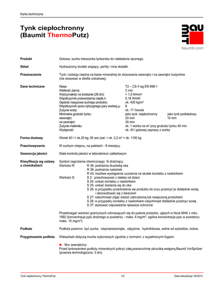 Karta techniczna Tynk ciepłochronny (Baumit ThermoPutz) Produkt Gotowa, sucha mieszanka tynkarska do nakładania ręcznego. Skład Hydrauliczny środek wiążący, perlity i inne dodatki. Przeznaczenie Tynk i izolacja cieplna na bazie mineralnej do stosowania wewnątrz i na zewnątrz budynków (nie stosować w strefie cokołowej). Dane techniczne Klasa: Wielkość ziarna: Wytrzymałość na ściskanie (28 dni): Współczynnik przewodzenia ciepła λ: Gęstość nasypowa suchego produktu: Współczynnik oporu dyfuzyjnego pary wodnej µ: Zużycie wody: Minimalna grubość tynku: wewnątrz: na zewnątrz: Zużycie materiału: Wydajność: Forma dostawy Worek 40 l = ok.20 kg; 55 wor./pal. = ok. 2,2 m3 = ok. 1100 kg Przechowywanie W suchym miejscu, na paletach - 9 miesięcy. Gwarancja jakości Stała kontrola jakości w laboratorium zakładowym. Klasyfikacja wg ustawy o chemikaliach Symbol zagrożenia chemicznego: Xi drażniący. Wartości R: R 36: podrażnia śluzówkę oka R 38: podrażnia naskórek R 43: możliwe wystąpienie uczulenia na skutek kontaktu z naskórkiem Wartości S: S 2: przechowywać z daleka od dzieci S 24: unikać kontaktu z naskórkiem S 25: unikać dostania się do oka S 26: w przypadku przedostania się produktu do oczu przemyć je dokładnie wodą i skonsultować się z lekarzem S 27: natychmiast zdjąć odzież zabrudzoną lub nasączoną produktem S 28: w przypadku kontaktu z naskórkiem natychmiast dokładnie przemyć wodą S 37: stosować odpowiednie rękawice ochronne T2 – CS II wg EN 998-1 2 mm > 1,5 N/mm2 0,18 W/mK ok. 400 kg/m3 8 ok. 17 l/worek jako tynk ciepłochronny jako tynk podkładowy 20 mm 10 mm 35 mm ok. 1 worka na m2 przy grubości tynku 40 mm ok. 40 l gotowej zaprawy z worka Przestrzegać wartości granicznych odnoszących się do pylenia produktu, ujętych w liście MAK z roku 1992 (koncentracja pyłu drobnego w powietrzu - maks. 6 mg/m³, ogólna koncentracja pyłu w powietrzu: maks. 15 mg/m³). Podłoże Podłoże powinno być suche, nieprzemarznięte, odpylone, hydrofobowe, wolne od wykwitów, nośne. Przygotowanie podłoża Wskazówki dotyczą murów wykonanych zgodnie z normami, z wypełnionymi fugami. Mur zewnętrzny: Przed tynkowaniem podłoży mineralnych pokryć całą powierzchnię obrzutką wstępną Baumit VorSpritzer (przerwa technologiczna: 3 dni). Tynk ciepłochronny ThermoPutz 1/2 Data aktualizacji: 02/2014 Karta techniczna Mur wewnętrzny: na płytach z wełny drzewnej, lekkich płytach wiórowo-cementowych jak również na pustakach wiórowocementowych i płytach zalecane jest wykonanie zbrojonej obrzutki Baumit VorSpritzer (przerwa technologiczna 21 dni). W przypadku innych podłoży mineralnych zaleca się wykonanie obrzutki Baumit VorSpritzer (przerwa technologiczna: 3 dni). Obróbka Betoniarka wolnospadowa - dodać 17 litrów wody na każdy worek zaprawy. Przestrzegać czasu mieszania 3 - 5 minut. Zawsze wsypywać całą zawartość worka. Na kilka godzin przed rozpoczęciem tynkowania zwilżyć gruntownie powierzchnię przeznaczoną do tynkowania. Narzucać tynk kielnią, przecierać wilgotną łatą drewnianą, nie wygładzać i nie zacierać! Przy grubościach tynku do 3 cm - nakładać tynk jednowarstwowo, przy większych grubościach lub w przypadku różnicy grubości tynku - wielowarstwowo. Pierwsza warstwa powinna wstępnie stwardnieć przed nałożeniem następnych warstw tynku. Wskazówki: Nie nadaje się do stosowania na strefy cokołowe i narażone na działanie wody odpryskowej jak również jako podłoże pod płytki ceramiczne. Szczeliny instalacyjne, fugi, wgłębienia i dziury w murze należy przed położeniem tynku wypełnić tynkiem ciepłochronnym Baumit ThermoPutz, przestrzegając przerwy technologicznej. Temperatura powietrza i podłoża w trakcie obróbki nie może być niższa niż +5°C i wyższa niż + 25°C. Nie pozwalać na bezpośrednie nagrzewanie otynkowanego muru. W przypadku stosowania nagrzewnic wymagana jest dobra wentylacja (niebezpieczeństwo karbonatyzacji). Świeżo otynkowaną powierzchnię utrzymywać w stanie wilgotnym przez 2 dni po tynkowaniu. Przerwa technologiczna - 7 dni na każdy cm grubości tynku. Warstwy wierzchnie Na tynk ciepłochronny Baumit z warstwą pośrednią wykonaną z zaprawy klejowo-szpachlowej Baumit ProContatct z zatopioną w niej siatką z włókna szklanego Baumit StarTex: tynk silikatowy Baumit SilikatTop na podkładzie gruntującym Baumit UniPrimer; tynk silikonowy Baumit SilikonTop na podkładzie gruntującym Baumit UniPrimer tynk dekoracyjny Baumit NanoporTop na podkładzie gruntującym Baumit UniPrimer tynk mineralny Baumit EdelPutz Spezial na podkładzie gruntującym Baumit UniPrimer Nasze zalecenia w zakresie stosowanych technik, przekazywane słowem i pismem w celu wsparcia nabywcy (użytkownika) opracowane w oparciu o nasze doświadczenia i aktualny stan wiedzy są niewiążące i nie uzasadniają prawnego stosunku umownego oraz żadnych zobowiązań ubocznych z tytułu umowy kupna (sprzedaży). Nie zwalniają one nabywcy od sprawdzenia na własną odpowiedzialność przydatności naszych produktów do przewidzianego zastosowania. Należy przestrzegać ogólnych zasad techniki budowlanej. Zastrzegamy sobie możliwość zmian, które służą technicznemu postępowi i ulepszeniu produktu lub jego zastosowaniu. Wraz z ukazaniem się niniejszej informacji technicznej wcześniejsze jej wersje tracą ważność. Najbardziej aktualne informacje znajdziecie Państwo na naszych stronach internetowych. Poza tym obowiązują nasze "Ogólne warunki umów" znajdujące się w katalogach produktów. Nasza gęsta sieć przedstawicielstw gwarantuje szybkie doradztwo i dostawy. Dodatkowych informacji prosimy zasięgnąć u najbliższego przedstawiciela regionalnego. Tynk ciepłochronny ThermoPutz 2/2 Data aktualizacji: 02/2014