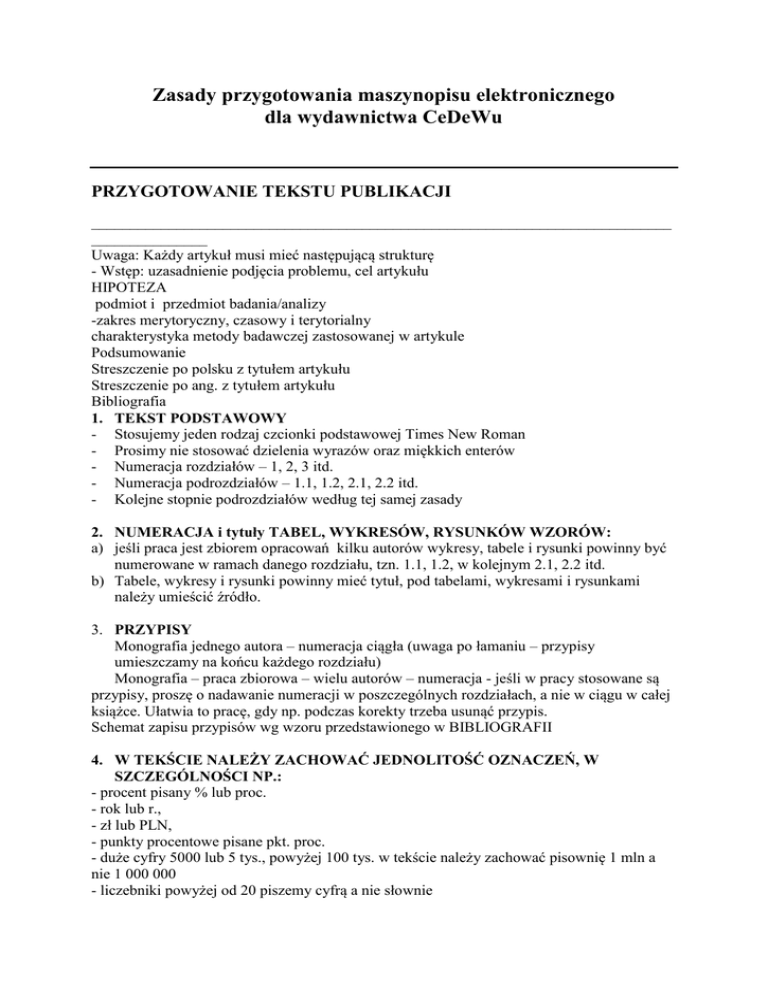 Zasady przygotowania maszynopisu elektronicznego dla wydawnictwa CeDeWu PRZYGOTOWANIE TEKSTU PUBLIKACJI ___________________________________________________________________________ _______________ Uwaga: Każdy artykuł musi mieć następującą strukturę - Wstęp: uzasadnienie podjęcia problemu, cel artykułu HIPOTEZA podmiot i przedmiot badania/analizy -zakres merytoryczny, czasowy i terytorialny charakterystyka metody badawczej zastosowanej w artykule Podsumowanie Streszczenie po polsku z tytułem artykułu Streszczenie po ang. z tytułem artykułu Bibliografia 1. TEKST PODSTAWOWY - Stosujemy jeden rodzaj czcionki podstawowej Times New Roman - Prosimy nie stosować dzielenia wyrazów oraz miękkich enterów - Numeracja rozdziałów – 1, 2, 3 itd. - Numeracja podrozdziałów – 1.1, 1.2, 2.1, 2.2 itd. - Kolejne stopnie podrozdziałów według tej samej zasady 2. NUMERACJA i tytuły TABEL, WYKRESÓW, RYSUNKÓW WZORÓW: a) jeśli praca jest zbiorem opracowań kilku autorów wykresy, tabele i rysunki powinny być numerowane w ramach danego rozdziału, tzn. 1.1, 1.2, w kolejnym 2.1, 2.2 itd. b) Tabele, wykresy i rysunki powinny mieć tytuł, pod tabelami, wykresami i rysunkami należy umieścić źródło. 3. PRZYPISY Monografia jednego autora – numeracja ciągła (uwaga po łamaniu – przypisy umieszczamy na końcu każdego rozdziału) Monografia – praca zbiorowa – wielu autorów – numeracja - jeśli w pracy stosowane są przypisy, proszę o nadawanie numeracji w poszczególnych rozdziałach, a nie w ciągu w całej książce. Ułatwia to pracę, gdy np. podczas korekty trzeba usunąć przypis. Schemat zapisu przypisów wg wzoru przedstawionego w BIBLIOGRAFII 4. W TEKŚCIE NALEŻY ZACHOWAĆ JEDNOLITOŚĆ OZNACZEŃ, W SZCZEGÓLNOŚCI NP.: - procent pisany % lub proc. - rok lub r., - zł lub PLN, - punkty procentowe pisane pkt. proc. - duże cyfry 5000 lub 5 tys., powyżej 100 tys. w tekście należy zachować pisownię 1 mln a nie 1 000 000 - liczebniki powyżej od 20 piszemy cyfrą a nie słownie - waluty oznaczamy – USD, EUR lub jeśli nie ma tych oznaczeń dużo – euro, dolar, prosimy nie wstawiać symboli graficznych walut. 5. WYPUNKTOWANIA – a) Ujednolicenie oznaczeń np. 1. lub 1) lub – lub i konsekwentne stosowanie tego w całej pracy. b) Po wypunktowaniach należy jednolicie w całym tekście stosować przecinek lub średnik. c) Jeśli w wypunktowaniach są całe zdania, należy zaczynać wielką literą i kończyć kropką. 6. SŁOWA OBCOJĘZYCZNE – wyróżniamy kursywą (italic). 7. TYTUŁY INNYCH PRAC, KSIĄŻEK PODANE W TEKŚCIE – wyróżniamy kursywą (italic) bez cudzysłowu. 8. BIBLIOGRAFIA I PRZYPISY Bibliografia powinna być ułożona alfabetycznie, zaczynając od nazwiska autora lub redaktora przy pracy zbiorowej Należy stosować ujednolicony sposób prezentowania bibliografii - poniżej przykłady: Czornik M., Miasto. Ekonomiczne aspekty funkcjonowania, Akademia Ekonomiczna w Katowicach, Katowice 2008, s. 15-16. Dolnicki B. (red.), Ustawa o samorządzie powiatowym. Komentarz, Wolters Kluwer Business, Warszawa 2007, s. 588. Gorzelak G., Miasto jako przedmiot badań ekonomii [w:] B. Jałowiecki (red.), Miasto jako przedmiot badań naukowych w początkach XXI wieku, Wydawnictwo Naukowe Scholar, Warszawa 2008, s. 90. Kowalski P., Finansowe podstawy działalności samorządu terytorialnego [w:] T. Markowski, D. Stawasz (red.), Ekonomiczne i środowiskowe aspekty zarządzania rozwojem miast i regionów, Wydawnictwo Uniwersytetu Łódzkiego, Łódź 2001, s. 43-49. Można źródła internetowe podać oddzielnie na końcu bibliografii. ___________________________________________________________________________ ______________ ELEMENTY GRAFICZNE PUBLIKACJI ___________________________________________________________________________ ______________ 1. TABELE a) Tabele powinny mieć szerokość max. 12,9 cm, muszą być aktywne, użyty kolor czarny i 2 stopnie szarości. b) Tabele powinny być zrobione w Wordzie lub Excelu i być aktywne w przesyłanym pliku c) Nie przyjmujemy do druku tabel, które są ściągnięte z Internetu lub innych źródeł jako obrazki lub poskanowane z innych książek!!!!! 2. WYKRESY, RYSUNKI, SCHEMATY a) Wykresy i rysunki, schematy – ramka otaczająca elementy graficzne powinna mieć szerokość max. 12,9 cm, b) Wykresy i rysunki, schematy muszą być aktywne (to znaczy że wydawnictwo w razie czego będzie mogło je modyfikować) c) książka jest czarno-biała – w wykresach, schematach, rysunkach , użyty może być jeden kolor – czarny i ew. stopnie szarości (procent z czarnego). Przy wykresach np. z liniami oznaczającymi wartość nie powinno być więcej niż 6-7 linii na wykresie, gdyż przy większej ilości w jednym kolorze wykres jest już nieczytelny. d) Odcienie szarości używane w rysunkach i innych elementach graficznych powinny być sprawdzone z tekstem, aby nie występowała sytuacja, że w tekście opisywany jest kolor np. różowy a na rysunku jest szarość. e) Nie przyjmujemy do druku wykresów, rysunków, schematów, które są ściągnięte z Internetu lub innych źródeł jako obrazki, lub poskanowane z innych książek!!!!! 3. WZORY a) Wzory – sposób przedstawienia wzorów musi być jednolity w całym tekście, b) wzory występujące w tekście być aktywne w Wordzie wykonane w Math Type c) oznaczenia użyte we wzorach, a następnie w tekście muszą być pisane kursywą (italic) 4. ZRZUTY Z EKARNU STRON INTERNETOWYCH I PROGRAMÓW KOMPUTEROWYCH a) jeśli w książce występują zrzuty z ekranu powinny one zostać dostarczone w oddzielnym pliku – min. rozdzielczość 1200x800, im wyższa tym lepsza 5. GRAFIKI, FOTOGRAFIE, MAPY Fotografie, grafiki, mapy powinny one zostać dostarczone w pliku JPG, PNG, TIFF, EPS (ilustracje wektorowe) o rozdzielczości 2400 lpi na 600 dpi (min. 300 dpi) lub eps w odcieniach szarości!!!! Dodatkowe informacje do redakcji: 1. Sprawdzać, jednolitość tytułów w 