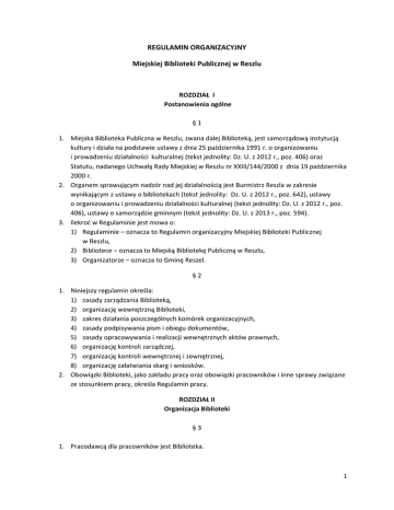 REGULAMIN ORGANIZACYJNY Miejskiej Biblioteki Publicznej w Reszlu ROZDZIAŁ I Postanowienia ogólne §1 1. Miejska Biblioteka Publiczna w Reszlu, zwana dalej Biblioteką, jest samorządową instytucją kultury i działa na podstawie ustawy z dnia 25 października 1991 r. o organizowaniu i prowadzeniu działalności kulturalnej (tekst jednolity: Dz. U. z 2012 r., poz. 406) oraz Statutu, nadanego Uchwałą Rady Miejskiej w Reszlu nr XXIII/144/2000 z dnia 19 października 2000 r. 2. Organem sprawującym nadzór nad jej działalnością jest Burmistrz Reszla w zakresie wynikającym z ustawy o bibliotekach (tekst jednolity: Dz. U. z 2012 r., poz. 642), ustawy o organizowaniu i prowadzeniu działalności kulturalnej (tekst jednolity: Dz. U. z 2012 r., poz. 406), ustawy o samorządzie gminnym (tekst jednolity: Dz. U. z 2013 r., poz. 594). 3. Ilekroć w Regulaminie jest mowa o: 1) Regulaminie – oznacza to Regulamin organizacyjny Miejskiej Biblioteki Publicznej w Reszlu, 2) Bibliotece – oznacza to Miejską Bibliotekę Publiczną w Reszlu, 3) Organizatorze – oznacza to Gminę Reszel. §2 1. Niniejszy regulamin określa: 1) zasady zarządzania Biblioteką, 2) organizację wewnętrzną Biblioteki, 3) zakres działania poszczególnych komórek organizacyjnych, 4) zasady podpisywania pism i obiegu dokumentów, 5) zasady opracowywania i realizacji wewnętrznych aktów prawnych, 6) organizację kontroli zarządczej, 7) organizację kontroli wewnętrznej i zewnętrznej, 8) organizację załatwiania skarg i wniosków. 2. Obowiązki Biblioteki, jako zakładu pracy oraz obowiązki pracowników i inne sprawy związane ze stosunkiem pracy, określa Regulamin pracy. ROZDZIAŁ II Organizacja Biblioteki §3 1. Pracodawcą dla pracowników jest Biblioteka. 1 2. Biblioteką zarządza jednoosobowo, reprezentuje ją na zewnątrz i odpowiada za całokształt jej działalności dyrektor. 3. Dyrektor podlega służbowo Burmistrzowi Reszla. 4. Podczas nieobecności Dyrektora zastępuje go Główny Księgowy lub inny wyznaczony pracownik, na podstawie odrębnego upoważnienia. 5. Dla wykonywania zadań Biblioteki tworzy się działy, samodzielne stanowiska pracy w Bibliotece Głównej oraz filie biblioteczne. 6. Dyrektor sprawuje nadzór nad działalnością utworzonych w Bibliotece komórek organizacyjnych. §4 1. Struktura organizacyjna Biblioteki określona jest w załączniku nr 1 do Regulaminu. 2. W zależności od potrzeb oraz możliwości finansowych, organizacyjnych i warunków lokalowych, w Bibliotece można tworzyć odrębne działy, np.: dział gromadzenia i opracowania zbiorów, czytelnie ogólne czasopism, pracownie multimedialne. 3. Organizację wewnętrzną Biblioteki określa schemat organizacyjny, stanowiący załącznik nr 2 do Regulaminu, ustalający podległość służbową poszczególnych komórek organizacyjnych. §5 1. Biblioteka Główna mieści się w Reszlu przy ul. Kolejowej 2a i jest siedzibą: 1) Dyrektora, 2) Głównego Księgowego, 3) Informatyka, 4) Wypożyczalni i Czytelni dla Dorosłych, 5) Oddziału dla Dzieci 2. Filie Biblioteczne zlokalizowane są w miejscowościach: Pilec 29 i Św. Lipka 26 ROZDZIAŁ III Zarządzanie Biblioteką §6 ZAKRES DZIAŁANIA DYREKTORA 1. Na czele Biblioteki stoi Dyrektor, który kieruje jej działalnością, reprezentuje ją na zewnątrz, oraz wykonuje uprawnienia pracodawcy i jest zwierzchnikiem służbowym w stosunku do zatrudnionych w niej pracowników. 2. Dyrektor odpowiada w szczególności za: a) realizację zadań statutowych Biblioteki i opracowanie strategii rozwoju Biblioteki, b) współpracę z władzami samorządowymi, c) gospodarkę finansową, w tym gospodarowanie mieniem Biblioteki, d) politykę kadrową, e) warunki pracy, bhp, zabezpieczenie ppoż., oraz inne zadania wynikające z przepisów szczególnych, f) ochrony danych osobowych, 2 g) udostępniania informacji publicznej. §7 Dyrektor ponosi odpowiedzialność za działalność Biblioteki, w tym w szczególności za: 1. W zakresie organizacji i funkcjonowania Biblioteki: 1) opracowanie i realizację planów działalności podstawowej i finansowej oraz za sprawozdawczość w tym zakresie, 2) podejmowanie decyzji dotyczących rozwoju lub zmian w sieci, 3) tworzenie, łączenie i likwidowanie komórek organizacyjnych Biblioteki oraz ustalanie ich organizacji wewnętrznej, z zastrzeżeniem kompetencji Organizatora w tym zakresie, 4) wydawanie regulaminów i zarządzeń we wszystkich dziedzinach organizacji pracy, obowiązków pracowników i zasad funkcjonowania Biblioteki, w tym w zakresu ochrony danych osobowych, 5) zatwierdzanie planów inwestycyjnych, 6) prawidłową organizację pracy w Bibliotece, 7) imienne upoważnianie pracowników do wykonywania określonych zadań, 8) powoływanie stałych komisji i ustalanie ich składu osobowego, 9) kontrole, 10) rozpatrywanie skarg na podległych pracowników, 11) egzekwowanie od podległych pracowników obowiązku udzielenia w formie ustnej lub pisemnej niezbędnych informacji i wyjaśnień, jak również udostępnienia do wglądu dokumentów i wyliczeń będących źródłem tych informacji, 12) egzekwowanie od pracowników usunięcia w wyznaczonym terminie nieprawidłowości dotyczących m.in. przyjmowania, wystawiania, obiegu i kontroli dokumentów 13) występowanie do Organizatora w sprawach dotyczących funkcjonowania Biblioteki, 14) stosowanie zarządzeń, instrukcji, wytycznych i poleceń Organizatora, 15) realizację zadań wynikających z innych aktów prawnych, 2. W zakresie organizacji pracy i spraw pracowniczych: 1) zatrudnianie, awansowanie i zwalnianie pracowników oraz wykonywanie wobec nich innych uprawnień i obowiązków, jakie przysługują pracodawcy, 2) wyróżnianie, nagradzanie lub karanie pracowników zgodnie z Kodeksem Pracy, Regulaminem pracy, Regulaminem wynagradzania, 3) podział etatów na poszczególne komórki organizacyjne, 4) ustalanie zakresów obowiązków pracowników oraz trybu załatwiania spraw, 5) u