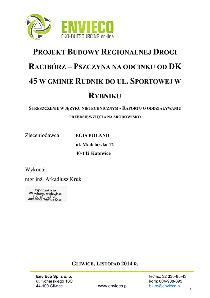 PROJEKT BUDOWY REGIONALNEJ DROGI RACIBÓRZ – PSZCZYNA NA ODCINKU OD DK 45 W GMINIE RUDNIK DO UL. SPORTOWEJ W RYBNIKU STRESZCZENIE W JĘZYKU NIETECHNICZNYM - RAPORTU O ODDZIAŁYWANIU PRZEDSIĘWZIĘCIA NA ŚRODOWISKO Zleceniodawca: EGIS POLAND ul. Modelarska 12 40-142 Katowice Wykonał: mgr inż. Arkadiusz Kruk GLIWICE, LISTOPAD 2014 R. EnviEco Sp. z o. o. ul. Konarskiego 18C 44-100 Gliwice www.envieco.pl tel/fax: 32 335-85-43 kom: 604-908-395 [email protected] 1 Przedmiotem opracowania jest wykonanie raportu oddziaływania na środowisko, dla przedsięwzięcia polegającego na projekcie budowie Regionalnej Drogi Racibórz–Pszczyna na odcinku od DK 45 w gminie Rudnik do ul. Sportowej w Rybniku. Zakres opracowania wynika z artykułu 66 ustawy o udostępnieniu informacji o środowisku i jego ochronie, udziale społeczeństwa w ochronie środowiska oraz o ocenach oddziaływania na środowisko z dnia 3 października 2008 r. (tekst jednolity: Dz. U. z 2013 r., poz. 1235, ze zmianami). Celem przedsięwzięcia jest projekt budowy Regionalnej Drogi Racibórz–Pszczyna na odcinku od DK 45 w gminie Rudnik do ul. Sportowej w Rybniku. Celem opracowania jest analiza możliwych wariantów przebiegu drogi regionalnej Racibórz – Pszczyna na odcinku od DK45 w gm. Rudnik do ul.Sportowej w Rybniku, wraz z oceną każdego wariantu i wskazaniem najkorzystniejszego. Wybrana na jego podstawie trasa drogowa będzie stanowić podstawę do dalszego opracowania Projektu koncepcyjnego rozwiązań technicznych a dalej projektu budowlanego oraz wykonawczego. Planowana do realizacji inwestycja, objęta przedkładanym wnioskiem, zgodnie z Rozporządzeniem Ministra Środowiska z dnia 9 listopada 2010 r. w sprawie przedsięwzięć mogących znacząco oddziaływać na środowisko (Dz. U. Nr 213, poz. 1397 z późniejszymi zmianami) kwalifikuje się do przedsięwzięć mogących zawsze znacząco oddziaływać na środowisko, ze względu na realizację następujących elementów inwestycji: §2 ust. 1 pkt. 32 – drogi inne niż wymienione w pkt 31, o nie mniej niż czterech pasach ruchu i długości nie mniejszej niż 10 km w jednym odcinku oraz zmiana przebiegu lub rozbudowa istniejącej drogi o dwóch pasach ruchu do co najmniej czterech pasów ruchu na długości nie mniejszej niż 10 km w jednym odcinku. Ponadto w ramach inwestycji planuje się realizację następujących przedsięwzięć mogących potencjalnie oddziaływać na środowisko: §3 ust. 1 pkt. 79 – sieci kanalizacyjne o całkowitej długości przedsięwzięcia nie mniejszej niż 1 km, z wyłączeniem ich przebudowy metodą bezywkopową oraz przyłączy do budynków. EnviEco Sp. z o. o. ul. Konarskiego 18C 44-100 Gliwice www.envieco.pl tel/fax: 32 335-85-43 kom: 604-908-395 [email protected] 2 § 3 ust. 1 pkt 7 - stacje elektroenergetyczne lub napowietrzne linie elektroenergetyczne, o napięciu znamionowym nie mniejszym niż 110kV, inne niż wymienione w § 2 ust. 1 pkt 6”. § 3 ust. 1 pkt 33 - instalacje do przesyłu gazu inne niż wymienione w § 2 ust. 1 pkt 21 oraz towarzyszące im tłocznie lub stacje redukcyjne, z wyłączeniem gazociągów o ciśnieniu nie większym niż 0,5 MPa i przyłączy do budynków…. § 3 ust. 1 pkt 65 - budowle przeciwpowodziowe, z wyłączeniem przebudowy wałów przeciwpowodziowych polegającej na doszczelnieniu korpusu wałów i ich podłoża, w celu ograniczenia możliwości ich rozmycia i przerwania w czasie przechodzenia wód powodziowych, a także regulacja wód lub ich kanalizacja rozumiana jako zagospodarowanie wód umożliwiające ich wykorzystanie do celów żeglugowych. § 3 ust. 1 pkt 67 - kanały w rozumieniu art. 9 ust. 1 pkt 5 ustawy z dnia 18 lipca 2001 r. - Prawo wodne. Zgodnie z zapisami ustawy z dnia 3 października 2008 r. o udostępnianiu informacji o środowisku i jego ochronie, udziale społeczeństwa w ochronie środowiska oraz o ocenach oddziaływania na środowisko (tekst jednolity: Dz. U. z 2013 r., poz. 1235, ze zmianami) dla ww. przedsięwzięć wymagane jest uzyskanie decyzji o środowiskowych uwarunkowaniach. Przedmiotowa inwestycja jest zaliczana do przedsięwzięć mogących zawsze znacząco oddziaływać na środowisko - §2 pkt 32 – drogi inne niż wymienione w pkt 31, o nie mniej niż czterech pasach ruchu, na łącznym odcinku nie mniejszym niż 10 km. Kompetentnym do wydania decyzji o środowiskowych uwarunkowaniach jest Regionalny Dyrektor Ochrony Środowiska (zgodnie z art. 75 ust. 1 pkt. 1a oraz pkt 1b ustawy z dnia 3 października 2008 r. o udostępnianiu informacji o środowisku i jego ochronie, udziale społeczeństwa w ochronie środowiska oraz o ocenach oddziaływania na środowisko (tekst jednolity: Dz. U. z 2013 r., poz. 1235, ze zmianami). Projektowany odcinek trasy, o długości około 26 km, zlokalizowany zostanie na terenie województwa śląskiego, w jego południowo-zachodniej części, na granicy z województwem opolskim. Odcinek ma swój początek na DK 45 w gminie Rudnik, natomiast kończy się na EnviEco Sp. z o. o. ul. Konarskiego 18C 44-100 Gliwice www.envieco.pl tel/fax: 32 335-85-43 kom: 604-908-395 [email protected] 3 skrzyżowaniu z ul. Sportową w Rybniku. Odcinek objęty opracowaniem, jest fragmentem inwestycji, związanej z przebudową oraz przełożeniem śladu istniejącej drogi wojewódzkiej nr 935, biegnącej ze wschodu na zachód od drogi krajowej nr 1 w Pszczynie, do drogi krajowej nr 45 na rondzie Solidarności w Raciborzu. Inwestycja będzie stanowić część dłuższego odcinka układu komunikacyjnego o przebiegu równoległym do autostrady A4 na kierunku wschód - zachód. Droga ta stanowić będzie oś komunikacyjną, wewnątrzregionalną, spajającą miejscowości leżące w jej otoczeniu. Realizacja inwestycji wpłynie na poprawę warunków ruchowych w regionie, poprzez wyprowadzenie ruchu tranzytowego poza obszary zurbanizowane oraz poprawi warunki bezpieczeństwa uczestników ruchu. Przebieg Regionalnej Drogi Racibórz - Pszczyna