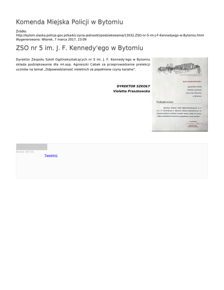 Komenda Miejska Policji w Bytomiu Źródło: http://bytom.slaska.policja.gov.pl/ka4/z-zycia-jednostki/podziekowania/13032,ZSO-nr-5-im-J-F-Kennedyego-w-Bytomiu.html Wygenerowano: Wtorek, 7 marca 2017, 23:09 ZSO nr 5 im. J. F. Kennedy'ego w Bytomiu Dyrektor Zespołu Szkół Ogólnokształcących nr 5 im. J. F. Kennedy'ego w Bytomiu składa podziękowanie dla mł.asp. Agnieszki Cabak za przeprowadzenie prelekcji uczniów na temat „Odpowiedzialność nieletnich za popełnione czyny karalne”. DYREKTOR SZKOŁY Violetta Praszkowska Ocena: 0/5 (0) Tweetnij