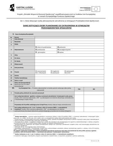 Projekt „Ośrodek Wsparcia Ekonomii Społecznej” współfinansowany jest ze środków Unii Europejskiej w ramach Europejskiego Funduszu Społecznego Zał. 1. Dane dotyczące osoby planowanej do zatrudnienia w istniejącym Przedsiębiorstwie Społecznym DANE DOTYCZĄCE OSOBY PLANOWANEJ DO ZATRUDNIENIA W ISTNIEJĄCYM PRZEDSIĘBIORSTWIE SPOŁECZNYM I. Dane Kandydata/Kandydatki Lp. 1 Nazwa Imię (imiona) 2 Nazwisko 3 PESEL 4 Wykształcenie 5 Ulica 6 Nr domu 7 Nr lokalu 8 Miejscowość 9 Kod pocztowy 10 Powiat 11 Gmina 12 Telefon kontaktowy 13 Adres e-mail 14 niższe niż podstawowe policealne podstawowe ponadgimnazjalne gimnazjalne wyższe inowrocławski m. Włocławek mogileński włocławski radziejowski żniński Adres do korespondencji (jeżeli jest inny niż adres zamieszkania) II. Czy Kandydat/-tka ….? (należy odpowiedzieć na każde pytanie wskazując tylko jedną odpowiedź) 1 TAK NIE Posiada pełną zdolność do czynności prawnych Jest osobą bezrobotną1 zgodnie z ustawą o promocji zatrudnienia i instytucjach rynku pracy (osoby, które zaznaczą odpowiedź „TAK” są zobowiązane do złożenia aktualnego zaświadczenia z Powiatowego Urzędu Pracy) 2 Przynależy do III profilu nadanego przez Urząd Pracy (należy załączyć kopię zaświadczenia) Jest osobą wskazaną w art. 1 ust. 2 ustawy z dnia 13 czerwca 2003 r. o zatrudnieniu socjalnym2 (osoby, które zaznaczą odpowiedź „TAK” są zobowiązane do złożenia uwierzytelnionej kserokopii dokumentu potwierdzającego przynależność do danej kategorii) 3 1 Osoba bezrobotna – oznacza osobę bezrobotną w rozumieniu Ustawy z dnia 20 kwietnia 2004 r. o promocji zatrudnienia i instytucjach rynku pracy (Dz. U. z 2008 r. Nr 69, poz. 415, z późn. zm.), w szczególności osobę, która jednocześnie jest osobą: - niezatrudnioną i niewykonującą innej pracy zarobkowej, zdolną i gotową do podjęcia zatrudnienia w pełnym wymiarze czasu pracy obowiązującym w danym zawodzie lub służbie albo innej pracy zarobkowej, - nieuczącą się w szkole, z wyjątkiem uczącej się w szkole dla dorosłych lub przystępującej do egzaminu eksternistycznego z zakresu programu nauczania tej szkoły lub w szkole wyższej, gdzie studiuje na studiach niestacjonarnych, - zarejestrowaną we właściwym dla miejsca zameldowania stałego lub czasowego powiatowym urzędzie pracy oraz poszukującą zatrudnienia lub innej pracy zarobkowej - ukończyła 18 lat i nie osiągnęła wieku emerytalnego, - posiadająca zaświadczenie z Powiatowego Urzędu Pracy potwierdzające posiadanie statusu bezrobotnego zgodnie z ustawą z dnia 20 kwietnia 2004 r. o promocji zatrudnienia i instytucjach rynku pracy. Do objęcia wsparciem kandydata z tytułu przesłanki bezrobocia konieczna jest jego przynależność do III profilu pomocy zgodnie z ustawą z dnia 20 kwietnia 2004 r. o promocji zatrudnienia i instytucjach rynku pracy. 2 Osoby wskazane w art. 1 ust. 2 ustawy z dnia 13 czerwca 2003 r. o zatrudnieniu socjalnym: 1) bezdomni realizujący indywidualny program wychodzenia z bezdomności, w rozumieniu przepisów o pomocy społecznej, ____________ Strona 1 z 6 Projekt „Ośrodek Wsparcia Ekonomii Społecznej” współfinansowany jest ze środków Unii Europejskiej w ramach Europejskiego Funduszu Społecznego Jeśli powyżej udzielono odpowiedzi „tak”, w polu obok należy wskazać przesłanki wykluczenia poprzez wpisanie w rubrykę obok odpowiedniego podpunktu wskazanego w przypisie nr 2 Jest osobą niepełnosprawną (należy załączyć kopię zaświadczenia) 4 Stopień niepełnosprawności (lekki, umiarkowany, znaczny) Jest osobą wskazaną w art. 2 pkt. 1a i 1b ustawy o zatrudnieniu socjalnym, czyli jest osobą posiadającą status: - absolwenta centrum integracji społecznej (osoba, która przez okres nie krótszy niż 6 miesięcy uczestniczyła w zajęciach w centrum integracji społecznej i otrzymała odpowiednie zaświadczenie, osoba ta jest absolwentem centrum integracji społecznej przez okres 6 miesięcy od dnia zakończenia zajęć w centrum integracji społecznej), - absolwenta klubu integracji społecznej (osoba, która uczestniczyła w klubie integracji społecznej przez okres nie krótszy niż 6 miesięcy, posiada ważne odpowiednie zaświadczenie oraz zrealizowała postanowienia kontraktu socjalnego). (należy załączyć kopię zaświadczenia) Jest osobą wychodzącą z WTZ, CIS, ZAZ, placówki opiekuńczo-wychowawczej, zakładu poprawczego i innych tego typu placówek będącą uczestnikiem projektów w ramach Działań 9.1. , 9.2 oraz 9.3 (należy załączyć kopię dokumentu potwierdzającego wyjście z danej placówki/bycie uczestnikiem ww. projektów) Jest osobą najbardziej oddaloną od rynku pracy, a więc taką, która oprócz bezrobocia doświadcza wykluczenia na podstawie co najmniej jednej z przesłanek3 (należy złożyć stosowne oświadczenie/ zaświadczenie-jeżeli to możliwe, wydanych przez organy uprawnione) 5 6 7 2) uzależnieni od alkoholu, 3) uzależnieni od narkotyków lub innych środków odurzających, 4) chorzy psychicznie, w rozumieniu przepisów o ochronie zdrowia psychicznego, 5) długotrwale bezrobotni w rozumieniu przepisów o promocji zatrudnienia i instytucjach rynku pracy, 6) zwalniani z zakładów karnych, mający trudności w integracji ze środowiskiem, w rozumieniu przepisów o pomocy społecznej, 7) uchodźcy realizujący indywidualny program integracji, w rozumieniu przepisów o pomocy społecznej, 8) osoby niepełnosprawne, w rozumieniu przepisów o rehabilitacji zawodowej i społecznej oraz zatrudnianiu osób niepełnosprawnych, którzy podlegają wykluczeniu społecznemu i ze względu na swoją sytuację życiową nie są w stanie własnym staraniem zaspokoić swoich podstawowych potrzeb życiowych i znajdują się w sytuacji powodującej ubóstwo oraz uniemożliwiającej lub ograniczającej uczestnictwo w życiu zawodowym, społecznym i rodzinnym. 3 Osoba zagrożona ubóstwem lub wyklucz