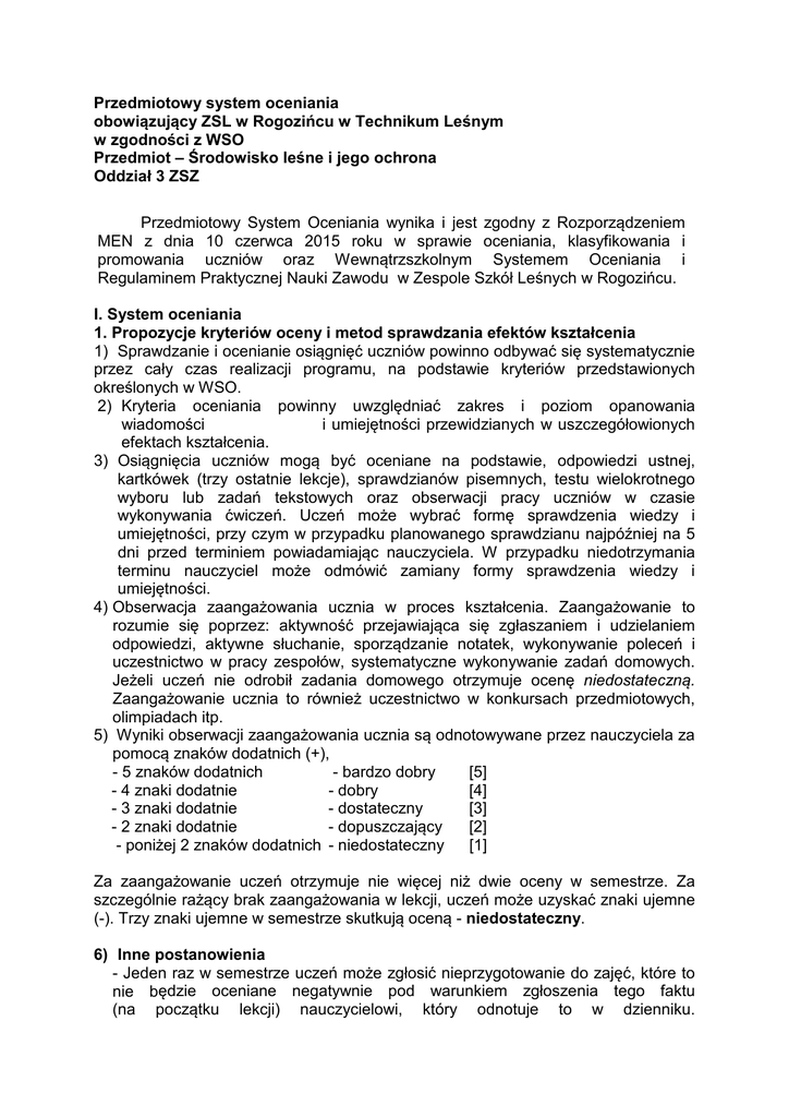 Przedmiotowy system oceniania obowiązujący ZSL w Rogozińcu w Technikum Leśnym w zgodności z WSO Przedmiot – Środowisko leśne i jego ochrona Oddział 3 ZSZ Przedmiotowy System Oceniania wynika i jest zgodny z Rozporządzeniem MEN z dnia 10 czerwca 2015 roku w sprawie oceniania, klasyfikowania i promowania uczniów oraz Wewnątrzszkolnym Systemem Oceniania i Regulaminem Praktycznej Nauki Zawodu w Zespole Szkół Leśnych w Rogozińcu. I. System oceniania 1. Propozycje kryteriów oceny i metod sprawdzania efektów kształcenia 1) Sprawdzanie i ocenianie osiągnięć uczniów powinno odbywać się systematycznie przez cały czas realizacji programu, na podstawie kryteriów przedstawionych określonych w WSO. 2) Kryteria oceniania powinny uwzględniać zakres i poziom opanowania wiadomości i umiejętności przewidzianych w uszczegółowionych efektach kształcenia. 3) Osiągnięcia uczniów mogą być oceniane na podstawie, odpowiedzi ustnej, kartkówek (trzy ostatnie lekcje), sprawdzianów pisemnych, testu wielokrotnego wyboru lub zadań tekstowych oraz obserwacji pracy uczniów w czasie wykonywania ćwiczeń. Uczeń może wybrać formę sprawdzenia wiedzy i umiejętności, przy czym w przypadku planowanego sprawdzianu najpóźniej na 5 dni przed terminiem powiadamiając nauczyciela. W przypadku niedotrzymania terminu nauczyciel może odmówić zamiany formy sprawdzenia wiedzy i umiejętności. 4) Obserwacja zaangażowania ucznia w proces kształcenia. Zaangażowanie to rozumie się poprzez: aktywność przejawiająca się zgłaszaniem i udzielaniem odpowiedzi, aktywne słuchanie, sporządzanie notatek, wykonywanie poleceń i uczestnictwo w pracy zespołów, systematyczne wykonywanie zadań domowych. Jeżeli uczeń nie odrobił zadania domowego otrzymuje ocenę niedostateczną. Zaangażowanie ucznia to również uczestnictwo w konkursach przedmiotowych, olimpiadach itp. 5) Wyniki obserwacji zaangażowania ucznia są odnotowywane przez nauczyciela za pomocą znaków dodatnich (+), - 5 znaków dodatnich - bardzo dobry [5] - 4 znaki dodatnie - dobry [4] - 3 znaki dodatnie - dostateczny [3] - 2 znaki dodatnie - dopuszczający [2] - poniżej 2 znaków dodatnich - niedostateczny [1] Za zaangażowanie uczeń otrzymuje nie więcej niż dwie oceny w semestrze. Za szczególnie rażący brak zaangażowania w lekcji, uczeń może uzyskać znaki ujemne (-). Trzy znaki ujemne w semestrze skutkują oceną - niedostateczny. 6) Inne postanowienia - Jeden raz w semestrze uczeń może zgłosić nieprzygotowanie do zajęć, które to nie będzie oceniane negatywnie pod warunkiem zgłoszenia tego faktu (na początku lekcji) nauczycielowi, który odnotuje to w dzienniku. Nieprzygotowanie nie obejmuje zadanych dużo wcześniej prac referatów. pisemnych i - W ocenie końcowej należy uwzględnić wyniki wszystkich zastosowanych przez nauczyciela metod sprawdzania osiągnięć uczniów oraz indywidualnych możliwości edukacyjnych. 2. Formy indywidualizacji pracy uczniów uwzględniające: Formy, metody i sposoby dostosowania wymagań edukacyjnych muszą być dostosowane do indywidualnych potrzeb rozwojowych, edukacyjnych i możliwości psychofizycznych ucznia posiadającego opinię poradni psychologicznopedagogicznej i zawierają: - dostosowanie warunków, środków, metod i form kształcenia do potrzeb ucznia; - dostosowanie warunków, środków, metod i form kształcenia do możliwości ucznia - uwzględnienie indywidualnych możliwości i ograniczeń zdrowotnych Ucznia posiadającego opinię poradni psychologiczno-pedagogicznej, obowiązuje taki sam zakres materiału jak wszystkich innych, lecz z uwzględnieniem niżej wyszczególnionych warunków: 1. uczeń ma prawo zając miejsce w pierwszych ławkach, aby nauczyciel obserwował jego pracę i mógł mu pomagać, 2. nauczyciel realizując program nauczania stosuje techniki skojarzeniowe ułatwiające zapamiętywanie materiału przez ucznia, 3. pytania kierowane do ucznia są krótkie i wymagają krótkich odpowiedzi, uczeń nie jest wyrwany do szybkiej odpowiedzi, lecz ma prawo chwilę się zastanowić przed jej udzieleniem, nauczyciel wspomaga ucznia przez naprowadzanie go oraz dzielenie zadania na mniejsze etapy, 4. prace ucznia lub odpowiedzi są oceniane wyłącznie pod względem merytorycznym, 5. uczeń ma prawo pytać o rzeczy których nie zrozumiał od razu, albo w innym czasie podczas lekcji, 6. uczeń częściej niż pozostali może uczęszczać na indywidualne konsultacje na zajęcia pozalekcyjne, 7. jeśli uczeń posiada dysgrafię: może pisać prace pisemne drukowanymi literami oraz w czasie dłuższym o 20 % niż pozostali; może poprosić o odpytanie ustne zamiast pracy pisemnej; braki w zeszycie przedmiotowym może uzupełniać wykonując kserokopię notatek od pozostałych uczniów; uczeń może sporządzać notatki na lekcji korzystając z laptopa; 8. jeśli uczeń posiada dysleksję: ma prawo odpowiadać w czasie dłuższym o 20% niż pozostali lub odpowiadać na zajęciach pozalekcyjnych; ma prawo pisać kartkówkę zamiast odpowiedzi ustnej; 9. jeśli uczeń posiada dysortografię: w pracach pisemnych ucznia nie jest oceniana poprawność pisowni i ortografii; 10. jeśli uczeń ma słaby wzrok lub słabo słyszy: ma prawo siedzieć w pierwszych ławkach, zadawać pytania za każdym razem jeśli czegoś nie usłyszy, uzupełniać zaległy materiał na zajęciach pozalekcyjnych; nauczyciel omawia i podaje notatki w takiej formie aby treść była widoczna i czytelna dla uczniów np. prezentacje multimedialne. 3. Zasady oceniania 1) Ocena – niedostateczny [1] Uczeń nie opanował materiału w minimalnej skali procentowej (poniżej 39%) 2) Ocena – dopuszczający [2] Poziom A – zapamiętanie wiadomości (wiedzieć) Uczeń potrafi nazwać, zdefiniować, wymienić, zidentyfikować, wyliczyć 2) Ocena – dostateczny [3] Poziom B – zrozumienie wiadomości (rozumieć) Uczeń potrafi streścić, wyjaśnić, zidentyfikować, rozró