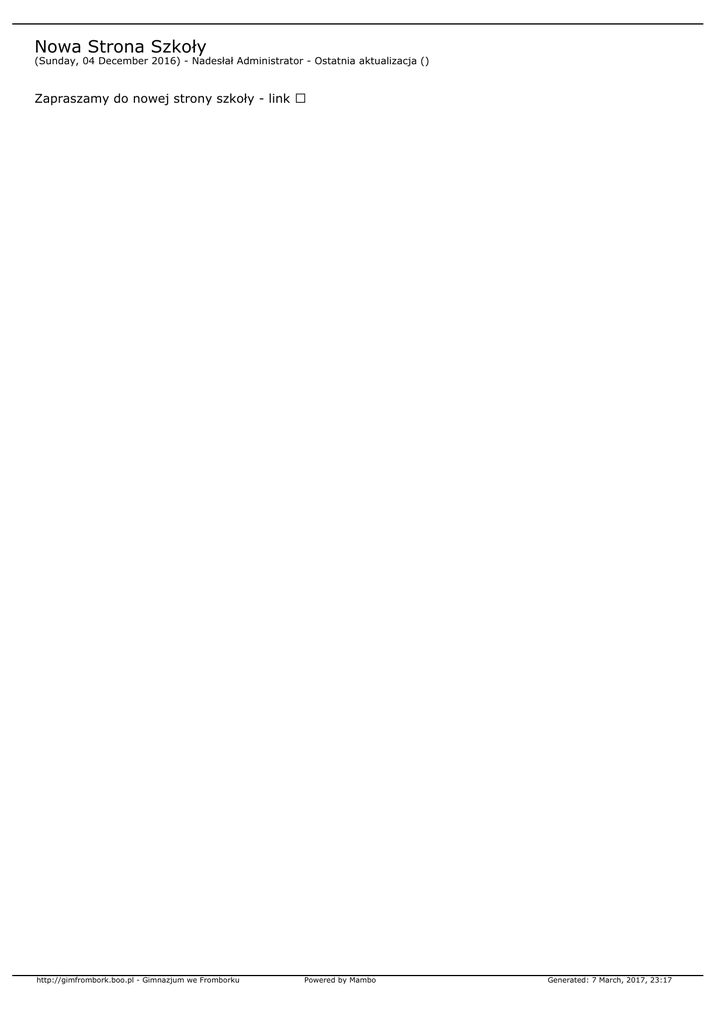 Nowa Strona Szkoły (Sunday, 04 December 2016) - Nadesłał Administrator - Ostatnia aktualizacja () Zapraszamy do nowej strony szkoły - link http://gimfrombork.boo.pl - Gimnazjum we Fromborku Powered by Mambo Generated: 7 March, 2017, 23:17