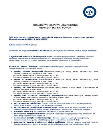 DODATKOWE GRUPOWE UBEZPIECZENIE MEDYCZNY EKSPERT DOMOWY Jeśli troszczysz się o zdrowie swoje i swoich bliskich wybierz dodatkowe ubezpieczenie Medyczny Ekspert Domowy (ZGODNIE Z OWU KZGP32) Zakres ubezpieczenia obejmuje: Wystąpienie lub diagnoza ZDARZENIA MEDYCZNEGO, skutkującego świadczeniem objętym jednym z pakietów: Zagraniczna Konsultacja Medyczna zapewnia możliwość przeprowadzenia zagranicznej konsultacji medycznej na podstawie dokumentacji medycznej oraz pierwszej opinii medycznej wydanej przez lekarza prowadzącego w jednej z 2,5 tysiąca specjalistycznych placówek medycznych w USA i Europie. Prywatna Opieka Domowa - szeroki pakiet usług związanych z opieką nad przewlekle chorym ubezpieczonym (lub członkiem jego rodziny): opiekę domową pielęgniarki -Świadczenie przysługuje według wyboru ubezpieczonego, dokonywanego we wniosku o organizację świadczenia: 1) do ośmiu godzin dziennie przez okres dwóch tygodni albo 2) do czterech godzin dziennie przez okres czterech tygodni. pomoc w prowadzeniu domu-Świadczenie przysługuje według wyboru ubezpieczonego, dokonywanego we wniosku o organizację świadczenia: 1) do ośmiu godzin dziennie przez okres dwóch tygodni albo 2) do czterech godzin dziennie przez okres czterech tygodni opiekę nad dziećmi-Świadczenie przysługuje według wyboru ubezpieczonego, dokonywanego we wniosku o organizację świadczenia: 1) do ośmiu godzin dziennie przez okres dwóch tygodni albo 2) do czterech godzin dziennie przez okres czterech tygodni opiekę nad drobnymi zwierzętami domowymi-Świadczenie przysługuje według wyboru ubezpieczonego, dokonywanego we wniosku o organizację świadczenia: 1) do ośmiu godzin dziennie przez okres dwóch tygodni albo 2) do czterech godzin dziennie przez okres czterech tygodni wizytę domową psychologa- Centrum Medyczne zorganizuje jedną wizytę psychologa dziennie trwającą maksymalnie 2 godziny przez okres czterech tygodni. wizytę domową rehabilitanta lub masażysty- Centrum Medyczne zorganizuje jedną wizytę rehabilitanta lub masażysty dziennie trwającą maksymalnie 2 godziny przez okres czterech tygodni. transport medyczny np. zapewnienie transportu przy wypisie ze szpitala dostarczenie niezbędnych leków-Centrum Medyczne zorganizuje i pokryje koszty dostarczenia do domu przepisanych leków na terenie RP dostarczenie sprzętu rehabilitacyjnego- Centrum Medyczne zorganizuje i pokryje koszty dostarczenia do domu sprzętu rehabilitacyjnego (min. na zwolnieniu lekarskim 5 dni) organizację naprawy przedmiotów użytku osobistego- Centrum Medyczne zorganizuje i pokryje koszty dostarczenia do naprawy przedmioty użytku osobistego(min. na zwolnieniu lekarskim 5 dni) Pomoc w Planowaniu Leczenia – zapewnia w razie wystąpienia zdarzenia medycznego telefoniczną konsultację w zakresie wyszukania najbliższej placówki medycznej mogącej udzielić stosownej pomocy lub udzielenie telefonicznie informacji adresowych na jej temat, umówienie wizyty lekarskiej lub świadczenia medycznego w stosownej placówce medycznej lub udzielenie telefonicznie informacji adresowych dotyczących usług medycznych oferowanych przez określone placówki medyczne Całodobowy Telefoniczny Serwis Medyczny – pozwala ubezpieczonemu na otrzymanie o każdej porze dnia kompleksowej informacji na temat adresów i godzin pracy placówek medycznych, a także informacji medycznej . Zakres informacji udzielanych w ramach Całodobowego Telefonicznego Serwisu Medycznego obejmuje informacje o: 1) zdrowiu, chorobie i jednostkach chorobowych, 2) zachowaniach prozdrowotnych, 3) szpitalach, aptekach, przychodniach, lekarzach ogólnych – znajdujących się na terenie Rzeczypospolitej Polskiej, 4) pielęgnacji niemowląt, 5) lekach oraz objawach niepożądanych przy ich przyjmowaniu, 6) dietach, zdrowym żywieniu, 7) grupach wsparcia, telefonach zaufania – świadczących pomoc i dostępnych na terenie Rzeczypospolitej Polskiej, 8) transporcie medycznym, 9) stanach wymagających nagłej pomocy, 10) opiece nad osobami starszymi. Ubezpieczenie może być zawarte w wariancie podstawowym – przedmiotem ubezpieczenia jest zdrowie ubezpieczonego. WARIANT PODSTAWOWY • • • • • • • • • • • • • • • • • • • • • • chirurgia naczyń wieńcowych, angioplastyka choroba Alzheimera choroba neuronu ruchowego choroba Parkinsona choroby mielodysplastyczne choroby zapalne jelit choroby zastawki/zastawek serca, przeszczep zastawki lub jej korekcja chirurgiczna cukrzyca endarteriektomia tętnicy szyjnej guz lub inne patologie rdzenia kręgowego wymagające leczenia operacyjnego guz mózgu głuchota infekcja wirusem HIV kardiomiopatia leczenie chirurgiczne padaczki niewydolność nerek oparzenia obejmujące dużą powierzchnię ciała protezoplastyka stawów, rozległe uszkodzenie ręki, uszkodzenie stożka rotatorów, wszczepienie protezy całkowitej lub częściowej dowolnego stawu przeszczep jednego z głównych narządów nowotwory rozległe schorzenia ginekologiczne schyłkowy okres niewydolności jednego z głównych narządów • • • • • • • • • schorzenia okulistyczne wymagające leczenia operacyjnego z wyłączeniem typowej zaćmy i chirurgicznego leczenia typowych wad wzroku stwardnienie rozsiane śpiączka trwałe całkowite inwalidztwo udar mózgu utrata jednej lub więcej kończyn utrata mowy wrodzone wady serca u dorosłych zapalenie wątroby ZGŁOSZENIE ZDARZENIA NASTEPUJE TYLKO PRZEZ TELEFON 801 102 102 Składka miesięczna w wariancie podstawowym 1,99 zł Pragniemy zwrócić uwagę, na fakt, że do ubezpieczenia przystępują Państwo bez wypełniania ankiet zdrowotnych i dodatkowych badań medycznych. Przy tak szerokim pakiecie ubezpieczenia możecie Państwo zabezpieczyć przyszłość swoją oraz swoich rodzin w przypadku wystąpienia nagłych zdarzeń losowych. Wszelkich dodatkowych informacji ze strony PZU Życie SA udzielą : Agnieszka Kowalska – 668 104 138 Dorota 