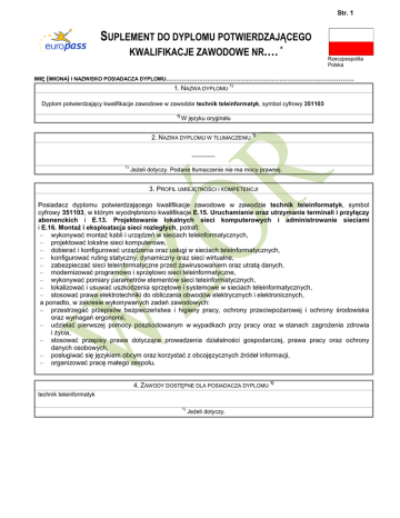 Str. 1 SUPLEMENT DO DYPLOMU POTWIERDZAJĄCEGO KWALIFIKACJE ZAWODOWE NR…. * Rzeczpospolita Polska IMIĘ (IMIONA) I NAZWISKO POSIADACZA DYPLOMU…………………………………………………………………………………… 1. NAZWA DYPLOMU 1) Dyplom potwierdzający kwalifikacje zawodowe w zawodzie technik teleinformatyk, symbol cyfrowy 351103 1) W języku oryginału 2. NAZWA DYPLOMU W TŁUMACZENIU 1) _______ 1) Jeżeli dotyczy. Podane tłumaczenie nie ma mocy prawnej. 3. PROFIL UMIEJĘTNOŚCI I KOMPETENCJI Posiadacz dyplomu potwierdzającego kwalifikacje zawodowe w zawodzie technik teleinformatyk, symbol cyfrowy 351103, w którym wyodrębniono kwalifikacje E.15. Uruchamianie oraz utrzymanie terminali i przyłączy abonenckich i E.13. Projektowanie lokalnych sieci komputerowych i administrowanie sieciami i E.16. Montaż i eksploatacja sieci rozległych, potrafi: – wykonywać montaż kabli i urządzeń w sieciach teleinformatycznych, – projektować lokalne sieci komputerowe, – dobierać i konfigurować urządzenia oraz usługi w sieciach teleinformatycznych, – konfigurować ruting statyczny, dynamiczny oraz sieci wirtualne, – zabezpieczać sieci teleinformatyczne przed zawirusowaniem oraz utratą danych, – modernizować programowo i sprzętowo sieci teleinformatyczne, – wykonywać pomiary parametrów elementów sieci teleinformatycznych, – lokalizować i usuwać uszkodzenia sprzętowe i systemowe w sieciach teleinformatycznych, – stosować prawa elektrotechniki do obliczania obwodów elektrycznych i elektronicznych, a ponadto, w zakresie wykonywanych zadań zawodowych: – przestrzegać przepisów bezpieczeństwa i higieny pracy, ochrony przeciwpożarowej i ochrony środowiska oraz wymagań ergonomii, – udzielać pierwszej pomocy poszkodowanym w wypadkach przy pracy oraz w stanach zagrożenia zdrowia i życia, – stosować przepisy prawa dotyczące prowadzenia działalności gospodarczej, prawa pracy oraz ochrony danych osobowych, – posługiwać się językiem obcym oraz korzystać z obcojęzycznych źródeł informacji, – organizować pracę małego zespołu. 4. ZAWODY DOSTĘPNE DLA POSIADACZA DYPLOMU technik teleinformatyk 1) Jeżeli dotyczy. 1) Str. 2 5.PODSTAWA WYDANIA DYPLOMU Nazwa podmiotu wydającego dyplom Okręgowa Komisja Egzaminacyjna w …………………………. Nazwa władz sprawujących nadzór nad podmiotem wydającym dyplom Minister Edukacji Narodowej Poziom wykształcenia (krajowy lub międzynarodowy) ISCED 4 Warunki zdania egzaminu potwierdzającego kwalifikacje w zawodzie Egzamin przeprowadzany jest z każdej kwalifikacji wyodrębnionej w zawodzie. Warunkiem zdania egzaminu zawodowego, złożonego z dwóch części, jest uzyskanie: 1) z części pisemnej - co najmniej 50% punktów możliwych do uzyskania, 2) z części praktycznej - co najmniej 75% punktów możliwych do uzyskania. Dostęp do następnego poziomu kształcenia Jeżeli posiadacz dyplomu uzyskał świadectwo dojrzałości, może kontynuować kształcenie w szkole wyższej. Umowy międzynarodowe _______ Podstawa prawna wydania dyplomu stosowne rozporządzenie 6. OFICJALNIE UZNANE SPOSOBY UZYSKANIA DYPLOMU Posiadacz dyplomu uzyskał wykształcenie średnie oraz zdał egzaminy potwierdzające kwalifikacje E.15. Uruchamianie oraz utrzymanie terminali i przyłączy abonenckich i E.13. Projektowanie lokalnych sieci komputerowych i administrowanie sieciami i E.16. Montaż i eksploatacja sieci rozległych w zawodzie technik teleinformatyk. Kwalifikacje wyodrębnione w tym zawodzie są możliwe do uzyskania w ramach poniższych sposobów nabywania kwalifikacji: Możliwe sposoby nabywania kwalifikacji w zawodzie technik teleinformatyk Udział kształcenia teoretycznego/praktycznego (%) Kształcenie w szkole (4-letnie technikum lub 2-letnia szkoła policealna) Kształcenie ustawiczne w formach pozaszkolnych (minimalna liczba godzin kształcenia określona w podstawie programowej kształcenia w zawodach) Potwierdzanie kwalifikacji w trybie egzaminów eksternistycznych dla osób, które ukończyły gimnazjum albo 8-letnią szkołę podstawową oraz: a) co najmniej 2 lata kształciły się w zawodzie lub b) co najmniej 2 lata pracowały w zawodzie 50/50 50/50 50/50 0/100 Informacje dodatkowe: Okręgowa Komisja Egzaminacyjna w ………………………, e-mail: Więcej informacji (w tym opis krajowego systemu kwalifikacji) można znaleźć w Internecie pod adresem: www.men.gov.pl, www.koweziu.edu.pl Krajowy punkt informacyjny: www.europass.org.pl *Nota objaśniająca Niniejszy dokument ma na celu dostarczenie dodatkowych informacji na temat dyplomu potwierdzającego kwalifikacje zawodowe i sam w sobie nie ma mocy prawnej. Podstawą opisu są następujące teksty: Rezolucja Rady nr 93/C 49/01 z dnia 3 grudnia 1992 r. dotycząca przejrzystości kwalifikacji, Rezolucja Rady nr 96/C 224/04 z dnia 15 lipca 1996 r. dotycząca przejrzystości dyplomów szkolenia zawodowego, Zalecenie Parlamentu Europejskiego oraz Rady nr 2001/613/EC z dnia 10 lipca 2001 r. w sprawie mobilności w ramach Wspólnoty studentów, osób przechodzących szkolenia, wolontariuszy, nauczycieli i instruktorów. Więcej informacji można uzyskać pod adresem: http://europass.cedefop.eu.int © European Communities 2002