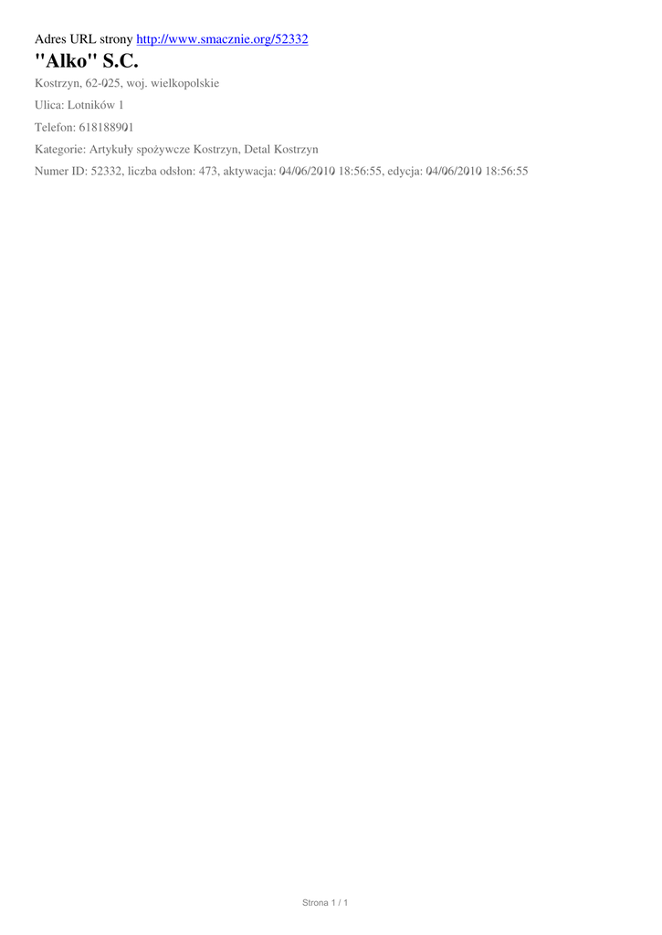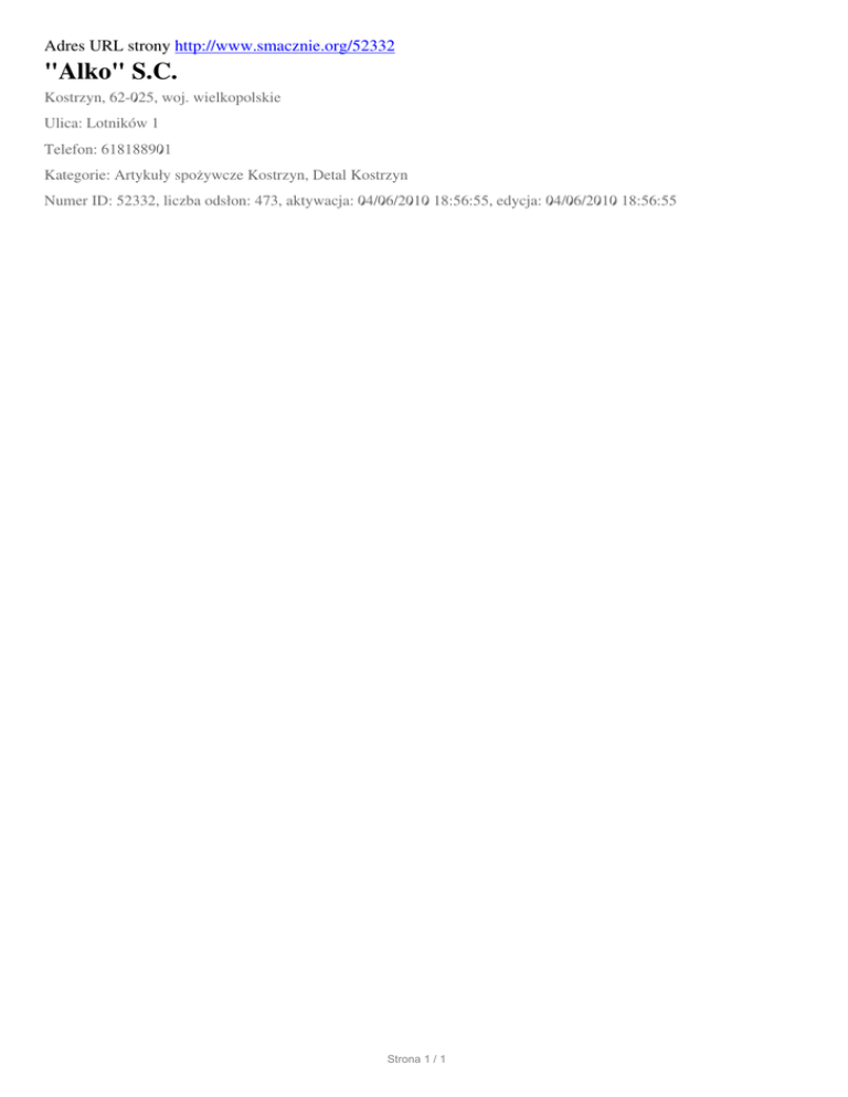 Adres URL strony http://www.smacznie.org/52332 "Alko" S.C. Kostrzyn, 62-025, woj. wielkopolskie Ulica: Lotników 1 Telefon: 618188901 Kategorie: Artykuły spożywcze Kostrzyn, Detal Kostrzyn Numer ID: 52332, liczba odsłon: 473, aktywacja: 04/06/2010 18:56:55, edycja: 04/06/2010 18:56:55 Strona 1 / 1