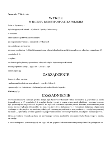 Sygn. akt II Ca 677/15 WYROK W IMIENIU RZECZYPOSPOLITEJ POLSKIEJ Dnia 14 lipca 2015 r. Sąd Okręgowy w Kielcach - Wydział II Cywilny Odwoławczy w składzie: Przewodniczący: SSO Rafał Adamczyk po rozpoznaniu w dniu 14 lipca 2015 r. w Kielcach na posiedzeniu niejawnym sprawy z powództwa (...) Spółki z ograniczoną odpowiedzialnością spółki komandytowo - akcyjnej z siedzibą w W. przeciwko J. A. o zapłatę na skutek apelacji strony powodowej od wyroku Sądu Rejonowego w Kielcach z dnia 30 grudnia 2014 r., sygn. akt I C 928/14 upr. oddala apelację. ZARZĄDZENIE doręczyć odpis wyroku: - pełnomocnikowi strony powodowej – r. pr. D. J. (k. 95), - pozwanej J. A., dodatkowo z informacją o niezaskarżalności wyroku. II Ca 677/15 UZASADNIENIE Wyrokiem zaocznym z dnia 30 grudnia 2014 r. Sąd Rejonowy w Kielcach oddalił powództwo (...) Spółki z o.o. spółki komandytowej w W. przeciwko J. A. o zapłatę kwoty 1332,40 zł wraz z ustawowymi odsetkami i kosztami procesu. Sąd pierwszej instancji wskazał, iż powód nie wykazał zasadności żądania pozwu, bowiem przedstawione przez stronę powodową kopie dokumentów nie stanowią dowodów z dokumentów, w rozumieniu kodeksu postępowania cywilnego, co do przejścia uprawnień wynikających z umowy pożyczki z dnia 30 stycznia 2013 r. względem pozwanej na rzecz (...) prywatnej spółki z ograniczoną odpowiedzialnością z siedzibą w Estonii, a następnie na rzecz powoda. Strona powodowa wniosła apelację od powyższego wyroku. Zaskarżyła orzeczenie Sądu Rejonowego w całości, zarzucając: 1. naruszenie prawa procesowego, tj. art. 233 § 1 k.p.c. poprzez dokonanie dowolnej oceny dowodów, polegające na: - bezpodstawnym uznaniu, że dokumenty przedstawione przez powoda nie wykazują dokonania cesji wierzytelności na jego rzecz, podczas gdy powód już na etapie elektronicznego postępowania upominawczego złożył wszelkie dowody potwierdzające przysługującą mu wierzytelność; - wybiórczej i stronniczej interpretacji treści zapisów ramowej umowy pożyczki i ustaleniu, że powód nie przedstawił na jakich zasadach i w jakim terminie miał nastąpić zwrot pożyczki, podczas gdy zaakceptowana ramowa umowa pożyczki oraz dokument „Twoje warunki umowy pożyczki z V..pl” precyzyjnie określa wszelkie warunki związane z udzieloną pożyczką; 2. naruszenie prawa procesowego, tj. art. 50532 § 1 k.p.c. poprzez uznanie, że powód nie zgłosił w pozwie dowodów na poparcie swoich twierdzeń, podczas gdy dowody te były zgłoszone zarówno w pozwie złożonym w elektronicznym postępowaniu upominawczym, jak i w niniejszym postępowaniu; 3. naruszenie prawa procesowego, tj. art. 224 § 1 k.p.c. poprzez zamknięcie rozprawy mimo niedostatecznego wyjaśnienia sprawy, w świetle ustalonych faktów i okoliczności i wydanie orzeczenia na podstawie niedostatecznie wyjaśnionych okoliczności faktycznych, takich jak stwierdzenie, że strona powodowa w niewystarczający sposób udowodniła roszczenie; 4. naruszenie prawa materialnego - art. 60 k.c. poprzez jego niezastosowanie, podczas gdy z okoliczności faktycznych sprawy wynika, że strona pozwana ujawniła skutecznie w postaci elektronicznej swoja wolę zawarcia umowy pożyczki, zgodnie z przepisami dotyczącymi zawierania umów na odległość. Wskazując na powyższe zarzuty, skarżący wnosił o zmianę wyroku Sądu pierwszej instancji i zasądzenie od pozwanej na rzecz powoda kwot dochodzonych pozwem: - 1000 zł z tytułu należności głównej, wraz z odsetkami ustawowymi od dnia wniesienia pozwu do dnia zapłaty, - 197,40 zł tytułem skapitalizowanych odsetek umownych w wysokości czterokrotności stopy lombardowej od dnia wymagalności, tj. od 2 marca 2013 r. do dnia 15 maja 2014 r., wraz z odsetkami ustawowymi liczonymi od dnia wniesienia pozwu do dnia zapłaty, - 135 zł tytułem opłat windykacyjnych, z odsetkami ustawowymi liczonymi od dnia wniesienia pozwu do dnia zapłaty oraz zasądzenia od pozwanej na rzecz strony powodowej kosztów procesu za drugą instancję, ewentualnie domagał się uchylenia wyroku i przekazania sprawy Sądowi Rejonowemu w Kielcach do ponownego rozpoznania. Ponadto, na podstawie art. 368 § 1 pkt 4 k.p.c., w związku z zarzutem wskazanym w punkcie 2., strona powodowa wnosiła o dopuszczenie dowodu z dokumentów: potwierdzenia szczegółowych warunków transakcji kolejnych instrumentów pochodnych pomiędzy (...) Sp. z o.o. a Spółką (...), potwierdzenia wierzytelności, w których wystąpiło zdarzenie kredytowe, potwierdzenia sprzedaży wierzytelności pomiędzy (...) Sp. z o.o., a Spółką (...), potwierdzenia zawarcia umowy dotyczącej cesji wierzytelności pomiędzy Spółką (...) a (...) Sp. z o.o., potwierdzenia wniesienia aportem wierzytelności (...) Sp. z o. o. do (...) Sp. z o.o. SKA, potwierdzenia przelewu z zaakceptowaniem przez pozwanego warunków umowy pożyczki, regulaminu świadczenia usług drogą elektroniczną w (...) Sp. z o.o., obowiązującego w dniu zakończenia umowy, ramowej umowy pożyczki, potwierdzenia przelewu kwoty pożyczki. Sąd Okręgowy zważył, co następuje: Apelacja nie zasługuje na uwzględnienie. Sąd Okręgowy podziela w całości ustalenia faktyczne dokonane w sprawie przez Sąd Rejonowy i przyjmuje je za własne. W świetle tych ustaleń, Sąd pierwszej instancji trafnie uznał, iż strona powodowa nie wykazała zasadności żądania pozwu, w szczególności nie przedstawiła dokumentów wystarczających do udowodnienia, aby na pozwanej J. A. ciążył obowiązek zapłaty na rzecz (...) Spółki z o. o. spółki komandytowej w W. kwoty dochodzonej pozwem. Wskazując na naruszenie art. 233 § 1 k.p.c., skarżący zmierzał w istocie do podważenia stanowiska, że niepoświadczona kserokopia dokumentu nie ma waloru dowodu. Przede wszystkim należy zauważyć, iż kserokopia jako odwzorowanie oryginału może być uznana za odpis dokumentu. Z kolei odpis dokumentu wskazuje na istnienie