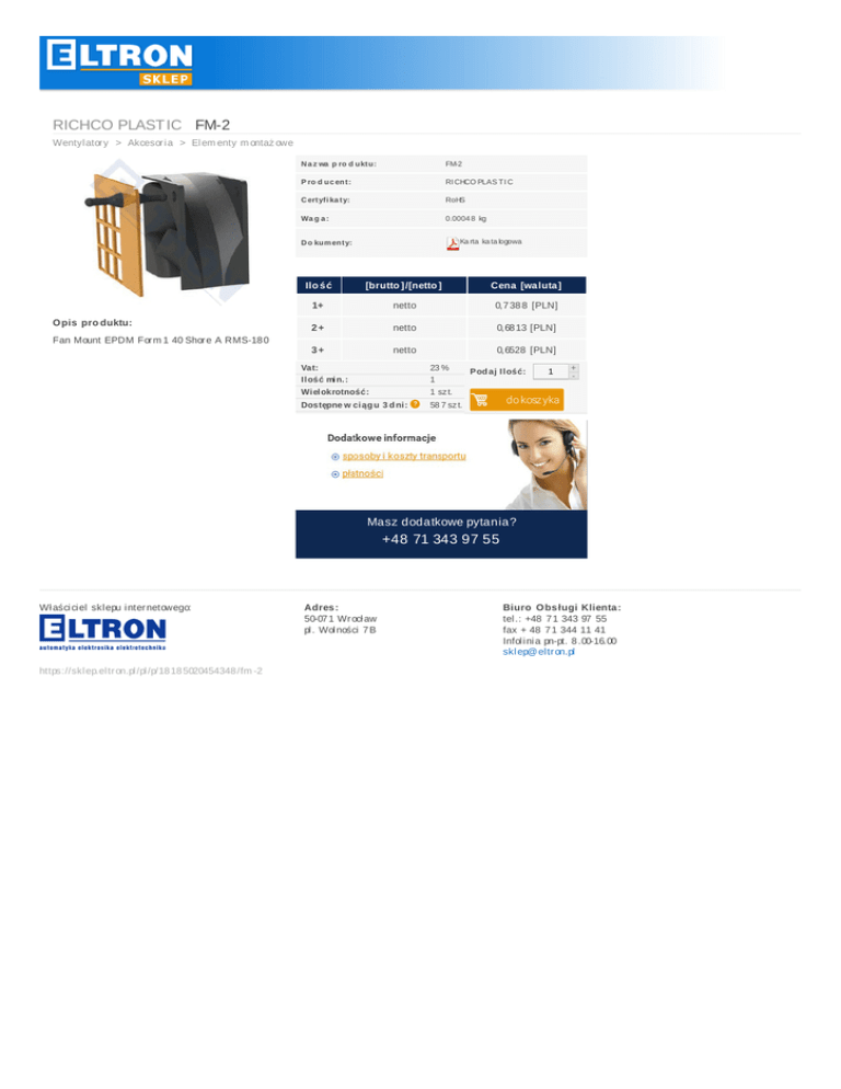 RICHCOPLAST ICFM-2 Wentyl ator y > Akcesor i a > El em entym ontaż owe N a z wa p ro d u ktu : FM-2 P ro d u c en t: RI CHCOPLAS T I C C ertyfi ka ty: RoHS Wa g a : 0.0004 8 kg Ka rta ka ta logowa D o ku m en ty: O pis pro duktu: FanMountEPDMFor m 140Shor eARMS-18 0 Ilo ś ć [brutto ] /[netto ] Cena [wa luta ] 1+ netto 0,7 38 8 [PLN] 2+ netto 0,68 13[PLN] 3+ netto 0,6528 [PLN] Vat: Ilośćmin.: Wielokrotność: 23% 1 1sz t. Dostępnewciąg u 3d ni: 58 7sz t. Pod ajIlość: 1 + - dokosz yka Maszdodatkowepytania? +48713439755 Wł aści ci el skl epui nter netowego: https://skl ep.el tr on.pl /pl /p/18 18 5020454348 /fm -2 Adres : 50-07 1Wr ocł aw pl .Wol ności 7 B Biuro O bs ługiKlienta : tel .:+48 7 134397 55 fax+48 7 13441141 Infol i ni apn-pt.8 .00-16.00 skl ep@ el tr on.pl
