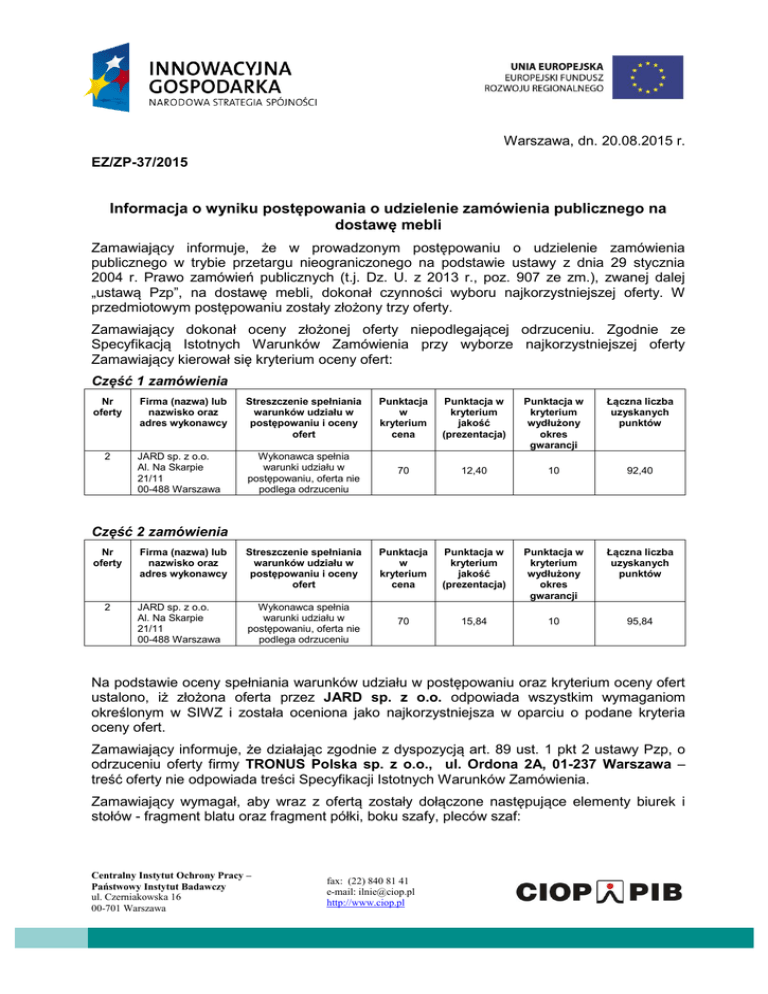 Warszawa, dn. 20.08.2015 r. EZ/ZP-37/2015 Informacja o wyniku postępowania o udzielenie zamówienia publicznego na dostawę mebli Zamawiający informuje, że w prowadzonym postępowaniu o udzielenie zamówienia publicznego w trybie przetargu nieograniczonego na podstawie ustawy z dnia 29 stycznia 2004 r. Prawo zamówień publicznych (t.j. Dz. U. z 2013 r., poz. 907 ze zm.), zwanej dalej „ustawą Pzp”, na dostawę mebli, dokonał czynności wyboru najkorzystniejszej oferty. W przedmiotowym postępowaniu zostały złożony trzy oferty. Zamawiający dokonał oceny złożonej oferty niepodlegającej odrzuceniu. Zgodnie ze Specyfikacją Istotnych Warunków Zamówienia przy wyborze najkorzystniejszej oferty Zamawiający kierował się kryterium oceny ofert: Część 1 zamówienia Nr oferty 2 Firma (nazwa) lub nazwisko oraz adres wykonawcy Streszczenie spełniania warunków udziału w postępowaniu i oceny ofert Punktacja w kryterium cena Punktacja w kryterium jakość (prezentacja) Punktacja w kryterium wydłużony okres gwarancji Łączna liczba uzyskanych punktów JARD sp. z o.o. Al. Na Skarpie 21/11 00-488 Warszawa Wykonawca spełnia warunki udziału w postępowaniu, oferta nie podlega odrzuceniu 70 12,40 10 92,40 Firma (nazwa) lub nazwisko oraz adres wykonawcy Streszczenie spełniania warunków udziału w postępowaniu i oceny ofert Punktacja w kryterium cena Punktacja w kryterium jakość (prezentacja) Punktacja w kryterium wydłużony okres gwarancji Łączna liczba uzyskanych punktów JARD sp. z o.o. Al. Na Skarpie 21/11 00-488 Warszawa Wykonawca spełnia warunki udziału w postępowaniu, oferta nie podlega odrzuceniu 70 15,84 10 95,84 Część 2 zamówienia Nr oferty 2 Na podstawie oceny spełniania warunków udziału w postępowaniu oraz kryterium oceny ofert ustalono, iż złożona oferta przez JARD sp. z o.o. odpowiada wszystkim wymaganiom określonym w SIWZ i została oceniona jako najkorzystniejsza w oparciu o podane kryteria oceny ofert. Zamawiający informuje, że działając zgodnie z dyspozycją art. 89 ust. 1 pkt 2 ustawy Pzp, o odrzuceniu oferty firmy TRONUS Polska sp. z o.o., ul. Ordona 2A, 01-237 Warszawa – treść oferty nie odpowiada treści Specyfikacji Istotnych Warunków Zamówienia. Zamawiający wymagał, aby wraz z ofertą zostały dołączone następujące elementy biurek i stołów - fragment blatu oraz fragment półki, boku szafy, pleców szaf: Centralny Instytut Ochrony Pracy – Państwowy Instytut Badawczy ul. Czerniakowska 16 00-701 Warszawa fax: (22) 840 81 41 e-mail: [email protected] http://www.ciop.pl 1) próbkę blatu o wym. 20x20 cm pokrytej laminatem HPL o grubości minimum 0,6 mm i oklejonej jednostronnie PCV lub PP lub ABS o grubości min. 2 mm; 2) próbkę płyty laminowanej o grubości minimum 18 mm i wym. 20X20 cm oklejonej obrzeżem PCV lub PP lub ABS o grubości minimum 2 mm, oraz 3) próbniki fabryczne do mebli tapicerowanych potwierdzające wymagane parametry, opisane w sposób nie budzący wątpliwości której pozycji dotyczą. Wykonawca do oferty nie załączył wymaganych próbek. Dołączona do oferty próbka jest elementem oferty, który ma potwierdzać zgodność oferowanego przedmiotu z wymogami postawionymi przez Zamawiającego w specyfikacji istotnych warunków zamówienia. Od prawidłowego zakwalifikowania oceny istnienia próbki w ofercie zależy prawidłowość ewentualnych konsekwencji. Brak próbki może doprowadzić do odrzucenia oferty. Potwierdza to wyrok KIO z dnia 7 maja 2009 r., KIO/UZP 536/09: „Zamawiający przy dokonywaniu oceny ofert, nie może odstępować od wymogów określonych w specyfikacji istotnych warunków zamówienia, gdyż prowadzi to do naruszania zasad uczciwej konkurencji i równego traktowania wykonawców. Skoro zaoferowany produkt nie spełnia kompletnych parametrów, wyznaczonych jako graniczne wymagane, obowiązkiem zamawiającego było odrzucenie oferty. Cechy techniczne, którymi obligatoryjnie winno charakteryzować się nabywane urządzenie, stanowią bowiem istotny element oferty, co przesądza o niezgodności jej treści z treścią specyfikacji istotnych warunków zamówienia w rozumieniu art. 89 ust. 1 pkt 2 Pzp w związku z art. 66 ust. 1 k.c.". Uchybienie Wykonawcy polega na niedołączeniu do oferty próbek, które stanowiły merytoryczną treść oferty, konkretyzując oferowany przez Wykonawcę przedmiot zamówienia. Uzupełnienie przez Wykonawcę brakującej istotnej treści oferty jest niedopuszczalne, ponieważ naruszałoby jedną z podstawowych zasad określoną w art. 7 ust. 1 Pzp, mianowicie „udzielenie zamówienia w sposób zapewniający zachowanie uczciwej konkurencji oraz równe traktowanie wykonawców”. Zamawiający informuje, że działając zgodnie z dyspozycją art. 89 ust. 1 pkt 2 ustawy Pzp, o odrzuceniu oferty firmy FORNICA Jarosław Pataluch, ul. Zw. Jaszczurczego 9/25, 80-288 Gdańsk – treść oferty nie odpowiada treści Specyfikacji Istotnych Warunków Zamówienia. Zamawiający wymagał, aby wraz z ofertą zostały dołączone następujące elementy biurek i stołów - fragment blatu oraz fragment półki, boku szafy, pleców szaf: 1) próbkę blatu o wym. 20x20 cm pokrytej laminatem HPL o grubości minimum 0,6 mm i oklejonej jednostronnie PCV lub PP lub ABS o grubości min. 2 mm; 2) próbkę płyty laminowanej o grubości minimum 18 mm i wym. 20X20 cm oklejonej obrzeżem PCV lub PP lub ABS o grubości minimum 2 mm, oraz 3) próbniki fabryczne do mebli tapicerowanych potwierdzające wymagane parametry, opisane w sposób nie budzący wątpliwości której pozycji dotyczą. Wykonawca do oferty nie załączył wymaganych próbek. Dołączona do oferty próbka jest elementem oferty, który ma potwierdzać zgodność oferowanego przedmiotu z wymogami postawionymi przez Zamawiającego w specyfikacji istotnych warunków zamówienia. Od prawidłowego zakwalifikowania oceny istnienia próbki w ofercie zależy prawidłowość ewentualnych konsekwencji. Brak prób