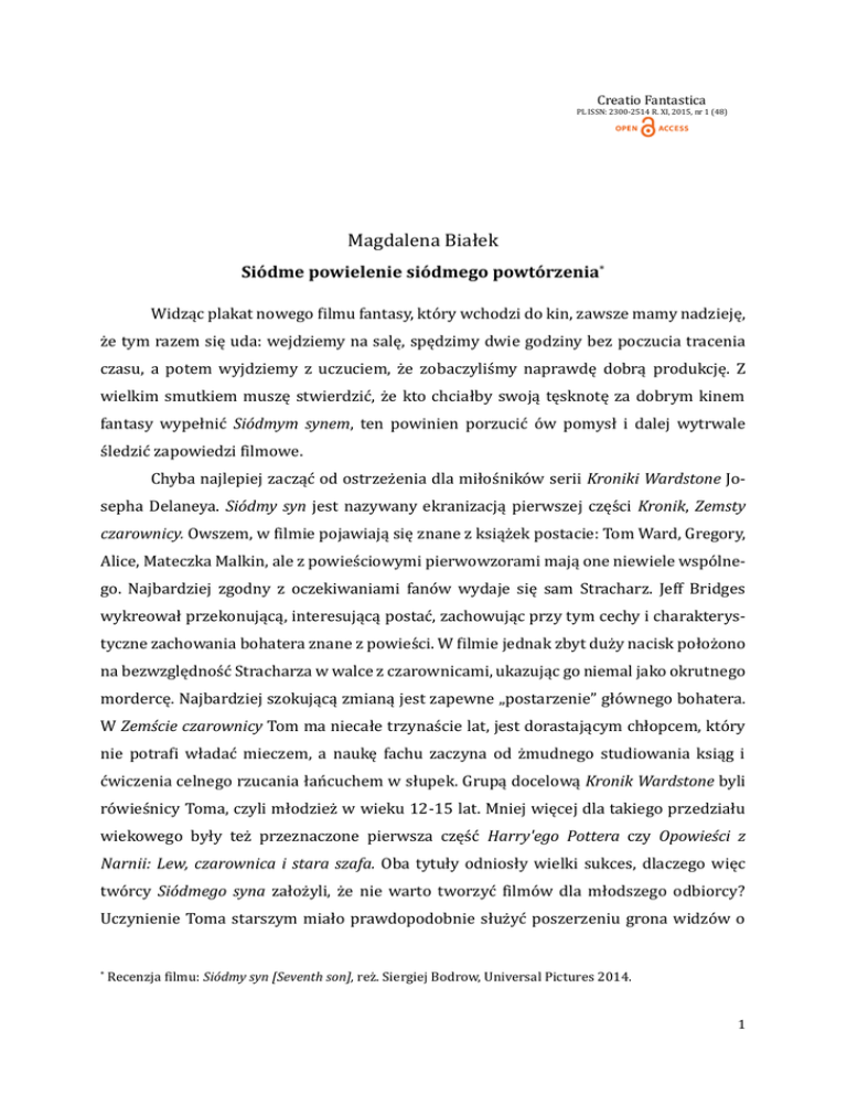 Creatio Fantastica PL ISSN: 2300-2514 R. XI, 2015, nr 1 (48) Magdalena Białek Siódme powielenie siódmego powtórzenia* Widząc plakat nowego filmu fantasy, ktory wchodzi do kin, zawsze mamy nadzieję, ze tym razem się uda: wejdziemy na salę, spędzimy dwie godziny bez poczucia tracenia czasu, a potem wyjdziemy z uczuciem, ze zobaczylismy naprawdę dobrą produkcję. Z wielkim smutkiem muszę stwierdzic, ze kto chciałby swoją tęsknotę za dobrym kinem fantasy wypełnic Siódmym synem, ten powinien porzucic ow pomysł i dalej wytrwale sledzic zapowiedzi filmowe. Chyba najlepiej zacząc od ostrzezenia dla miłosnikow serii Kroniki Wardstone Josepha Delaneya. Siódmy syn jest nazywany ekranizacją pierwszej częsci Kronik, Zemsty czarownicy. Owszem, w filmie pojawiają się znane z ksiązek postacie: Tom Ward, Gregory, Alice, Mateczka Malkin, ale z powiesciowymi pierwowzorami mają one niewiele wspolnego. Najbardziej zgodny z oczekiwaniami fanow wydaje się sam Stracharz. Jeff Bridges wykreował przekonującą, interesującą postac, zachowując przy tym cechy i charakterystyczne zachowania bohatera znane z powiesci. W filmie jednak zbyt duzy nacisk połozono na bezwzględnosc Stracharza w walce z czarownicami, ukazując go niemal jako okrutnego mordercę. Najbardziej szokującą zmianą jest zapewne „postarzenie” głownego bohatera. W Zemście czarownicy Tom ma niecałe trzynascie lat, jest dorastającym chłopcem, ktory nie potrafi władac mieczem, a naukę fachu zaczyna od zmudnego studiowania ksiąg i cwiczenia celnego rzucania łancuchem w słupek. Grupą docelową Kronik Wardstone byli rowiesnicy Toma, czyli młodziez w wieku 12-15 lat. Mniej więcej dla takiego przedziału wiekowego były tez przeznaczone pierwsza częsc Harry'ego Pottera czy Opowieści z Narnii: Lew, czarownica i stara szafa. Oba tytuły odniosły wielki sukces, dlaczego więc tworcy Siódmego syna załozyli, ze nie warto tworzyc filmow dla młodszego odbiorcy? Uczynienie Toma starszym miało prawdopodobnie słuzyc poszerzeniu grona widzow o * Recenzja filmu: Siódmy syn [Seventh son], rez. Siergiej Bodrow, Universal Pictures 2014. 1 młodych dorosłych (young adults), umozliwic pokazanie scen walki i rozwinięcie wątku romantycznego. Czy jednak było warto? Wydaje mi się, ze po siedmiokroc – nie. Przede wszystkim dlatego, ze ostatnio powstało sporo filmow YA, a tworcy Siódmego syna nie pokazali niczego oryginalnego – co kaze nazwac ten obraz filmem jednym z wielu. Dialogi niczym się nie wyrozniają; sprawiają wrazenie zlepka wypowiedzi z innych filmow fantasy. Akcja przebiega według schematu znanego z innych hollywoodzkich produkcji – łatwo przewidziec, co wydarzy się w większosci scen. Całosc wydaje się nieudolną probą stworzenia czegos pomiędzy Władcą pierścieni a Harrym Potterem (są nawet sceny przywodzące na mysl Monty Pythona i Świętego Graala). Stworzono nowe uniwersum, swiat kojarzący się z high fantasy, zrezygnowano natomiast z urokliwego klimatu Kronik Wardstone, ktorych akcja toczy się na angielskiej prowincji. Ujęcia są jednak przyjemne dla oka, sceny kręcone w gorach zachwycają, muzyka stanowi odpowiednie tło dla wydarzen, choc podobnie jak fabuła niczym się nie wyroznia. Na uwagę zasługują ciekawe kostiumy oraz efekty specjalne, a takze realistyczna animacja komputerowa (z tym jednak tego typu produkcje zazwyczaj nie mają problemu). Ostatnią drazliwą kwestią jest tytuł. Przed wybraniem się do kina zapytałam kolezankę, od ktorej pozyczałam kolejne tomy Kronik Wardstone, czy nie chciałaby wraz ze mną zobaczyc Siódmego syna, pomimo, ze trailer zapowiadał film mocno odbiegający od powiesci. Odpowiedziała mi: „Nie wiem, nie czytałam tego.” Podobna pomyłka prawdopodobnie przytrafiła się wielu fanom tworczosci Orsona Scotta Carda, ktorzy, widząc tytuł na plakatach, mogli się poczuc skonfundowani. Mozna jednak z nutą złosliwosci rzec, ze Siódmemu synowi rownie daleko do ekranizacji powiesci Delaneya, jak do ekranizacji powiesci Carda. 2