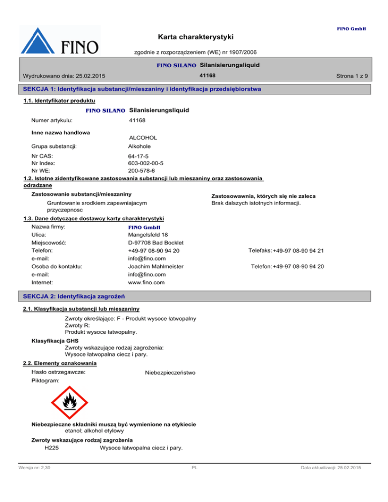 FINO GmbH Karta charakterystyki zgodnie z rozporządzeniem (WE) nr 1907/2006 FINO SILANO Silanisierungsliquid 41168 Wydrukowano dnia: 25.02.2015 Strona 1 z 9 SEKCJA 1: Identyfikacja substancji/mieszaniny i identyfikacja przedsiębiorstwa 1.1. Identyfikator produktu FINO SILANO Silanisierungsliquid Numer artykulu: Inne nazwa handlowa Grupa substancji: 41168 ALCOHOL Alkohole Nr CAS: 64-17-5 603-002-00-5 Nr Index: Nr WE: 200-578-6 1.2. Istotne zidentyfikowane zastosowania substancji lub mieszaniny oraz zastosowania odradzane Zastosowanie substancji/mieszaniny Zastosowawnia, których się nie zaleca Brak dalszych istotnych informacji. Gruntowanie srodkiem zapewniajacym przyczepnosc 1.3. Dane dotyczące dostawcy karty charakterystyki Nazwa firmy: Ulica: Miejscowość: Telefon: e-mail: FINO GmbH Osoba do kontaktu: e-mail: Joachim Mahlmeister [email protected] Internet: www.fino.com Mangelsfeld 18 D-97708 Bad Bocklet +49-97 08-90 94 20 [email protected] Telefaks: +49-97 08-90 94 21 Telefon: +49-97 08-90 94 20 SEKCJA 2: Identyfikacja zagrożeń 2.1. Klasyfikacja substancji lub mieszaniny Zwroty określające: F - Produkt wysoce łatwopalny Zwroty R: Produkt wysoce łatwopalny. Klasyfikacja GHS Zwroty wskazujące rodzaj zagrożenia: Wysoce łatwopalna ciecz i pary. 2.2. Elementy oznakowania Hasło ostrzegawcze: Niebezpieczeństwo Piktogram: Niebezpieczne składniki muszą być wymienione na etykiecie etanol; alkohol etylowy Zwroty wskazujące rodzaj zagrożenia H225 Wysoce łatwopalna ciecz i pary. Wersja nr: 2,30 PL Data aktualizacji: 25.02.2015 FINO GmbH Karta charakterystyki zgodnie z rozporządzeniem (WE) nr 1907/2006 FINO SILANO Silanisierungsliquid 41168 Wydrukowano dnia: 25.02.2015 Strona 2 z 9 Zwroty wskazujące środki ostrożności P210 Przechowywać z dala od źródeł ciepła/iskrzenia/otwartego ognia/gorących powierzchni. Palenie wzbronione. P233 Przechowywać pojemnik szczelnie zamknięty. P280 Stosować rękawice ochronne/odzież ochronną/ochronę oczu/ochronę twarzy. P302+P352 W PRZYPADKU KONTAKTU ZE SKÓRĄ: Umyć dużą ilością wody z mydłem. P403+P233 Przechowywać w dobrze wentylowanym miejscu. Przechowywać pojemnik szczelnie zamknięty. P501 Utylizacja zawartość/pojemnik usuwać zgodnie z przepisami/ regionalnych/lokalnych krajowych/ międzynarodowych regulamin. Porady dodatkowe Produkt jest zaszeregowany i oznakowany według wytycznych WE (Wspólnoty Europejskiej) lub według krajowych ustaw. 2.3. Inne zagrożenia Produkt powinien być oznakowany zgodnie z metodą obliczeniową "Ogólnych wytycznych klasyfikacji dla przygotowań EG" wg ostatniej obowiązującej wersji. SEKCJA 3: Skład/informacja o składnikach 3.2. Mieszaniny Charakterystyka chemiczna Mieszanina przedstawionych poniżej materiałów z nieszkodliwymi dodatkami. Wzór chemiczny: C2-H6-O1 Masa cząsteczkowa: 46,07 g/mol Składniki niebezpieczne Nr WE Nr CAS Nr Index Nr REACH Ilość Nazwa chemiczna Klasyfikacja Klasyfikacja GHS 200-578-6 64-17-5 etanol; alkohol etylowy F - Produkt wysoce łatwopalny R11 603-002-00-5 Flam. Liq. 2; H225 50-100 % Dosłowne brzmienie zwrotów R i H: patrz sekcja 16. Informacja uzupełniająca Brak dalszych danych. SEKCJA 4: Środki pierwszej pomocy 4.1. Opis środków pierwszej pomocy Wskazówki ogólne Nie wymaga się specjalnych środków. W przypadku wdychania Należy zadbać o należytą wentylację. W razie długotrwałego występowania dolegliwości sprowadzić lekarza. W przypadku kontaktu ze skórą Produkt nie jest w zasadzie drażniący. W przypadku kontaktu z oczami W przypadku kontaktu z oczami natychmiast przemyć je przez około 10 do 15 minut pod bieżącą wodą nie zamykając powiek. Wersja nr: 2,30 PL Data aktualizacji: 25.02.2015 FINO GmbH Karta charakterystyki zgodnie z rozporządzeniem (WE) nr 1907/2006 FINO SILANO Silanisierungsliquid 41168 Wydrukowano dnia: 25.02.2015 Strona 3 z 9 W przypadku połknięcia Jamę ustną przepłukać dokładnie wodą. W razie długotrwałego występowania dolegliwości sprowadzić lekarza. 4.2. Najważniejsze ostre i opóźnione objawy oraz skutki narażenia Brak danych. 4.3. Wskazania dotyczące wszelkiej natychmiastowej pomocy lekarskiej i szczególnego postępowania z poszkodowanym Brak dalszych istotnych informacji. SEKCJA 5: Postępowanie w przypadku pożaru 5.1. Środki gaśnicze Odpowiednie środki gaśnicze Dwutlenek węgla (CO2), Suchy środek gaśniczy W przypadku poważnego pożaru i dużych ilości: Strumień wody, piana na bazie alkoholi Niewłaściwe środki gaśnicze Pełny strumień wody 5.2. Szczególne zagrożenia związane z substancją lub mieszaniną Nie posiadamy dodatkowych danych. 5.3. Informacje dla straży pożarnej Nie wymaga się specjalnych środków. Informacja uzupełniająca żadne SEKCJA 6: Postępowanie w przypadku niezamierzonego uwolnienia do środowiska 6.1. Indywidualne środki ostrożności, wyposażenie ochronne i procedury w sytuacjach awaryjnych Zaprowadzić ludzi w bezpieczne miejsce. używać osobistego wyposażenia ochronnego. 6.2. Środki ostrożności w zakresie ochrony środowiska Nie odprowadzać do kanalizacji i zbiorników wodnych. Rozcieńczyć dużą ilością wody. 6.3. Metody i materiały zapobiegające rozprzestrzenianiu się skażenia i służące do usuwania skażenia Należy zebrać przy pomocy materiałów wiążących płyny (piasek, ziemia okrzemkowa, uniwersalny środek wiążący). Należy zadbać o należyte wietrzenie pomieszczeń i wentylację. 6.4. Odniesienia do innych sekcji Patrz punkt 7 i 8 środki ochronnne. Zebrany materiał traktować zgodnie z ustępem usunięcie. SEKCJA 7: Postępowanie z substancjami i mieszaninami oraz ich magazynowanie 7.1. Środki ostrożności dotyczące bezpiecznego postępowania Wskazówki odnośnie bezpiecznego obchodzenia się z substancją Przechowywać pojemnik szczelnie zamknięty. Wskazówki w zakresie ochrony ppoż i przeciwwybuchowej Nie przechowywać w pobliżu źródeł zapłonu - nie palić tytoniu. Zastosowa