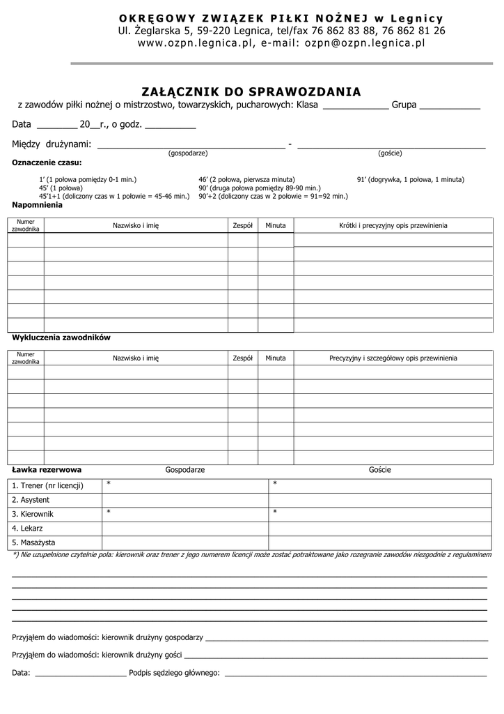 OKRĘGOWY ZWIĄZEK PIŁKI NOŻNEJ w Legnicy Ul. Żeglarska 5, 59-220 Legnica, tel/fax 76 862 83 88, 76 862 81 26 www.ozpn.legnica.pl, e-mail: [email protected] ZAŁĄCZNIK DO SPRAWOZDANIA z zawodów piłki nożnej o mistrzostwo, towarzyskich, pucharowych: Klasa _____________ Grupa _____________ Data ________ 20__r., o godz. __________ Między drużynami: _____________________________________ - _____________________________________ (gospodarze) (goście) Oznaczenie czasu: 1’ (1 połowa pomiędzy 0-1 min.) 45’ (1 połowa) 45’1+1 (doliczony czas w 1 połowie = 45-46 min.) Napomnienia Numer zawodnika 46’ (2 połowa, pierwsza minuta) 90’ (druga połowa pomiędzy 89-90 min.) 90’+2 (doliczony czas w 2 połowie = 91=92 min.) 91’ (dogrywka, 1 połowa, 1 minuta) Nazwisko i imię Zespół Minuta Krótki i precyzyjny opis przewinienia Nazwisko i imię Zespół Minuta Precyzyjny i szczegółowy opis przewinienia Wykluczenia zawodników Numer zawodnika Gospodarze Ławka rezerwowa 1. Trener (nr licencji) Goście * * * * 2. Asystent 3. Kierownik 4. Lekarz 5. Masażysta *) Nie uzupełnione czytelnie pola: kierownik oraz trener z jego numerem licencji może zostać potraktowane jako rozegranie zawodów niezgodnie z regulaminem __________________________________________________________________________________________________ __________________________________________________________________________________________________ __________________________________________________________________________________________________ __________________________________________________________________________________________________ __________________________________________________________________________________________________ Przyjąłem do wiadomości: kierownik drużyny gospodarzy ____________________________________________________________________ Przyjąłem do wiadomości: kierownik drużyny gości _________________________________________________________________________ Data: ______________________ Podpis sędziego głównego: _______________________________________________________________ 1/2