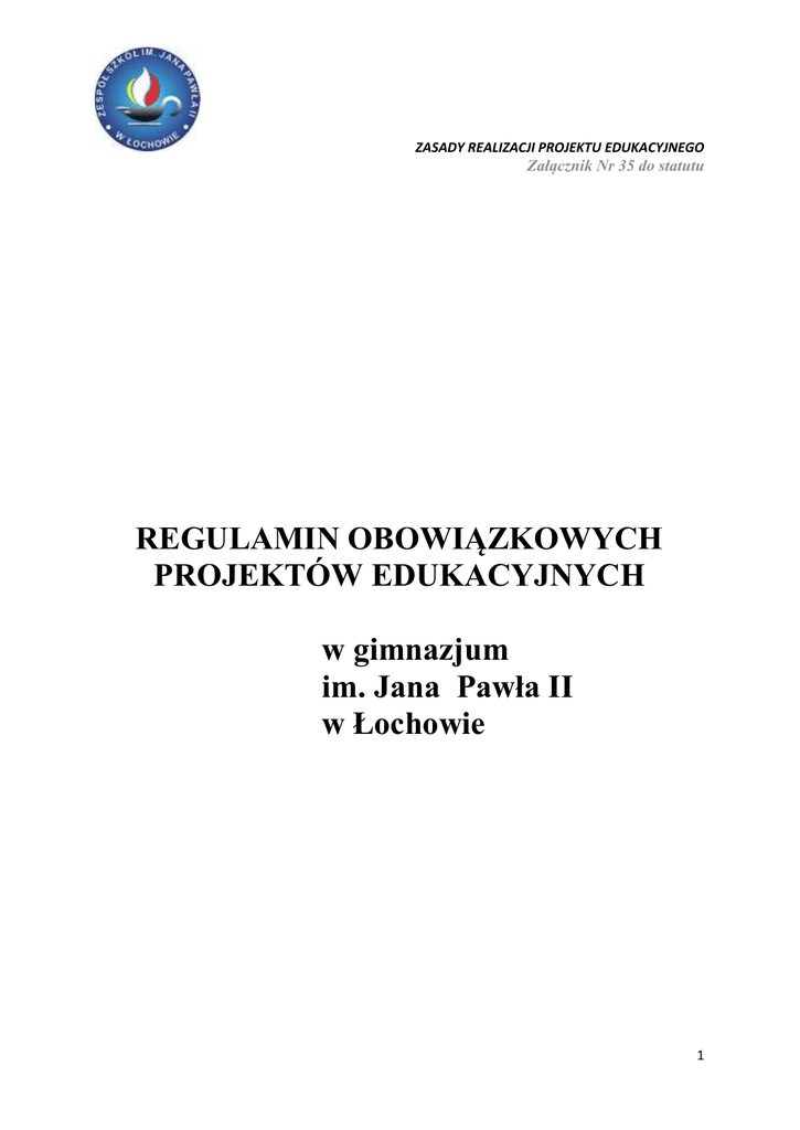 ZASADY REALIZACJI PROJEKTU EDUKACYJNEGO Załącznik Nr 35 do statutu REGULAMIN OBOWIĄZKOWYCH PROJEKTÓW EDUKACYJNYCH w gimnazjum im. Jana Pawła II w Łochowie 1 ZASADY REALIZACJI PROJEKTU EDUKACYJNEGO ROZPORZĄDZENIE MINISTRA EDUKACJI NARODOWEJ z dnia 20 sierpnia 2010 r. zmieniające rozporządzenie w sprawie warunków i sposobu oceniania, klasyfikowania i promowania uczniów i słuchaczy oraz przeprowadzania sprawdzianów i egzaminów w szkołach publicznych (Dz. U., nr 156, poz. 1046) (fragment dotyczący projektu edukacyjnego z komentarzami) § 21a. 1. Uczniowie gimnazjum biorą udział w realizacji projektu edukacyjnego. Od 1 września 2009 r. w gimnazjach obowiązuje nowa podstawa programowa kształcenia ogólnego, która kładzie nacisk m.in. na kształtowanie postaw uczniów, umożliwiających sprawne funkcjonowanie we współczesnym świecie. Udział w projekcie edukacyjnym jest obowiązkowy dla uczniów gimnazjum realizujących treści nowej podstawy programowej. Muszą oni (poza wyjątkami określonymi w ust. 9) podczas nauki w gimnazjum wziąć udział w co najmniej jednym projekcie. 2. Projekt edukacyjny jest zespołowym, planowym działaniem uczniów, mającym na celu rozwiązanie konkretnego problemu, z zastosowaniem różnorodnych metod. Zdefiniowany tam projekt jest działaniem zespołowym (nie może to być więc projekt indywidualny, który także bywa stosowany jako metoda pracy) i planowym, mającym na celu rozwiązanie konkretnego problemu. Ten ostatni aspekt jest szczególnie ważny. Uczniowie powinni rozwiązać problem zawarty w temacie projektu. Może być on sformułowany np. w postaci pytania problemowego (Jak...? Dlaczego…? W jaki sposób…? Co możemy zrobić, żeby…? itp.). Taka forma projektu jest trudniejsza, ale rozwija więcej umiejętności. 3. Zakres tematyczny projektu edukacyjnego może dotyczyć wybranych treści nauczania określonych w podstawie programowej kształcenia ogólnego dla gimnazjów lub wykraczać poza te treści. Nowa podstawa programowa kształcenia ogólnego wskazuje na konieczność wykorzystywania przez nauczycieli w procesie kształcenia różnorodnych metod aktywizujących, w tym metody projektu edukacyjnego. Udział w projekcie umożliwi uczniom wykazanie się umiejętnościami, których nie można sprawdzić w trakcie egzaminu testowego. Tematyki projektów można szukać w treściach podstawy lub poza nią. Projekty mogą dotyczyć jednego przedmiotu bądź mieć charakter interdyscyplinarny. 4. Projekt edukacyjny jest realizowany przez zespół uczniów pod opieką nauczyciela i obejmuje następujące działania: 1) wybranie tematu projektu edukacyjnego; 2) określenie celów projektu edukacyjnego i zaplanowanie etapów jego realizacji; 2 ZASADY REALIZACJI PROJEKTU EDUKACYJNEGO 3) wykonanie zaplanowanych działań; 4) publiczne przedstawienie rezultatów projektu edukacyjnego. Istotę projektu stanowi fakt, iż realizowany jest on przez zespół uczniów, a nauczyciel jedynie wspiera ich działania. Samodzielne podejmowanie decyzji, możliwość wyboru sposobu realizacji zadań oraz odpowiedzialność za ich wykonanie powodują, że uczniowie w naturalny sposób uczą się planowania i organizowania swojej pracy, rozwiązywania problemów i współpracy w zespole. Nabywają także umiejętność prezentowania efektów podjętych wspólnie działań oraz rozwijają swoje pasje i zainteresowania. 5. Szczegółowe warunki realizacji projektu edukacyjnego określa dyrektor gimnazjum w porozumieniu z radą pedagogiczną. 6. Kryteria oceniania zachowania ucznia gimnazjum zawarte w ocenianiu wewnątrzszkolnym uwzględniają udział ucznia w realizacji projektu edukacyjnego. Ponieważ celem wprowadzenia obowiązku realizacji zespołowego projektu edukacyjnego przez uczniów gimnazjum jest kształtowanie odpowiednich postaw i umiejętności uczniów, proponuje się, aby udział ucznia w realizacji projektu edukacyjnego był brany pod uwagę przy ustalaniu oceny zachowania ucznia. Szkoły są zatem zobligowane do uwzględnienia udziału ucznia w realizacji projektu edukacyjnego w kryteriach oceniania zachowania, zawartych w wewnątrzszkolnym systemie oceniania. Szkoły powinny dostosować swoje statuty w tym zakresie do 30 listopada 2010 r. 7. Wychowawca klasy na początku roku szkolnego, w którym uczniowie będą realizować projekt edukacyjny, informuje uczniów i ich rodziców (prawnych opiekunów) o warunkach realizacji projektu edukacyjnego. Zapoznanie uczniów i rodziców z warunkami realizacji projektu to zadanie wychowawcy, z którego powinien się wywiązać na początku roku szkolnego. Wychowawcy klas gimnazjum są zobowiązani poinformować uczniów i ich rodziców (opiekunów prawnych) o warunkach realizacji projektu edukacyjnego w terminie do 30 listopada. 8. Informacje o udziale ucznia w realizacji projektu edukacyjnego oraz temat projektu edukacyjnego wpisuje się na świadectwie ukończenia gimnazjum. Bez względu na to, w której klasie uczeń zrealizuje projekt edukacyjny, informacja o tym udziale oraz temat projektu będą wpisane na świadectwie ukończenia gimnazjum. 9. W szczególnie uzasadnionych przypadkach, uniemożliwiających udział ucznia w realizacji projektu edukacyjnego, dyrektor gimnazjum może zwolnić ucznia z realizacji projektu edukacyjnego. Rozporządzenie nie precyzuje przypadków, w których dyrektor szkoły może zwolnić ucznia z 3 ZASADY REALIZACJI PROJEKTU EDUKACYJNEGO realizacji projektu, pozostawiając to jego decyzji. To dyrektor rozstrzyga, w jakich sytuacjach losowych, zdrowotnych czy innych uczeń nie jest w stanie zrealizować projektu. 10. W przypadkach, o których mowa w ust. 9, na świadectwie ukończenia gimnazjum w miejscu przeznaczonym na wpisanie informacji o udziale ucznia w realizacji projektu edukacyjnego wpisuje się „zwolniony” albo „zwolniona”. 4 ZASADY REALIZACJI PROJEKTU EDUKACYJNEGO Celem projektu jest kształcenie u uczniów: 1. Odpowiedzialności za w