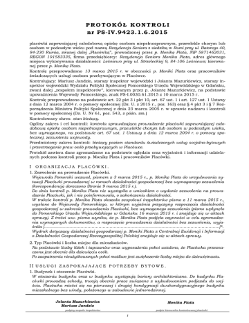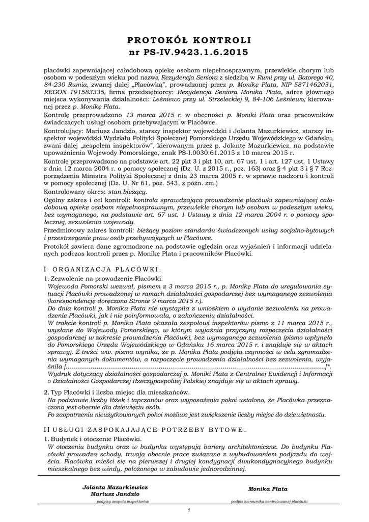 PROTOKÓŁ KONTROLI nr PS-IV.9423.1.6.2015 placówki zapewniającej całodobową opiekę osobom niepełnosprawnym, przewlekle chorym lub osobom w podeszłym wieku pod nazwą Rezydencja Seniora z siedzibą w Rumi przy ul. Batorego 40, 84-230 Rumia, zwanej dalej „Placówką”, prowadzonej przez p. Monikę Plata, NIP 5871462031, REGON 191583335, firma przedsiębiorcy: Rezydencja Seniora Monika Plata, adres głównego miejsca wykonywania działalności: Leśniewo przy ul. Strzeleckiej 9, 84-106 Leśniewo; kierowanej przez p. Monikę Plata. Kontrolę przeprowadzono 13 marca 2015 r. w obecności p. Moniki Plata oraz pracowników świadczących usługi osobom przebywającym w Placówce. Kontrolujący: Mariusz Jandzio, starszy inspektor wojewódzki i Jolanta Mazurkiewicz, starszy inspektor wojewódzki Wydziału Polityki Społecznej Pomorskiego Urzędu Wojewódzkiego w Gdańsku, zwani dalej „zespołem inspektorów”, kierowanym przez p. Jolantę Mazurkiewicz, na podstawie upoważnienia Wojewody Pomorskiego, znak PS-I.0030.61.2015 z 10 marca 2015 r. Kontrolę przeprowadzono na podstawie art. 22 pkt 3 i pkt 10, art. 67 ust. 1 i art. 127 ust. 1 Ustawy z dnia 12 marca 2004 r. o pomocy społecznej (Dz. U. z 2015 r., poz. 163) oraz § 4 pkt 3 i § 7 Rozporządzenia Ministra Polityki Społecznej z dnia 23 marca 2005 r. w sprawie nadzoru i kontroli w pomocy społecznej (Dz. U. Nr 61, poz. 543, z późn. zm.) Kontrolowany okres: stan bieżący. Ogólny zakres i cel kontroli: kontrola sprawdzająca prowadzenie placówki zapewniającej całodobową opiekę osobom niepełnosprawnym, przewlekle chorym lub osobom w podeszłym wieku, bez wymaganego, na podstawie art. 67 ust. 1 Ustawy z dnia 12 marca 2004 r. o pomocy społecznej, zezwolenia wojewody. Przedmiotowy zakres kontroli: bieżący poziom standardu świadczonych usług socjalno-bytowych i przestrzeganie praw osób przebywających w Placówce. Protokół zawiera dane zgromadzone na podstawie oględzin oraz wyjaśnień i informacji udzielanych podczas kontroli przez p. Monikę Plata i pracowników Placówki. I ORGANIZACJA PLACÓWKI. 1. Zezwolenie na prowadzenie Placówki. Wojewoda Pomorski wezwał, pismem z 3 marca 2015 r., p. Monikę Plata do uregulowania sytuacji Placówki prowadzonej w ramach działalności gospodarczej bez wymaganego zezwolenia (korespondencję doręczono Stronie 9 marca 2015 r.). Do dnia kontroli p. Monika Plata nie wystąpiła z wnioskiem o wydanie zezwolenia na prowadzenie Placówki, jak i nie poinformowała, o zakończeniu działalności. W trakcie kontroli p. Monika Plata okazała zespołowi inspektorów pismo z 11 marca 2015 r., wysłane do Wojewody Pomorskiego, w którym wyjaśnia przyczyny rozpoczęcia działalności gospodarczej w zakresie prowadzenia Placówki, bez wymaganego zezwolenia (pismo wpłynęło do Pomorskiego Urzędu Wojewódzkiego w Gdańsku 16 marca 2015 r. i znajduje się w aktach sprawy). Z treści ww. pisma wynika, że p. Monika Plata podjęła czynności w celu zgromadzenia wymaganych dokumentów, a rozpoczęcie prowadzenia działalności bez zezwolenia, wyjaśniła […………………………………………………………………………………………………………..….]*. Wydruk dotyczący działalności gospodarczej p. Moniki Plata z Centralnej Ewidencji i Informacji o Działalności Gospodarczej Rzeczypospolitej Polskiej znajduje się w aktach sprawy. 2. Typ Placówki i liczba miejsc dla mieszkańców. Na podstawie liczby łóżek i tapczanów oraz wyposażenia pokoi ustalono, że Placówka przeznaczona jest obecnie dla dziewięciu osób. Po zaopatrzeniu nieużytkowanych pokoi możliwe jest zwiększenie liczby miejsc do dziewiętnastu. II USŁUGI ZASPOKAJAJĄCE POTRZEBY BYTOWE . 1. Budynek i otoczenie Placówki. W otoczeniu budynku oraz w budynku występują bariery architektoniczne. Do budynku Placówki prowadzą schody, trwają obecnie prace związane z wybudowaniem podjazdu do wejścia. Placówka mieści się na pierwszej i drugiej kondygnacji dwukondygnacyjnego budynku mieszkalnego bez windy, położonego w zabudowie jednorodzinnej. Jolanta Mazurkiewicz Mariusz Jandzio Monika Plata podpisy zespołu inspektorów podpis kierownika kontrolowanej placówki 1 Protokół nr PS-IV.9423.1.6.2015 z przeprowadzonej w dniu 13 marca 2015 r. kontroli standardu świadczonych usług przez placówkę zapewniającą całodobową opiekę osobom niepełnosprawnym, przewlekle chorym lub osobom w podeszłym wieku pod nazwą „Rezydencja Seniora, z siedzibą w Rumi przy ul. Batorego 40, 84-230 Rumia. 1. Budynek i otoczenie Placówki. Pokoje dla mieszkańców znajdują się na pierwszej i drugiej kondygnacji. […………………………..…………………………………………………………………………………………]* […………………………..…………………………………………………………………………………………]* […………………………..…………………………………………………………………………………………]* […………………………..…………………………………………………………………………………………]* […………………………..…………………………………………………………………………………………]* […………………………..…………………………………………………………………………………………]* […………………………..…………………………………………………………………………………………]* […………………………..…………………………………………………………………………………………]* […………………………..…………………………………………………………………………………………]* […………………………..………………………………