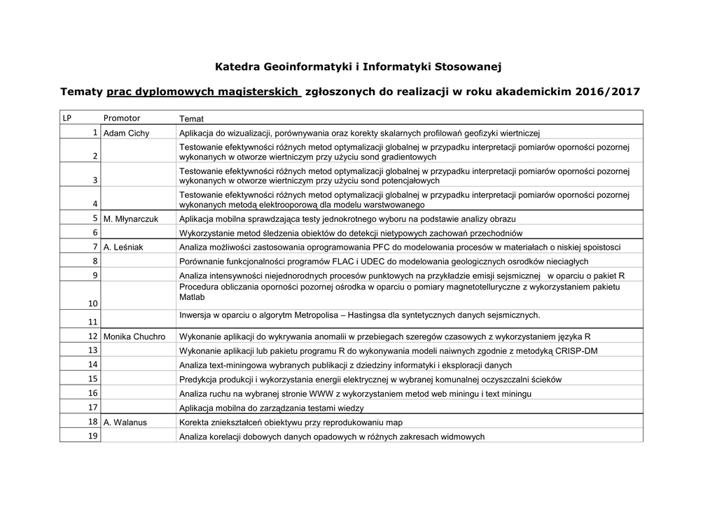 Katedra Geoinformatyki i Informatyki Stosowanej Tematy prac