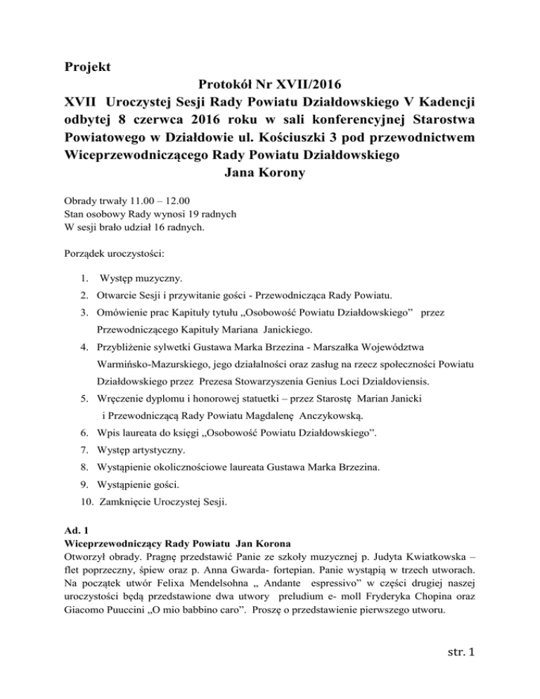 Projekt Protokół Nr XVII/2016 XVII Uroczystej Sesji Rady Powiatu Działdowskiego V Kadencji odbytej 8 czerwca 2016 roku w sali konferencyjnej Starostwa Powiatowego w Działdowie ul. Kościuszki 3 pod przewodnictwem Wiceprzewodniczącego Rady Powiatu Działdowskiego Jana Korony Obrady trwały 11.00 – 12.00 Stan osobowy Rady wynosi 19 radnych W sesji brało udział 16 radnych. Porządek uroczystości: 1. Występ muzyczny. 2. Otwarcie Sesji i przywitanie gości - Przewodnicząca Rady Powiatu. 3. Omówienie prac Kapituły tytułu „Osobowość Powiatu Działdowskiego” przez Przewodniczącego Kapituły Mariana Janickiego. 4. Przybliżenie sylwetki Gustawa Marka Brzezina - Marszałka Województwa Warmińsko-Mazurskiego, jego działalności oraz zasług na rzecz społeczności Powiatu Działdowskiego przez Prezesa Stowarzyszenia Genius Loci Dzialdoviensis. 5. Wręczenie dyplomu i honorowej statuetki – przez Starostę Marian Janicki i Przewodniczącą Rady Powiatu Magdalenę Anczykowską. 6. Wpis laureata do księgi „Osobowość Powiatu Działdowskiego”. 7. Występ artystyczny. 8. Wystąpienie okolicznościowe laureata Gustawa Marka Brzezina. 9. Wystąpienie gości. 10. Zamknięcie Uroczystej Sesji. Ad. 1 Wiceprzewodniczący Rady Powiatu Jan Korona Otworzył obrady. Pragnę przedstawić Panie ze szkoły muzycznej p. Judyta Kwiatkowska – flet poprzeczny, śpiew oraz p. Anna Gwarda- fortepian. Panie wystąpią w trzech utworach. Na początek utwór Felixa Mendelsohna „ Andante espressivo” w części drugiej naszej uroczystości będą przedstawione dwa utwory preludium e- moll Fryderyka Chopina oraz Giacomo Puuccini „O mio babbino caro”. Proszę o przedstawienie pierwszego utworu. str. 1 Ad.2 Szanowni Państwo! Jestem zaszczycony, że w imieniu Rady Powiatu, Pana Starosty i swoim własnym mogę powitać ze szczególną atencją Pana Gustawa Marka Brzezina Marszałka Województwa Warmińsko – Mazurskiego. Powitał zaproszonych na uroczyste obrady gości, burmistrzów, wójtów, kierowników służb, inspekcji i straży oraz dyrektorów szkół z imienia i nazwiska, oraz wszystkich radnych, p. Starostę Działdowskiego Mariana Janickiego oraz Wicestarostę Mariana Brandta. /Lista obecności radnych stanowi załącznik do niniejszego protokołu/ Poproszę Pana Starostę Działdowskiego Mariana Janickiego o przedstawienie prac Kapituły „Osobowość Powiatu Działdowskiego” Ad. 3 Marian Janicki Starosta Działdowski Panie Przewodniczący, Panie Marszałku, Pani radna, koledzy burmistrzowie, wójtowie, dostojni goście, koledzy radni i wszyscy Państwo obecni na dzisiejszej uroczystej sesji. W dniu 15 marca 2016r. w tej sali Starostwa Powiatowego odbyło się posiedzenie Kapituły tytułu „Osobowość Powiatu Działdowskiego”. W posiedzeniu uczestniczyło 7 osób, czyli pełen skład kapituły. Jako przewodniczący kapituły przedstawiłem treść wniosku o nadanie tytułu honorowego „Osobowość Powiatu Działdowskiego” Panu Gustawowi Markowi Brzezinowi Marszałkowi Województwa Warmińsko – Mazurskiego, Wniosek złożono w dniu 29 lutego 2016r. w imieniu 260 mieszkańców przez p. Władysława Kubińskiego. Jest to zgodne z § 4 ust.1 pkt 4 uchwały XII/127/2012 Rady Powiatu Działdowskiego z dnia 15 lutego 2012r. w brzmieniu „Wniosek o nadanie tytułu maja prawo zgłaszać mieszkańcy Powiatu w formie inicjatywy obywatelskiej popartej co najmniej przez 100 mieszkańców Powiatu Działdowskiego oraz zgodnie z § 4 pkt 3 w/w uchwały w brzmieniu „Wnioski przyjmowane są w Starostwie Powiatowym w Działdowie do końca lutego każdego roku” Wniosek spełniał wszystkie wymogi formalne. Kapituła w dniu 15 marca po omówieniu treści uzasadnienia przegłosowała kandydaturę Pana Gustawa Marka Brzezina jako Osobowości Powiatu Działdowskiego i z takim wnioskiem został dokument złożony do Rady Powiatu, która na ostatniej sesji podjęła uchwałę o nadaniu tytułu . O pełniejsze uzasadnienie poproszę p. Władysława Kubińskiego, który w imieniu tych 260 mieszkańców złożył taki wniosek. Dla przypomnienia powiem, że p. Władysław Kubiński był wieloletnim radnym Rady Powiatowej a w ostatniej kadencji był jej przewodniczącym. Ad.4 Władysław Kubiński – Prezes Stowarzyszenia Genius Loci Dzialdoviensis Pani Przewodnicząca, Wysoka Rado, Panie Marszałku, Panie Starosto, Szanowni Goście Uchwałą Rady Powiatu z dnia 15 lutego 2012 roku ustanowiono tytuł honorowy „Osobowość Powiatu Działdowskiego”. § 2 pkt. 1 tej uchwały brzmi: tytuł „Osobowość Powiatu Działdowskiego” jest wyrazem uhonorowania za wybitne zasługi na rzecz rozwoju i promocji Powiatu Działdowskiego. Z wielkim zadowoleniem stwierdzam, że nie musiałem się zbytnio natrudzić, aby dowieść, że honor ten przysługuje Panu Marszałkowi Markowi Gustawowi Brzezinowi. Problemy, z którymi przyszło nam się wspólnie zmierzyć były bardzo skomplikowane i na ich rozwiązanie działdowszczyzna czekała wiele lat a nawet dziesięcioleci, zaangażowanie Pana Marszałka w ich rozwiązywaniu było dla nas bardzo istotne. Zapis wzmiankowanej wyżej uchwały w § 4 pkt. 4 brzmi: mieszkańcy powiatu w formie inicjatywy obywatelskiej popartej, przez co najmniej 100 mieszkańców powiatu działdowskiego mogą składać wniosek (i my to zrobili myślę tu o Stowarzyszeniu str. 2 Dzialdowiensis Genius Loci o nadanie tego tytułu). Jest to czwarta edycja nadania tego honorowego tytułu, a pierwszy przypadek, którego inicjatorem jest podmiot społeczny. Po raz pierwszy, też honorowany będzie polityk wojewódzki, a przecież nie tak dawno myślano o rokoszu z województwa warmińsko – mazurskiego (wtedy czuliśmy się, jak nie u siebie). W zmianę tego odczucia zaangażowany również Pan Marszałek. Pan Marszałek ma też wiele innych zasług, które widoczne są gołym okiem: 1. Zaangażowanie i pomoc w budowie infrastruktury komunalnej, w której byliśmy mocno zapóźnie