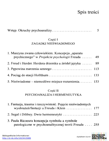 Spis treści Wstęp. Okruchy psychoanalizy 5 Część I ZAGADKI NIEŚWIADOMEGO 1. Maszyna zwana człowiekiem. Koncepcja „aparatu psychicznego" w Projekcie psychologii Freuda 49 2. Freud i Herder. Herdera drzemka u źródeł języka 89 3. Pępowina marzenia sennego 113 4. Pociąg do stacji Hollthurn 133 5. Nieświadome - niemożliwe miejsce rozumienia 153 Część II PSYCHOANALIZA I HERMENEUTYKA 1. Fantazja, trauma i rzeczywistość. Pojęcie nieświadomych wyobrażeń/fantazji u Freuda i Klein 177 2. Segal i Dilthey. Dwie hermeneutyki 225 3. Paula Ricoeura koncepcja symbolu a symbole patologiczne w psychoanalitycznej teorii Freuda .... 255 http://d-nb.info/1023415089 Część III DYLEMATY PSYCHOANALIZY 1. Trzy dylematy 287 2. Dylemat pierwszy: świadomość czy nieświadome? 293 3. Dylemat drugi: mit indywidualny czy mit zbiorowy, czyli co wspólnego ma psychoanalityk z szamanem?... 309 4. Dylemat trzeci: interpretować symptom czy go „przekraczać"? 335 Część IV FREUD I POLITYKA 1. Polityka jako antagonizm. Implikacje myśli politycznej Sigmunda Freuda 389 2. Freud i polityka (wywiad Przemysława Szubartowicza) 427 Bibliografia 437 Indeks nazwisk 441 Indeks rzeczowy 445 Summary 449