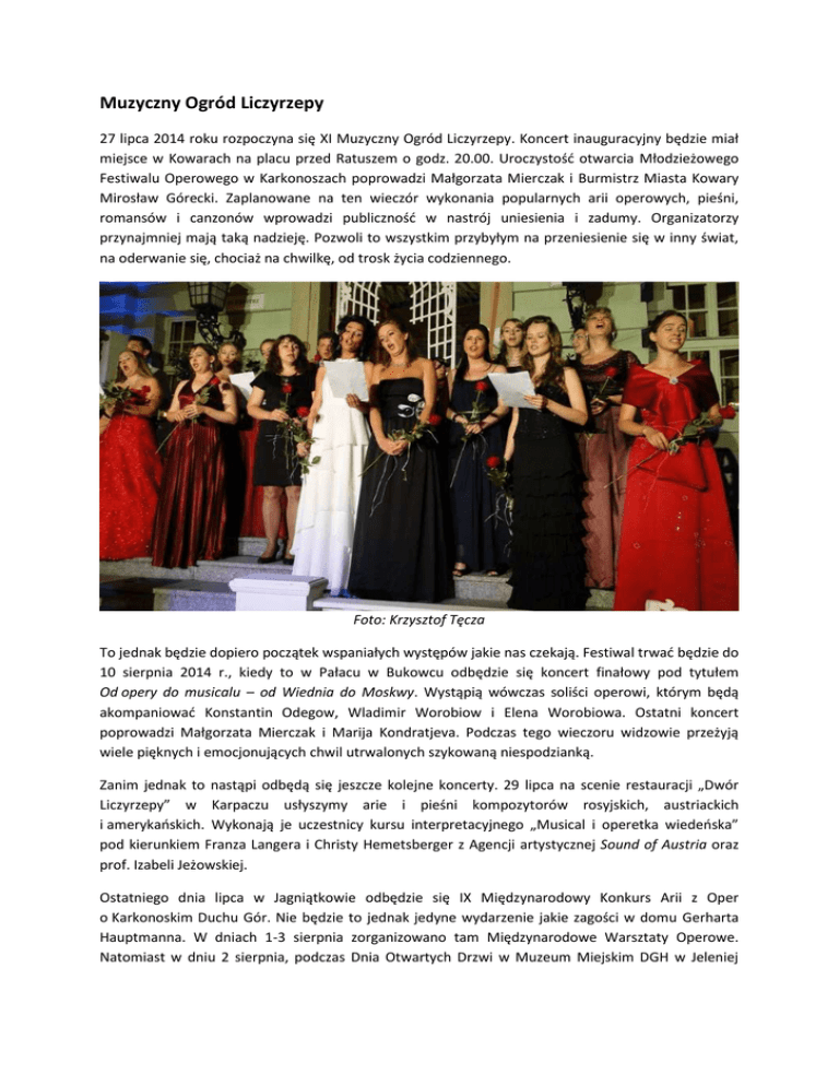 Muzyczny Ogród Liczyrzepy 27 lipca 2014 roku rozpoczyna się XI Muzyczny Ogród Liczyrzepy. Koncert inauguracyjny będzie miał miejsce w Kowarach na placu przed Ratuszem o godz. 20.00. Uroczystość otwarcia Młodzieżowego Festiwalu Operowego w Karkonoszach poprowadzi Małgorzata Mierczak i Burmistrz Miasta Kowary Mirosław Górecki. Zaplanowane na ten wieczór wykonania popularnych arii operowych, pieśni, romansów i canzonów wprowadzi publiczność w nastrój uniesienia i zadumy. Organizatorzy przynajmniej mają taką nadzieję. Pozwoli to wszystkim przybyłym na przeniesienie się w inny świat, na oderwanie się, chociaż na chwilkę, od trosk życia codziennego. Foto: Krzysztof Tęcza To jednak będzie dopiero początek wspaniałych występów jakie nas czekają. Festiwal trwać będzie do 10 sierpnia 2014 r., kiedy to w Pałacu w Bukowcu odbędzie się koncert finałowy pod tytułem Od opery do musicalu – od Wiednia do Moskwy. Wystąpią wówczas soliści operowi, którym będą akompaniować Konstantin Odegow, Wladimir Worobiow i Elena Worobiowa. Ostatni koncert poprowadzi Małgorzata Mierczak i Marija Kondratjeva. Podczas tego wieczoru widzowie przeżyją wiele pięknych i emocjonujących chwil utrwalonych szykowaną niespodzianką. Zanim jednak to nastąpi odbędą się jeszcze kolejne koncerty. 29 lipca na scenie restauracji „Dwór Liczyrzepy” w Karpaczu usłyszymy arie i pieśni kompozytorów rosyjskich, austriackich i amerykańskich. Wykonają je uczestnicy kursu interpretacyjnego „Musical i operetka wiedeńska” pod kierunkiem Franza Langera i Christy Hemetsberger z Agencji artystycznej Sound of Austria oraz prof. Izabeli Jeżowskiej. Ostatniego dnia lipca w Jagniątkowie odbędzie się IX Międzynarodowy Konkurs Arii z Oper o Karkonoskim Duchu Gór. Nie będzie to jednak jedyne wydarzenie jakie zagości w domu Gerharta Hauptmanna. W dniach 1-3 sierpnia zorganizowano tam Międzynarodowe Warsztaty Operowe. Natomiast w dniu 2 sierpnia, podczas Dnia Otwartych Drzwi w Muzeum Miejskim DGH w Jeleniej Górze (Jagniątkowie) zaśpiewają uczestnicy kursów prowadzonych tak jak poprzednio przez prof. Izabelę Jeżowską oraz Franza Langera i Christy Hemetsberger. Aby Międzynarodowe Warsztaty Operowe nie poszły na marne ich uczestnicy wystąpią w koncercie muzyki sakralnej jaki zostanie zorganizowany 3 sierpnia w świątyni Wang w Karpaczu Górnym. W dniach 5-7 sierpnia uczestnicy warsztatów oraz wykonawcy festiwalu odbędą próby z Orkiestrą Symfoniczną Filharmonii Dolnośląskiej, tak by 8 i 9 sierpnia dać wspólne koncerty. Pierwszy będzie koncertem muzyki operowej. W drugim, aby nie było tak poważnie, oprócz muzyki operowej usłyszymy muzykę operetkową i popularną. Oba koncerty poprowadzi dyrygent Lesław Sałacki. Jak więc widać każdy komu miła jest muzyka operowa, zarówno ta poważna, jak i nieco lżejsza, znajdzie coś dla siebie. Coś dla ucha i dla ducha. Nie bez znaczenia będą też walory estetyczne zwłaszcza, że przygotowano bardzo ciekawą oprawę. Muzyczny Ogród Liczyrzepy został zorganizowany przez Międzynarodowe Towarzystwo Artystyczne „Opera Duch Gór” w Karpaczu przy współpracy partnera organizacyjnego jakim jest Związek Gmin Karkonoskich w Bukowcu. Rozmach z jakim zorganizowano tegoroczny Festiwal zawdzięczamy kolejnym współorganizatorom, partnerom i sponsorom. Są to: Filharmonia Dolnośląska w Jeleniej Górze, Muzeum Miejskie Dom G. Hauptmanna (Jelenia Góra-Jagniątków) – gospodarz kursów wokalnych, Miasto Karpacz, Miasto Kowary i Hotel Relaks. Nie bez znaczenia jest tu także współpraca Agencji artystycznej Sound of Austria (Salzburg) i Agencji artystycznej Un Canto (Tallin). Krzysztof Tęcza