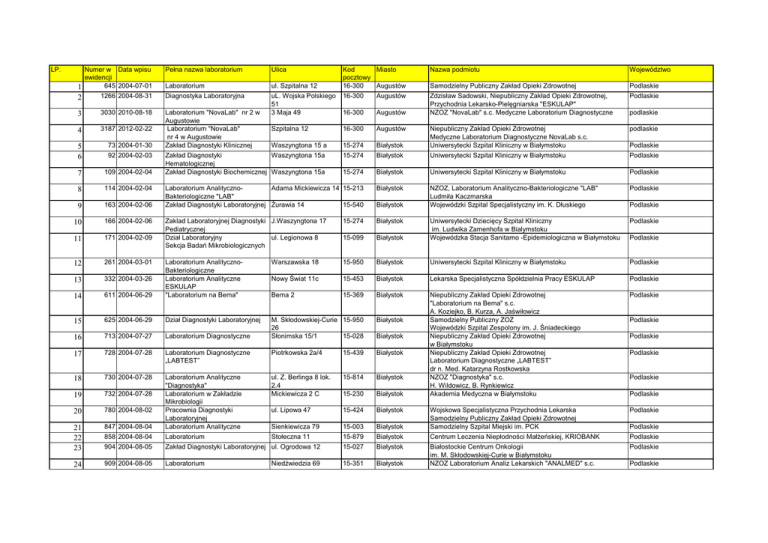 LP. Numer w Data wpisu ewidencji 645 2004-07-01 1 1266 2004-08-31 2 Pełna nazwa laboratorium Ulica Nazwa podmiotu Województwo Laboratorium ul. Szpitalna 12 Diagnostyka Laboratoryjna uL. Wojska Polskiego 51 3 Maja 49 16-300 Augustów Samodzielny Publiczny Zakład Opieki Zdrowotnej Podlaskie Zdzisław Sadowski, Niepubliczny Zakład Opieki Zdrowotnej, Przychodnia Lekarsko-Pielęgniarska "ESKULAP" NZOZ "NovaLab" s.c. Medyczne Laboratorium Diagnostyczne Podlaskie 16-300 Augustów Szpitalna 12 16-300 Augustów podlaskie Białystok Niepubliczny Zakład Opieki Zdrowotnej Medyczne Laboratorium Diagnostyczne NovaLab s.c. Uniwersytecki Szpital Kliniczny w Białymstoku Waszyngtona 15 a 15-274 Zakład Diagnostyki Waszyngtona 15a Hematologicznej Zakład Diagnostyki Biochemicznej Waszyngtona 15a 15-274 Białystok Uniwersytecki Szpital Kliniczny w Białymstoku Podlaskie 15-274 Białystok Uniwersytecki Szpital Kliniczny w Białymstoku Podlaskie Laboratorium AnalitycznoAdama Mickiewicza 14 15-213 Bakteriologiczne "LAB" Zakład Diagnostyki Laboratoryjnej Żurawia 14 15-540 Białystok NZOZ, Laboratorium Analityczno-Bakteriologiczne "LAB" Ludmiła Kaczmarska Wojewódzki Szpital Specjalistyczny im. K. Dłuskiego Podlaskie Zaklad Laboratoryjnej Diagnostyki J.Waszyngtona 17 Pediatrycznej Dział Laboratoryjny ul. Legionowa 8 Sekcja Badań Mikrobiologicznych 15-274 Białystok Podlaskie 15-099 Białystok Uniwersytecki Dziecięcy Szpital Kliniczny im. Ludwika Zamenhofa w Bialymstoku Wojewódzka Stacja Sanitarno -Epidemiologiczna w Białymstoku Warszawska 18 15-950 Białystok Uniwersytecki Szpital Kliniczny w Białymstoku Podlaskie Nowy Świat 11c 15-453 Białystok Lekarska Specjalistyczna Spółdzielnia Pracy ESKULAP Podlaskie Bema 2 15-369 Białystok Podlaskie M. Skłodowskiej-Curie 15-950 26 Słonimska 15/1 15-028 Białystok Niepubliczny Zakład Opieki Zdrowotnej "Laboratorium na Bema" s.c. A. Koziejko, B. Kurza, A. Jaświłowicz Samodzielny Publiczny ZOZ Wojewódzki Szpital Zespolony im. J. Śniadeckiego Niepubliczny Zakład Opieki Zdrowotnej w Białymstoku Niepubliczny Zakład Opieki Zdrowotnej Laboratorium Diagnostyczne „LABTEST” dr n. Med. Katarzyna Rostkowska NZOZ "Diagnostyka" s.c. H. Wildowicz, B. Rynkiewicz Akademia Medyczna w Białymstoku Podlaskie 3 3030 2010-08-18 4 3187 2012-02-22 5 6 73 2004-01-30 7 109 2004-02-04 8 114 2004-02-04 9 163 2004-02-06 10 166 2004-02-06 11 171 2004-02-09 12 261 2004-03-01 13 332 2004-03-26 14 611 2004-06-29 Laboratorium AnalitycznoBakteriologiczne Laboratorium Analityczne ESKULAP "Laboratorium na Bema" 15 625 2004-06-29 Dział Diagnostyki Laboratoryjnej 16 713 2004-07-27 Laboratorium Diagnostyczne 17 728 2004-07-28 Laboratorium Diagnostyczne „LABTEST” Piotrkowska 2a/4 15-439 Białystok 18 730 2004-07-28 Białystok 732 2004-07-28 ul. Z. Berlinga 8 lok. 2.4 Mickiewicza 2 C 15-814 19 15-230 Białystok 20 780 2004-08-02 ul. Lipowa 47 15-424 Białystok 21 22 23 847 2004-08-04 Laboratorium Analityczne "Diagnostyka" Laboratorium w Zakładzie Mikrobiologii Pracownia Diagnostyki Laboratoryjnej Laboratorium Analityczne Sienkiewicza 79 15-003 Białystok Wojskowa Specjalistyczna Przychodnia Lekarska Samodzielny Publiczny Zakład Opieki Zdrowotnej Samodzielny Szpital Miejski im. PCK 858 2004-08-04 Laboratorium Stołeczna 11 15-879 Białystok Centrum Leczenia Niepłodności Małżeńskiej, KRIOBANK Podlaskie 904 2004-08-05 Zakład Diagnostyki Laboratoryjnej ul. Ogrodowa 12 15-027 Białystok Podlaskie 24 909 2004-08-05 Laboratorium Niedźwiedzia 69 15-351 Białystok Białostockie Centrum Onkologii im. M. Skłodowskiej-Curie w Białymstoku NZOZ Laboratorium Analiz Lekarskich "ANALMED" s.c. 92 2004-02-03 Laboratorium "NovaLab" nr 2 w Augustowie Laboratorium "NovaLab" nr 4 w Augustowie Zakład Diagnostyki Klinicznej Kod Miasto pocztowy 16-300 Augustów Białystok Białystok podlaskie Podlaskie Podlaskie Podlaskie Podlaskie Podlaskie Podlaskie Podlaskie Podlaskie Podlaskie Podlaskie LP. Numer w Data wpisu ewidencji 1163 2004-08-23 25 Pełna nazwa laboratorium Ulica Zakład Diagnostyki Laboratoryjnej Fabryczna 27 Kod Miasto pocztowy 15-471 Białystok Nazwa podmiotu Województwo Zakład Opieki Zdrowotnej MSWiA Podlaskie Zespół pracowni ( cytologiczna, histopatologiczna) Laboratorium Analityczne Waszyngtona 13 15-269 Białystok Akademicki Ośrodek Diagnostyki Patomorfologicznej podlaskie Transportowa 4 15-399 Białystok NZOZ - Podlaskie Centrum Medyczne Podlaskie Waszyngtona 13 15-089 Białystok Akademia Medyczna w Białymstoku Podlaskie Waszyngtona 15A 15-274 Białystok Uniwersytecki Szpital Kliniczny w Białymstoku podlaskie 2494 2005-09-15 Zakład Genetyki Klinicznej Akademii Medycznej, Wydział Lekarski Zakład Diagnostyki Mikrobiologicznej i Immunologii Infekcyjnej Laboratorium Św. Rocha 3 15-879 Białystok Podlaskie 31 32 2717 2007-06-22 Laboratorium diagnostyczne Grochowa 2a 15-432 Białystok Ośrodek Diagnostyczno-Badawczy Chorób Przenoszonych Drogą Płciową NZOZ - Białostockie Centrum Analiz Medycznych sp. z o.o. 2847 2009-02-17 Antoniuk Fabryczny 10 15-741 Białystok 2883 2009-07-07 Antoniukowska 11 15-740 Białystok "Napromedica" Wasilewski i wspólnicy spółka jawna, NZOZ Diagnostyka Sp. z o.o. Podlaskie 33 34 2942 2009-11-13 Białystok Mastermed Kurzątkowski Zdrodowska Sp. P. podlaskie 3128 2011-07-07 ul. Legionowa 9A laboratorium nr 1, Sienkiewicza 53b 15-281 35 36 Pracownia Diagnostyczna Napromedica MEDYCZNE LABORATORIUM DIAGNOSTYKA Medyczne Laboratorium Diagnostyczne Nr 1 Pracownia Cytomorfologii 15-002 Białystok Niepubliczny Specjalistyczny ZOZ GIN-MED. s.c. podlaskie 3180 2012-02-15 Pracownia Genetyczna Parkowa 14/84 15-224 Białystok podlaskie 37 3216 2012-05-09 Zakład Diagnostyki Laboratoryjnej Stołeczna 7 lok. 100 i Mikrobiologicznej Dia-Bakter 15-879 Białystok Podlaskie Centrum Genetyki Klinicznej "Genetics" Ryszard Leśniewicz, Marian Gaiński spółka cywilna Dia-Bakter Diagnostyka Laboratoryjna-Mikrobiologia Katarzyna Leszczyńska 38 3300 2013-03