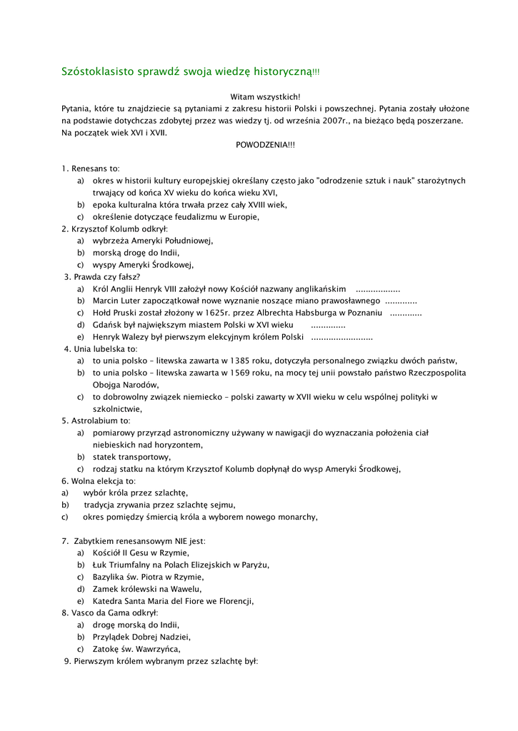 Szóstoklasisto sprawdź swoja wiedzę historyczną!!! Witam wszystkich! Pytania, które tu znajdziecie są pytaniami z zakresu historii Polski i powszechnej. Pytania zostały ułożone na podstawie dotychczas zdobytej przez was wiedzy tj. od września 2007r., na bieżąco będą poszerzane. Na początek wiek XVI i XVII. POWODZENIA!!! 1. Renesans to: a) okres w historii kultury europejskiej określany często jako "odrodzenie sztuk i nauk" starożytnych b) epoka kulturalna która trwała przez cały XVIII wiek, c) określenie dotyczące feudalizmu w Europie, trwający od końca XV wieku do końca wieku XVI, 2. Krzysztof Kolumb odkrył: a) wybrzeża Ameryki Południowej, b) c) morską drogę do Indii, wyspy Ameryki Środkowej, 3. Prawda czy fałsz? a) b) Król Anglii Henryk VIII założył nowy Kościół nazwany anglikańskim .................. Marcin Luter zapoczątkował nowe wyznanie noszące miano prawosławnego ............. c) Hołd Pruski został złożony w 1625r. przez Albrechta Habsburga w Poznaniu ............. d) e) Gdańsk był największym miastem Polski w XVI wieku .............. Henryk Walezy był pierwszym elekcyjnym królem Polski ......................... 4. Unia lubelska to: a) to unia polsko – litewska zawarta w 1385 roku, dotyczyła personalnego związku dwóch państw, b) to unia polsko – litewska zawarta w 1569 roku, na mocy tej unii powstało państwo Rzeczpospolita c) Obojga Narodów, to dobrowolny związek niemiecko – polski zawarty w XVII wieku w celu wspólnej polityki w szkolnictwie, 5. Astrolabium to: a) pomiarowy przyrząd astronomiczny używany w nawigacji do wyznaczania położenia ciał b) niebieskich nad horyzontem, statek transportowy, c) rodzaj statku na którym Krzysztof Kolumb dopłynął do wysp Ameryki Środkowej, 6. Wolna elekcja to: a) wybór króla przez szlachtę, b) tradycja zrywania przez szlachtę sejmu, c) okres pomiędzy śmiercią króla a wyborem nowego monarchy, 7. Zabytkiem renesansowym NIE jest: a) Kościół II Gesu w Rzymie, b) Łuk Triumfalny na Polach Elizejskich w Paryżu, c) Bazylika św. Piotra w Rzymie, d) Zamek królewski na Wawelu, e) Katedra Santa Maria del Fiore we Florencji, 8. Vasco da Gama odkrył: a) drogę morską do Indii, b) c) Przylądek Dobrej Nadziei, Zatokę św. Wawrzyńca, 9. Pierwszym królem wybranym przez szlachtę był: a) Stefan Batory z Siedmiogrodu, b) c) Henryk Walezy późniejszy król Francji, Zygmunt II August, 10. Jakie były przyczyny i skutki reformacji w Europie w XVI wieku? 11. Jakie były przyczyny i skutki odkryć geograficznych? 12. Zaznacz którzy z poniżej wymienionych postaci zaliczani są do twórców malarstwa renesansowego. a) b) Peter Paul Rubens, Francicsco Petrarca, Mikołaj Gomółka, Leonardo da Vinci, Rafael Santi, Michał Anioł, c) Caravaggio, Velazquez, Homer, 13. Przeczytaj tekst i odpowiedz na pytania. Tezy Marcina Lutra.34. Owe bowiem odpusty odnoszą się tylko do ustanowionych przez człowieka kar zadośćuczynienia w sakramencie pokuty,. [...)82. Dlaczego jednak papież nie uwalnia wszystkich dusz z czyśćca z przyczyny najświętszej miłości i najwyższej potrzeby dusz, co byłoby. rzeczą najsprawiedliwszą, gdy tymczasem nieskończona ilość dusz uwolnił on dla podłej monety. złożonej na budowy bazyliki - a więc rzeczy małej wagi, [...] 86. Dlaczego również nie buduje papież bazyliki św. Piotra raczej za własne, niż za pieniądze biednych chrześcijan. wszakże jego majątek jest znaczniejszy [...]. a) b) Czym był pust?. Co nie podobało się Marcinowi Lutrowi w działalności Kościoła Katolickiego? c) Na co Kościół przeznaczał pieniądze pobierane za odpust? 14. W czym przejawiała się wysoka pozycja szlachty polskiej w XVI stuleciu? 15. Elementami charakterystycznymi dla architektury renesansu były: a) zwartość planu, prostota, czytelność i harmonia bryły; portyki, arkady, półkoliste sklepienia, b) c) przepych, przeładowanie formy, ogromna ilość płaskorzeźb, ciężkość budowli, strzeliste łuki, sklepienia krzyżowo-żebrowe, witraże zdobiące okna, Odpowiedzi. 1A 2C 3 aP bF cF dP eP 4B 5A 6A 7 AB 8A 9B 10. Przyczyny: - sprzedaż odpustów przez Kościół, - przeświadczenie o zepsuciu kleru, - chęć reformy Kościoła, Skutki: - powstanie wyznań protestanckich, - wojny religijne w Europie, próba naprawy Kościoła, 11. Przyczyny: - chęć znalezienia nowej drogi morskiej do Indii, wyczerpanie bogactw naturalnych i chęć poszukiwania ich poza kontynentem europejskim, - sprawdzenie teorii o kulistości Ziemi, 12. B 13. a. b. Odpust jest darowaniem kary doczesnej za popełnione grzechy. M. Lutrowi nie podobało się odpuszczanie grzechów za pieniądze wiernych. (...)Dlaczego jednak papież nie uwalnia wszystkich dusz z czyśćca z przyczyny najświętszej miłości i najwyższej potrzeby dusz, co byłoby. rzeczą najsprawiedliwszą, gdy tymczasem nieskończona ilość dusz uwolnił on dla podłej monety.(...) c. Pieniądze ze „sprzedanych” odpustów przeznaczane były na budowę Bazyliki św. Piotra w Rzymie.(...) buduje papież bazyliki św. Piotra raczej za własne, niż za pieniądze biednych chrześcijan.(...) 14. Wysoka pozycja szlachty przejawiała się między innymi w tym, że miała ona jako jedyny stan świecki w Polsce wpływ na rządy poprzez Sejm Walny. Szlachta posiadała tez przywileje czyli specjalne prawa nadane jej przez królów polskich, dzięki czemu mogła swobodnie wpływać na poszczególne decyzje władcy. 15. A Zagadnienia dodatkowe dla uczniów zainteresowanych poszerzeniem wiedzy historycznej. Klasa VI. Wiek XVI. 1. Wojny religijne w Europie (Anglia, Niemcy i Francja). Przyczyny i skutki. Przebieg pierwszej wolnej elekcji. 2. Renesans w Wielkopolsce. 3. Zabytki renesansowe które można zobaczyć w Wielkopolsce – opisać architekturę wybranego zabytku. 4. Polityka zagraniczna ostatnich Jagiellonów. Wiek XVII 1. Wojny Rzeczpospolitej z Rosją (dymitriady). 2. Powstanie Chmielnick