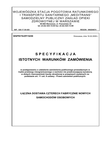 WOJEWÓDZKA STACJA POGOTOWIA RATUNKOWEGO I TRANSPORTU SANITARNEGO „MEDITRANS“ SAMODZIELNY PUBLICZNY ZAKŁAD OPIEKI ZDROWOTNEJ W WARSZAWIE 00-685 Warszawa, ul. Poznańska 22 tel: (0-22) 525-14-05 fax: (0-22) 525-13-80 NIP: 526-17-36-429 WSPRiTS/ZP/16/09 REGON: 000294674 Warszawa, dnia 16.02.2009 r. SPECYFIKACJA ISTOTNYCH WARUNKÓW ZAMÓWIENIA w postępowaniu o udzielenie zamówienia publicznego prowadzonym w trybie przetargu nieograniczonego o wartości nie przekraczającej wyraŜoną w złotych równowartość kwoty określonej w przepisach wydanych na podstawie art. 11 ust. 8 ustawy - Prawo zamówień publicznych: ŁĄCZNA DOSTAWA CZTERECH FABRYCZNIE NOWYCH SAMOCHODÓW OSOBOWYCH WOJEWÓDZKA STACJA POGOTOWIA RATUNKOWEGO I TRANSPORTU SANITARNEGO „MEDITRANS” 00-685 Warszawa, ul. Poznańska 22 tel: (0-22) 525-14-05 fax: (0-22) 525-13-80 Rozdział I INFORMACJE OGÓLNE I. INFORMACJA O ZAMAWIAJĄCYM Zamawiającym jest Wojewódzka Stacja Pogotowia Ratunkowego i Transportu Sanitarnego „MEDITRANS” Samodzielny Publiczny Zakład Opieki Zdrowotnej, z siedzibą w Warszawie ul. Poznańska 22, 00-685 Warszawa. Tel: / 0-22/ 525-14-05 Fax: / 0-22/ 525-13-80 II. TRYB UDZIELENIA ZAMÓWIENIA I WARTOŚĆ ZAMÓWIENIA Postępowanie o udzielenie zamówienia publicznego prowadzone jest w trybie przetargu nieograniczonego o wartości nie przekraczającej wyraŜoną w złotych równowartość kwoty określonej w przepisach wydanych na podstawie art. 11 ust. 8 ustawy z dnia 29 stycznia 2004 r. – Prawo zamówień publicznych (Dz. U. Nr 241, poz.1763 z późn. zm.). III. OFERTY CZĘŚCIOWE, WARIANTOWE, RÓWNOWAśNE, UZUPEŁNIAJĄCE 1. KaŜdy Wykonawca ma prawo złoŜyć tylko jedną ofertę na łączną dostawę. 2. Zamawiający nie dopuszcza moŜliwości składania ofert wariantowych w rozumieniu art.2 pkt 7 ustawy – Prawo zamówień publicznych. IV. FORMA PRZEKAZYWANIA POSTĘPOWANIU INFORMACJI, OSWIADCZEŃ I DOKUMENTÓW W 1. Oświadczenia, protesty, rozstrzygnięcia protestów, wnioski, zawiadomienia oraz informacje zamawiający i wykonawcy przekazują faksem z zastrzeŜeniem pkt. 2. 2. Forma pisemna zastrzeŜona jest dla złoŜenia oferty wraz z załącznikami, w tym oświadczeń i dokumentów potwierdzających spełnianie warunków udziału w postępowaniu oraz oświadczeń i dokumentów potwierdzających spełnianie przez oferowany przedmiot zamówienia wymagań określonych przez zamawiającego, a takŜe zmiany lub wycofania oferty. 3. Wykonawca potwierdza niezwłocznie fakt otrzymania oświadczenia, wniosku, zawiadomienia lub informacji poprzez podpisanie pierwszej strony dokumentu i jej odesłanie na faks zamawiającego. V. OSOBY UPRAWNIONE DO KONTAKTÓW Z WYKONAWCAMI Osobą uprawnioną do kontaktu z Wykonawcami jest: imię i nazwisko: Halina Królik Godziny pracy Działu Zamówień Publicznych: 9.00 – 15.00 tel: 022 52 – 51 – 243 fax: 022 52 – 51 - 279 Zamawiający udziela odpowiedzi wyłącznie na pytania przesłane faxem bądź listownie. Osobami odpowiedzialnymi ze strony Zamawiającego za przedmiot zamówienia jest: Z-ca Dyrektora ds. Technicznych. 2 WOJEWÓDZKA STACJA POGOTOWIA RATUNKOWEGO I TRANSPORTU SANITARNEGO „MEDITRANS” 00-685 Warszawa, ul. Poznańska 22 tel: (0-22) 525-14-05 fax: (0-22) 525-13-80 I. PODWYKONAWCY Zamawiający nie dopuszcza powierzenie wykonania zamówienia podwykonawcom. Rozdział II OPIS PRZEDMIOTU ZAMÓWIENIA I TERMIN WYKONANIA PRZEDMIOT ZAMÓWIENIA Wykonawca składa ofertę na całość przedmiotu zamówienia. ŁĄCZNA DOSTAWA CZTERECH FABRYCZNIE NOWYCH SAMOCHODÓW OSOBOWYCH 1. Opis przedmiotu zamówienia został szczegółowo określony w załączniku nr 1. 2. Warunki serwisowania samochodów osobowych: - wykonawca musi posiadać autoryzowany serwis gwarancyjny i pogwarancyjny połoŜony na terenie Warszawy uprawniony do napraw gwarancyjnych pojazdów i wyposaŜenia serwis gwarancyjny i pogwarancyjny u autoryzowanego przedstawiciela; naleŜy podać adresy i nr telefonów punktów serwisowych. 3. Warunki gwarancji samochodów osobowych: - gwarancja mechaniczna, minimum 24 miesiące bez limitu kilometrów; - gwarancja na perforację nadwozia, minimum 120 miesięcy; - katalog, zuŜycie paliwa w cyklu miejskim; - katalog, uśrednione zuŜycie paliwa. II. TERMIN WYKONANIA ZAMÓWIENIA siedem dni od daty podpisania umowy Rozdział III WYSOKOŚĆ I ZASADY WNIESIENIA WADIUM I. WYSOKOŚĆ WADIUM Zamawiający wymaga wadium: 5 000,00 PLN (pięć tysięcy zł) II. FORMA WADIUM Wadium moŜe być wniesione w jednej lub kilku z poniŜszych form: 1) pieniądzu, 2) poręczeniach bankowych lub poręczeniach spółdzielczej kasy oszczędnościowokredytowej, z tym Ŝe poręczenie kasy jest zawsze poręczeniem pienięŜnym, 3) gwarancjach bankowych, 4) gwarancjach ubezpieczeniowych, 5) poręczeniach udzielonych przez podmioty, o których mowa w art.6 b ust.5 pkt 2 ustawy z dnia 9 listopada 2000 r. o utworzeniu Polskiej Agencji Rozwoju Przedsiębiorczości (Dz. U. Nr 109, poz.1158 z późn zm.). 3 WOJEWÓDZKA STACJA POGOTOWIA RATUNKOWEGO I TRANSPORTU SANITARNEGO „MEDITRANS” 00-685 Warszawa, ul. Poznańska 22 tel: (0-22) 525-14-05 fax: (0-22) 525-13-80 III. TERMIN I MIEJSCE WNIESIENIA WADIUM 1. Wadium naleŜy wnieść przed upływem terminu składania ofert określonego w Rozdziale VI, podrozdział I pkt 1. 2. W przypadku wnoszenia wadium w pieniądzu ustaloną kwotę naleŜy wpłacić przelewem na rachunek bankowy Zamawiającego w banku: Bank PKO BP S.A. LVIII O/Warszawa Nr r-ku: 98 1020 1013 0000 0902 0106 8089 Wadium winno znaleźć się na rachunku bankowym Zamawiającego przed upływem terminu składania ofert. 3. W przypadku wnoszenia wadium w pozostałych dopuszczalnych formach określonych w podrozdziale II kserokopię dokumentu potwierdzającego wniesienie wadium naleŜy dołączyć do oferty, a oryginał złoŜyć w Kasie Zamawiającego - Budynek Główny, piętro I, która jest udostępniona dla wykonawców w dni powszednie w godzinach od 9.00 do 11.00. 4. N