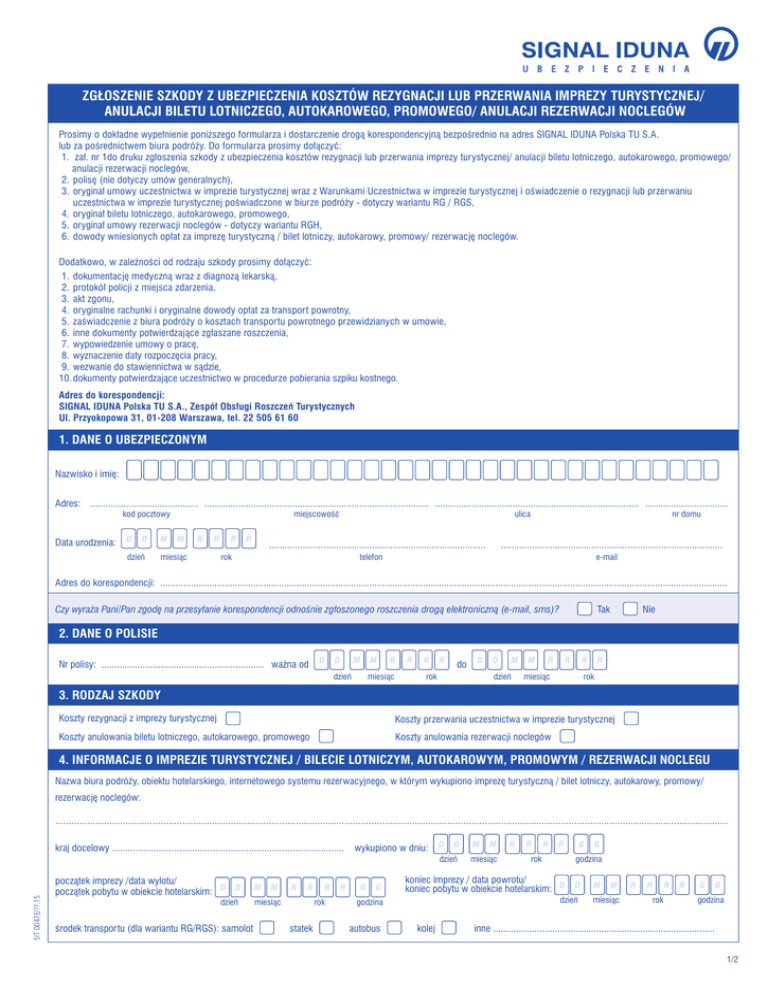ZGŁOSZENIE SZKODY Z UBEZPIECZENIA KOSZTÓW REZYGNACJI LUB PRZERWANIA IMPREZY TURYSTYCZNEJ/ ANULACJI BILETU LOTNICZEGO, AUTOKAROWEGO, PROMOWEGO/ ANULACJI REZERWACJI NOCLEGÓW Prosimy o dokładne wypełnienie poniższego formularza i dostarczenie drogą korespondencyjną bezpośrednio na adres SIGNAL IDUNA Polska TU S.A. lub za pośrednictwem biura podróży. Do formularza prosimy dołączyć: 1. zał. nr 1do druku zgłoszenia szkody z ubezpieczenia kosztów rezygnacji lub przerwania imprezy turystycznej/ anulacji biletu lotniczego, autokarowego, promowego/ anulacji rezerwacji noclegów, 2.polisę (nie dotyczy umów generalnych), 3.oryginał umowy uczestnictwa w imprezie turystycznej wraz z Warunkami Uczestnictwa w imprezie turystycznej i oświadczenie o rezygnacji lub przerwaniu uczestnictwa w imprezie turystycznej poświadczone w biurze podróży - dotyczy wariantu RG / RGS, 4.oryginał biletu lotniczego, autokarowego, promowego, 5.oryginał umowy rezerwacji noclegów - dotyczy wariantu RGH, 6.dowody wniesionych opłat za imprezę turystyczną / bilet lotniczy, autokarowy, promowy/ rezerwację noclegów. Dodatkowo, w zależności od rodzaju szkody prosimy dołączyć: 1.dokumentację medyczną wraz z diagnozą lekarską, 2.protokół policji z miejsca zdarzenia, 3.akt zgonu, 4.oryginalne rachunki i oryginalne dowody opłat za transport powrotny, 5.zaświadczenie z biura podróży o kosztach transportu powrotnego przewidzianych w umowie, 6.inne dokumenty potwierdzające zgłaszane roszczenia, 7.wypowiedzenie umowy o pracę, 8.wyznaczenie daty rozpoczęcia pracy, 9.wezwanie do stawiennictwa w sądzie, 10.dokumenty potwierdzające uczestnictwo w procedurze pobierania szpiku kostnego. Adres do korespondencji: SIGNAL IDUNA Polska TU S.A., Zespół Obsługi Roszczeń Turystycznych Ul. Przyokopowa 31, 01-208 Warszawa, tel. 22 505 61 60 1. DANE O UBEZPIECZONYM Nazwisko i imię: Adres: .......................................... ....................................................................................... ............................................................................... ................................ kod pocztowy Data urodzenia: miejscowość DD MM RRRR dzień miesiąc ulica .................................................................................... rok nr domu ...................................................................................... telefon e-mail Adres do korespondencji: ............................................................................................................................................................................................................................ Tak Czy wyraża Pani/Pan zgodę na przesyłanie korespondencji odnośnie zgłoszonego roszczenia drogą elektroniczną (e-mail, sms)? Nie 2. DANE O POLISIE Nr polisy: ............................................................... ważna od DD MM RRRR dzień miesiąc do rok DD MM RRRR dzień miesiąc rok 3. RODZAJ SZKODY Koszty rezygnacji z imprezy turystycznej Koszty przerwania uczestnictwa w imprezie turystycznej Koszty anulowania biletu lotniczego, autokarowego, promowego Koszty anulowania rezerwacji noclegów 4. INFORMACJE O IMPREZIE TURYSTYCZNEJ / BILECIE LOTNICZYM, AUTOKAROWYM, PROMOWYM / REZERWACJI NOCLEGU Nazwa biura podróży, obiektu hotelarskiego, internetowego systemu rezerwacyjnego, w którym wykupiono imprezę turystyczną / bilet lotniczy, autokarowy, promowy/ rezerwację noclegów: ......................................................................................................................................................................................................................................................... SIT 0047E/??.15 kraj docelowy .......................................................................................... wykupiono w dniu: początek imprezy /data wylotu/ początek pobytu w obiekcie hotelarskim: DD MM RRRR dzień środek transportu (dla wariantu RG/RGS): samolot miesiąc rok statek GG godzina autobus DD MM RRRR dzień miesiąc rok GG godzina koniec imprezy / data powrotu/ koniec pobytu w obiekcie hotelarskim: DD MM RRRR dzień kolej miesiąc rok GG godzina inne ...................................................................................... 1/2 5. P RZYCZYNA REZYGNACJI Z IMPREZY TURYSTYCZNEJ / ANULACJI BILETU LOTNICZEGO, AUTOKAROWEGO, PROMOWEGO/ REZERWACJI NOCLEGU A. nagłe zachorowanie śmierć przedwczesny poród szkoda w mieniu nieszczęśliwy wypadek inne ........................................... B. przy nieszczęśliwych wypadkach podać kto spowodował wypadek: ......................................................................................................................................................... C. data zdarzenia, które doprowadziło do rezygnacji/przerwania uczestnictwa/anulacji biletu lotniczego, autokarowego, promowego /anulacji rezerwacji noclegów: DD MM RRRR dzień miesiąc rok GG godzina D. Data pisemnego zgłoszenia rezygnacji / przerwania uczestnictwa / anulacji biletu lotniczego, autokarowego, promowego w biurze podróży/ obiekcie hotelarskim, internetowym systemie rezerwacyjnym: DD MM RRRR dzień miesiąc rok GG godzina E. Jeżeli zgłoszenie rezygnacji / przerwania uczestnictwa / anulacji biletu lotniczego, autokarowego, promowego / anulacji rezerwacji noclegów nie nastąpiło w ciągu 2 dni od daty zdarzenia, prosimy o podanie powodu: .................................................................................................................................................................................................................................. F. Kogo dotyczy zdarzenie? • Ubezpieczonego? tak nie nazwisko i imię: ................................................................................................................................................................ • Osoby bliskiej nie biorącej udziału w imprezie? tak nie stopień pokrew