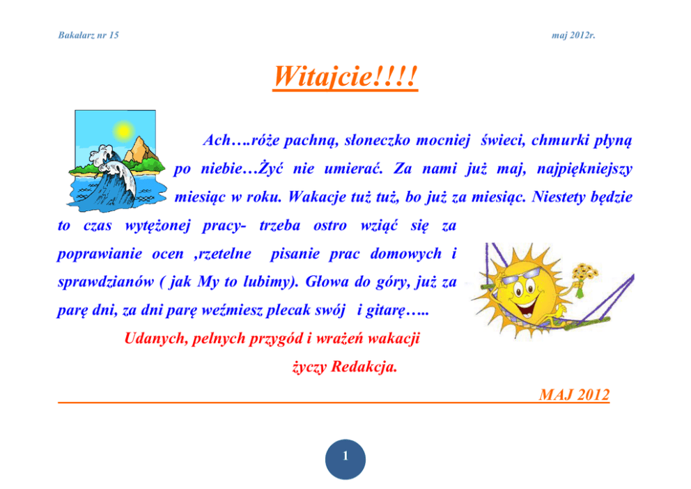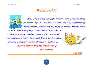 Bakałarz nr 15 maj 2012r. Witajcie!!!! Ach….róże pachną, słoneczko mocniej świeci, chmurki płyną po niebie…Żyć nie umierać. Za nami już maj, najpiękniejszy miesiąc w roku. Wakacje tuż tuż, bo już za miesiąc. Niestety będzie to czas wytężonej pracy- trzeba ostro wziąć się za poprawianie ocen ,rzetelne pisanie prac domowych i sprawdzianów ( jak My to lubimy). Głowa do góry, już za parę dni, za dni parę weźmiesz plecak swój i gitarę….. Udanych, pelnych przygód i wrażeń wakacji życzy Redakcja. MAJ 2012 1 Bakałarz nr 15 maj 2012r. W NUMERZE: 1. Życzenia na Dzień Mamy 2. Bezpiecznie po drodze 3. Szkolne Koło LOP docenione 4. Stop DOPALACZOM 5. KTO ? GDZIE ? KIEDY? 6. Z miłości do muzyki 7. HOROSKOP 8. Sport 2 Bakałarz nr 15 maj 2012r. Zatem wszystkim mamom składamy w tym dniu najserdeczniejsze życzenia, dużo zdowia, radości i uśmiechu na co dzień. DZIEŃ 26 MAJA to święto wszystkich mam i najcieplejsze ze wszystkich świąt w roku. Jest wyrazem miłości, szacunku i podziękowania wobec wszystkich matek. Za tą miłość z Twego serca, Za trud wychowana mnie. W tym Dniu Matki przyjmij proszę, Te życzenia skromne me. Życzę Tobie mamo wprost, Zdrowia i radości moc. Aby miłość Twoja skrycie Ogarniała moje życie. Słowo „mama”, które brzmi podobnie w wielu językach świata, jest tego dnia na ustach wszystkich i to nie tylko dzieci. Twój „urwis” Pamietajmy, że nie tylko w tym dniu każdej mamie należą się kwiatki i płynące z głębi serca słowa, ale też na co dzień. Zaś 26 maja mamy okazję w sposób szczególny i wyjątkowy okazać swoje podziękowania za wszystko co mamy dla nas robią. Dzień Matki to okazja aby podziękować za to, że od rana do późnej nocy martwią się o nas. Stoją przy nas w nocy gdy płaczemy. Są przy nas gdy wołamy o pomoc. Dają nam przyjaźń i miłość najpiękniejszą i najtrwalszą. Matka to najważniejsza osoba w życiu każdego z nas. Dlatego nie zapominajmy o swoich mamach w tym szczególnym dniu. 3 Bakałarz nr 15 maj 2012r. Bezpiecznie po drodze….. przedlekarskiej. Po zaciętej i dość wyrównanej walce szkoły zajęły następujące miejsca: Kat. Szkół Podstawowych : I miejsce Szkoła Podstawowa w Łącku II miejsce Szkoła Podstawowa w Kadczy III miejsce Szkoła Podstawowa w Jazowsku Kat. Gimnazjów : I miejsce Gimnazjum w Jazowsku II miejsce Gimnazjum w Łącku Szkoły, które zajęły I miejsca zakwalifikowały się do etapu powiatowego Turnieju BRD w Nowym Sączu. W rywalizacji indywidualnej świetnie zaprezentował się nasz kolega Jakub Świebocki, który zajął I miejsce. Wszystkie drużyny otrzymały pamiątkowe dyplomy, puchary i medale. Dnia 30.03.2012 r. w naszej szkole odbyły się Gminne Zawody Bezpieczeństwa Ruchu Drogowego. W zawodach wzięli udział uczniowie z trzech szkół podstawowych ( Jazowska, Kadczy i Łącka) oraz dwóch gimnazjów ( Jazowska i Łącka). Uczniowie stanęli do współzawodnictwa w dwóch kategoriach wiekowych: kat. szkół podstawowych i kat. gimnazjów. Rywalizacja przebiegała w dwóch etapach : teoretycznym ( test składający się 25 pytań) - praktycznym – tor przeszkód i udzielanie pomocy przedlekarskiej. Naszą szkołę reprezentowali: J. Świebocki VI, R. Majerski V b, S. Majerski Vb oraz D. Pieruszka IIIA, R. Gromala IIIA, R. Stanisz IIIA. Wszyscy uczniowie biorący udział w zawodach wykazali się wyczerpującą wiedzą teoretyczną z zakresu bezpieczeństwa ruchu drogowego oraz znakomitymi umiejętnościami pokonywania przeszkód na rowerze i udzielania pierwszej pomocy 4 Bakałarz nr 15 maj 2012r. Organizatorami zawodów była Dyrekcja ZSG w Jazowsku wraz z Panią St. Zarembą i Panem M. Hejmejem. Drużyna naszych kolegów z gimnazjum 17 kwietnia wzięła udział w zawodach powiatowych tego konkursu. Chłopcy zajęli VII miejsce. Wszystkim uczestnikom konkursu serdecznie gratulujemy, a wyróżnionym i zwycięzcom życzymy dalszych sukcesów i bezpieczeństwa na drodze!!! 5 Bakałarz nr 15 maj 2012r. Szkolne koło LOP docenione artystyczny, konkurs piosenek o tematyce ekologicznej oraz rozdanie nagród z konkursu fotograficznego. W kwietniu, koleżanki i koledzy ze szkolnego Koła Ligi Ochrony przyrody wzięli udział w konkursie fotograficznym organizowanym przez SK LOP Oddział „Przehyba”. Konkurs pt. „Zwiastuny Wiosny” przeznaczony był głównie dla uczniów gimnazjów z terenu miasta i gminy Piwniczna, Rytro, Stary Sącz i Łącko. Konkurs cieszył się niesamowitym powodzeniem. Do szkolnego opiekuna koła – Pani A. Mamai trafiło wiele ciekawych zdjęć przedstawiających pierwsze oznaki wiosny. Szkolna komisja w składzie: opiekun koła – Pani Aneta oraz Pani J. Koza dokonała przeglądu zdjęć i wyłoniła najciekawsze, które zostały odesłane do Oddziału LOP „Prehyba” i wzięły udział w konkursie powiatowym. Zdjęcia okazały się być na bardzo wysokim poziomie, gdyż nazwiska ich wykonawców znalazły się na liście laureatów konkursu. A oto nasi zwycięzcy: Wszystkim uczestnikom konkursu serdecznie gratulujemy, a zwycięzcom i wyróżnionym życzymy dalszych sukcesów być może w branży fotograficznej. W tym miejscu należy również nadmienić, że szkolne koło LOP jest bardzo prężnie działającym w ty roku. Uczestnicy zajęć biorą udział w różnych konkursach ekologicznych, wycieczkach tematycznych oraz akcjach związanych z ochroną naszego środowiska. Przygotowują i prezentują różnorodne materiały i plakaty informacyjne, dotyczące istotnych dla człowieka zagrożeń współczesnego świata. Oby tak dalej!! A oto nagrodzone zdjęcia!! Karolina Job kl. III D – I miejsce K. Job III D ( I miejsce) Paweł Kałuziński kl. I B – III miejsce Jakub Bieryt kl. I D - wyróżnienie Uczniowie ci mieli również okazję uczestniczyć w Międzynarodowych Obchodach Dnia Ziemi organizowanych przez w/w oddział LOP, które odbyły się 9 maja w starosądeckim kini