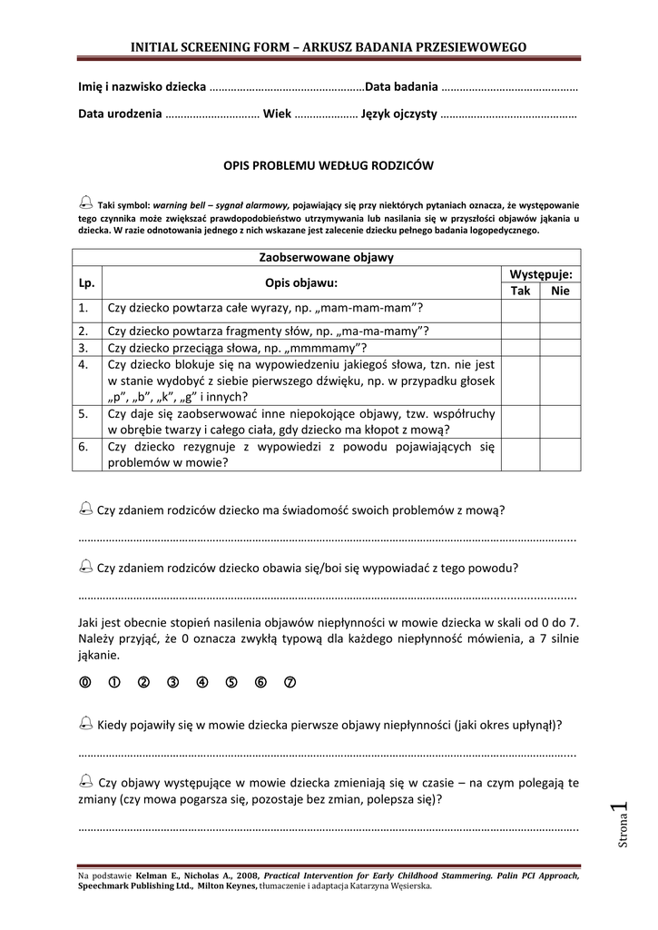 INITIAL SCREENING FORM – ARKUSZ BADANIA PRZESIEWOWEGO Imię i nazwisko dziecka ……………………………………………Data badania ……………………………………… Data urodzenia ……………………….… Wiek ………………… Język ojczysty ……………………………………… OPIS PROBLEMU WEDŁUG RODZICÓW Taki symbol: warning bell – sygnał alarmowy, pojawiający się przy niektórych pytaniach oznacza, że występowanie tego czynnika może zwiększad prawdopodobieostwo utrzymywania lub nasilania się w przyszłości objawów jąkania u dziecka. W razie odnotowania jednego z nich wskazane jest zalecenie dziecku pełnego badania logopedycznego. Zaobserwowane objawy Lp. Opis objawu: 1. Czy dziecko powtarza całe wyrazy, np. „mam-mam-mam”? 2. 3. 4. Czy dziecko powtarza fragmenty słów, np. „ma-ma-mamy”? Czy dziecko przeciąga słowa, np. „mmmmamy”? Czy dziecko blokuje się na wypowiedzeniu jakiegoś słowa, tzn. nie jest w stanie wydobyd z siebie pierwszego dźwięku, np. w przypadku głosek „p”, „b”, „k”, „g” i innych? Czy daje się zaobserwowad inne niepokojące objawy, tzw. współruchy w obrębie twarzy i całego ciała, gdy dziecko ma kłopot z mową? Czy dziecko rezygnuje z wypowiedzi z powodu pojawiających się problemów w mowie? 5. 6. Występuje: Tak Nie Czy zdaniem rodziców dziecko ma świadomośd swoich problemów z mową? …………………………………………………………………………………………………………………………………………….... Czy zdaniem rodziców dziecko obawia się/boi się wypowiadad z tego powodu? ……………………………………………………………………………………………………………………….......................... Jaki jest obecnie stopieo nasilenia objawów niepłynności w mowie dziecka w skali od 0 do 7. Należy przyjąd, że 0 oznacza zwykłą typową dla każdego niepłynnośd mówienia, a 7 silnie jąkanie. Kiedy pojawiły się w mowie dziecka pierwsze objawy niepłynności (jaki okres upłynął)? …………………………………………………………………………………………………………………………………………….... ……………………………………………………………………………………………………………………………………………….. Na podstawie Kelman E., Nicholas A., 2008, Practical Intervention for Early Childhood Stammering. Palin PCI Approach, Speechmark Publishing Ltd., Milton Keynes, tłumaczenie i adaptacja Katarzyna Węsierska. Strona zmiany (czy mowa pogarsza się, pozostaje bez zmian, polepsza się)? 1 Czy objawy występujące w mowie dziecka zmieniają się w czasie – na czym polegają te INITIAL SCREENING FORM – ARKUSZ BADANIA PRZESIEWOWEGO W jakich okolicznościach mowa dziecka polepsza się, a kiedy się pogarsza? …………………………………………………………………………………………………………………………………………….... Jaki jest obecnie poziom obaw (lęku) rodziców związany z niepłynnością w mowie dziecka w skali od 0 do 7. Należy przyjąd, że 0 oznacza, że występujące objawy zupełnie nie niepokoją rodziców, a 7 bardzo silnie zaniepokojenie. Jeśli dziecko ma problem z mową – występują objawy niepłynności, jakich sposobów używają rodzice, by mu pomóc, tzn. co mówią i co robią? ……………………………………………………………………………………………………………………………………………….. ……………………………………………………………………………………………………………………………………………….. HISTORIA JĄKANIA W RODZINIE DZIECKA Lp. Czy poniższa sytuacja dotyczy Pana/Pani: 1. Czy jąkał/a się Pan/Pani w jakimkolwiek okresie swojego życia? Czy objawy jąkania nadal występują w Pana/Pani mowie? Czy w Pana/Pani rodzinie jest osoba, która jąkała się w 2. 3. 4. Ojca Matki jakimkolwiek okresie swojego życia? Czy ta osoba jąka się nadal? INNE ZAGADNIENIA DOTYCZĄCE MOWY I JĘZYKA DZIECKA Czy dziecko ma obecnie jakiekolwiek problemy związane z nabywaniem mowy, poprawną wymową i posługiwaniem się językiem (w tym z rozumieniem mowy innych)? …………………………………………………………………………………………………………………………………………….... Czy w zakresie mowy i języka umiejętności dziecka przewyższają to, co prezentują inne dzieci w jego wieku w tym obszarze? ……………………………………………………………………………………………………………………….......................... Inne zagadnienia dotyczące dziecka, o których logopeda, zdaniem rodziców, powinien zostad poinformowany: ……………………………………………………………………………………………………………………………………………….. konsultacja/porada i monitoring pełne badanie logopedyczne Na podstawie Kelman E., Nicholas A., 2008, Practical Intervention for Early Childhood Stammering. Palin PCI Approach, Speechmark Publishing Ltd., Milton Keynes, tłumaczenie i adaptacja Katarzyna Węsierska. Strona 2 Decyzja o dalszym postępowaniu logopedycznym:
