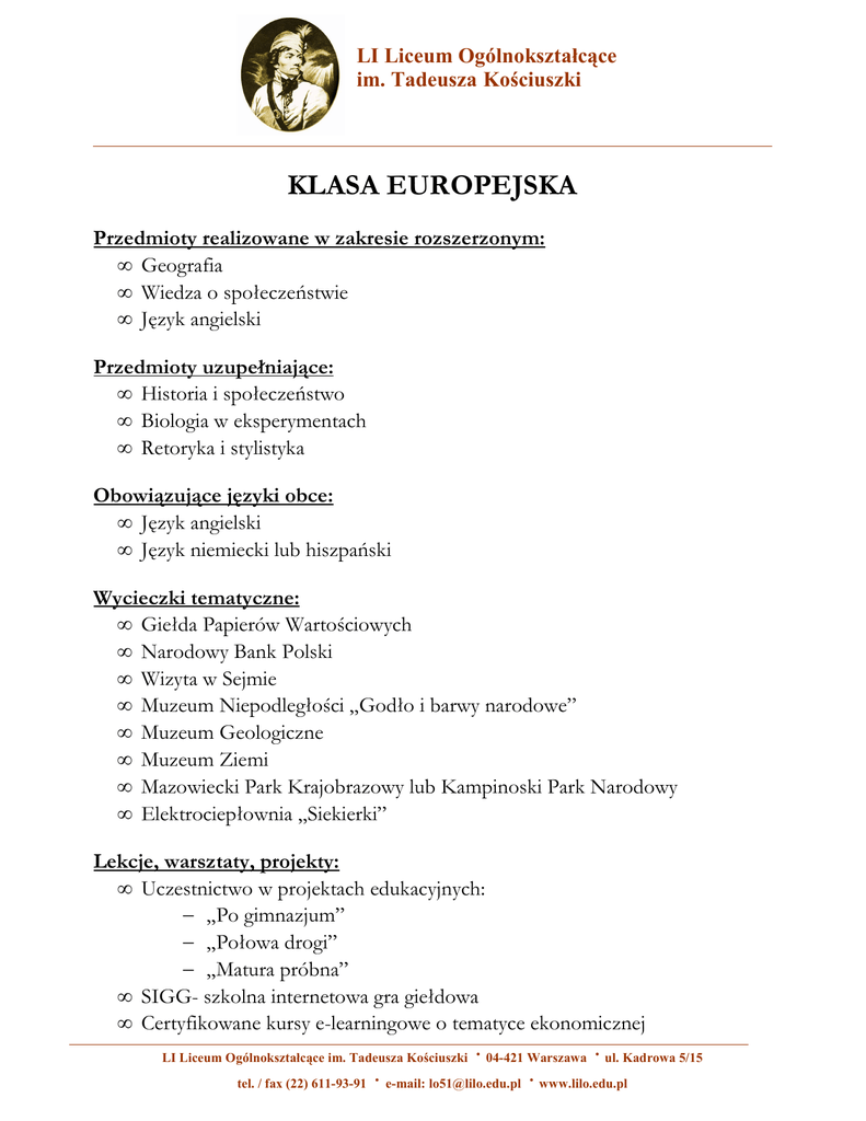 LI Liceum Ogólnokształcące im. Tadeusza Kościuszki KLASA EUROPEJSKA Przedmioty realizowane w zakresie rozszerzonym: • Geografia • Wiedza o społeczeństwie • Język angielski Przedmioty uzupełniające: • Historia i społeczeństwo • Biologia w eksperymentach • Retoryka i stylistyka Obowiązujące języki obce: • Język angielski • Język niemiecki lub hiszpański Wycieczki tematyczne: • Giełda Papierów Wartościowych • Narodowy Bank Polski • Wizyta w Sejmie • Muzeum Niepodległości „Godło i barwy narodowe” • Muzeum Geologiczne • Muzeum Ziemi • Mazowiecki Park Krajobrazowy lub Kampinoski Park Narodowy • Elektrociepłownia „Siekierki” Lekcje, warsztaty, projekty: • Uczestnictwo w projektach edukacyjnych: − „Po gimnazjum” − „Połowa drogi” − „Matura próbna” • SIGG- szkolna internetowa gra giełdowa • Certyfikowane kursy e-learningowe o tematyce ekonomicznej · 04-421 Warszawa · ul. Kadrowa 5/15 tel. / fax (22) 611-93-91 · e-mail: [email protected] · www.lilo.edu.pl LI Liceum Ogólnokształcące im. Tadeusza Kościuszki LI Liceum Ogólnokształcące im. Tadeusza Kościuszki • „ Aktywni na rynku pracy” - warsztaty w ramach współpracy z Urzędem dzielnicy Rembertów • Warsztaty samorządowe • Spotkanie z prawnikiem • Projekt „Polska na tle Unii Europejskiej” • Projekt „Nauka Bez Granic” - warsztaty językowe • „Euroklub” przygotowujący do wymiany młodzieŜy Współpraca z wyŜszymi uczelniami - udział w warsztatach i wykładach: • Uniwersytet Kardynała Stefana Wyszyńskiego • Uniwersytet Warszawski • Szkoła Główna Handlowa • Szkoła Główna Gospodarstwa Wiejskiego • Akademia Leona Koźmińskiego • Akademia Pedagogiki Specjalnej im. M. Grzegorzewskiej Inne: • Klasowa wycieczka integracyjna – wrzesień/październik • Gra przestrzenno – terenowa „Kościuszkowo” poświęcona Ŝyciu i działalności Tadeusza Kościuszki • Ogólnopolski Konkurs Języka Angielskiego English High Flier; • Olimpiady językowe i przedmiotowe • Konkursy językowe i przedmiotowe organizowane przez szkołę, zaprzyjaźnione instytucje i m. st. Warszawa • Koła naukowe • Warszawska Olimpiada MłodzieŜy organizowana przez Szkolny Związek Sportowy • Targi edukacyjne Propagujemy aktywne metody pracy w małych grupach ze szczególnym uwzględnieniem metody projektu, debaty, e-learningu. · 04-421 Warszawa · ul. Kadrowa 5/15 tel. / fax (22) 611-93-91 · e-mail: [email protected] · www.lilo.edu.pl LI Liceum Ogólnokształcące im. Tadeusza Kościuszki